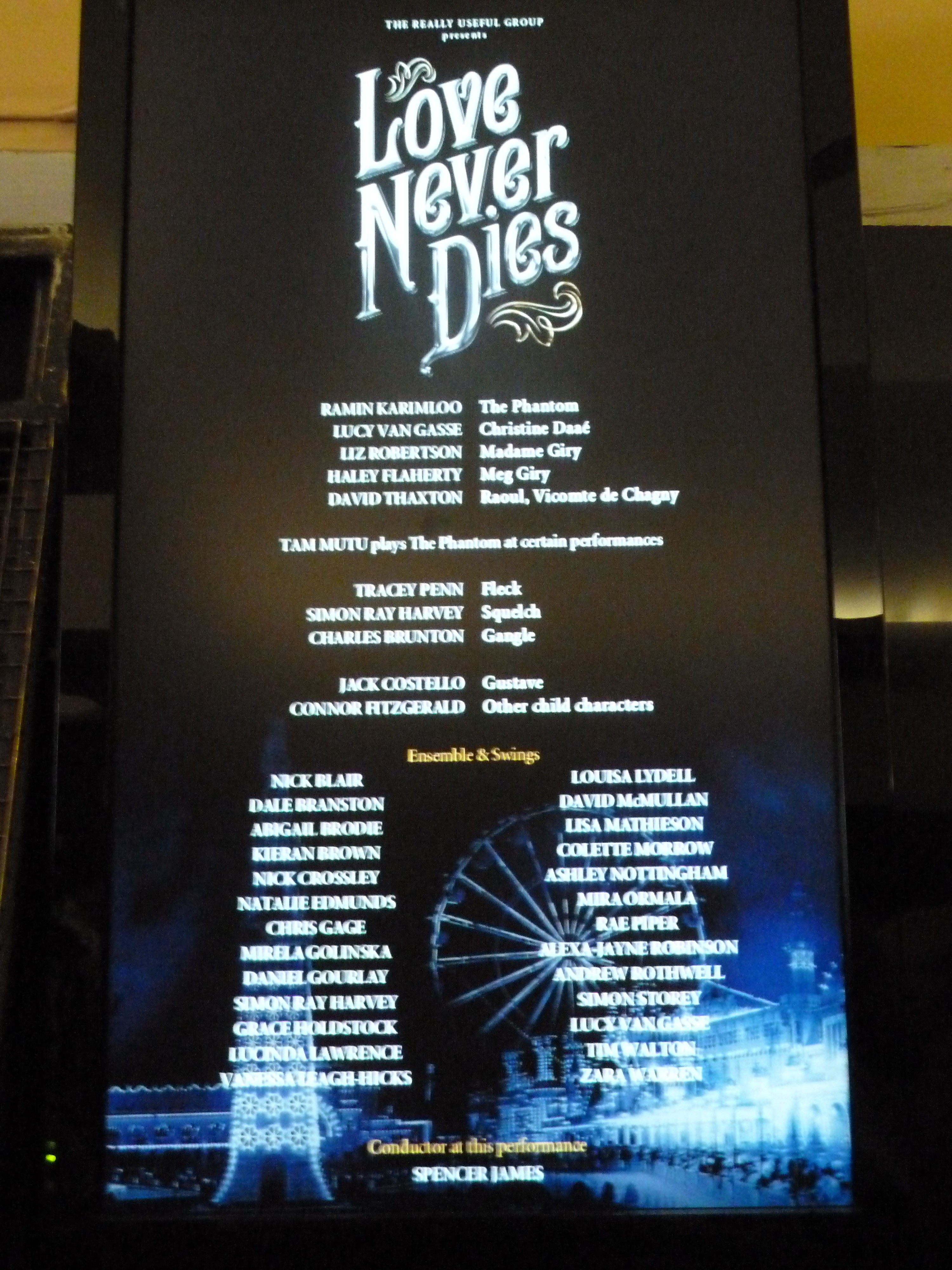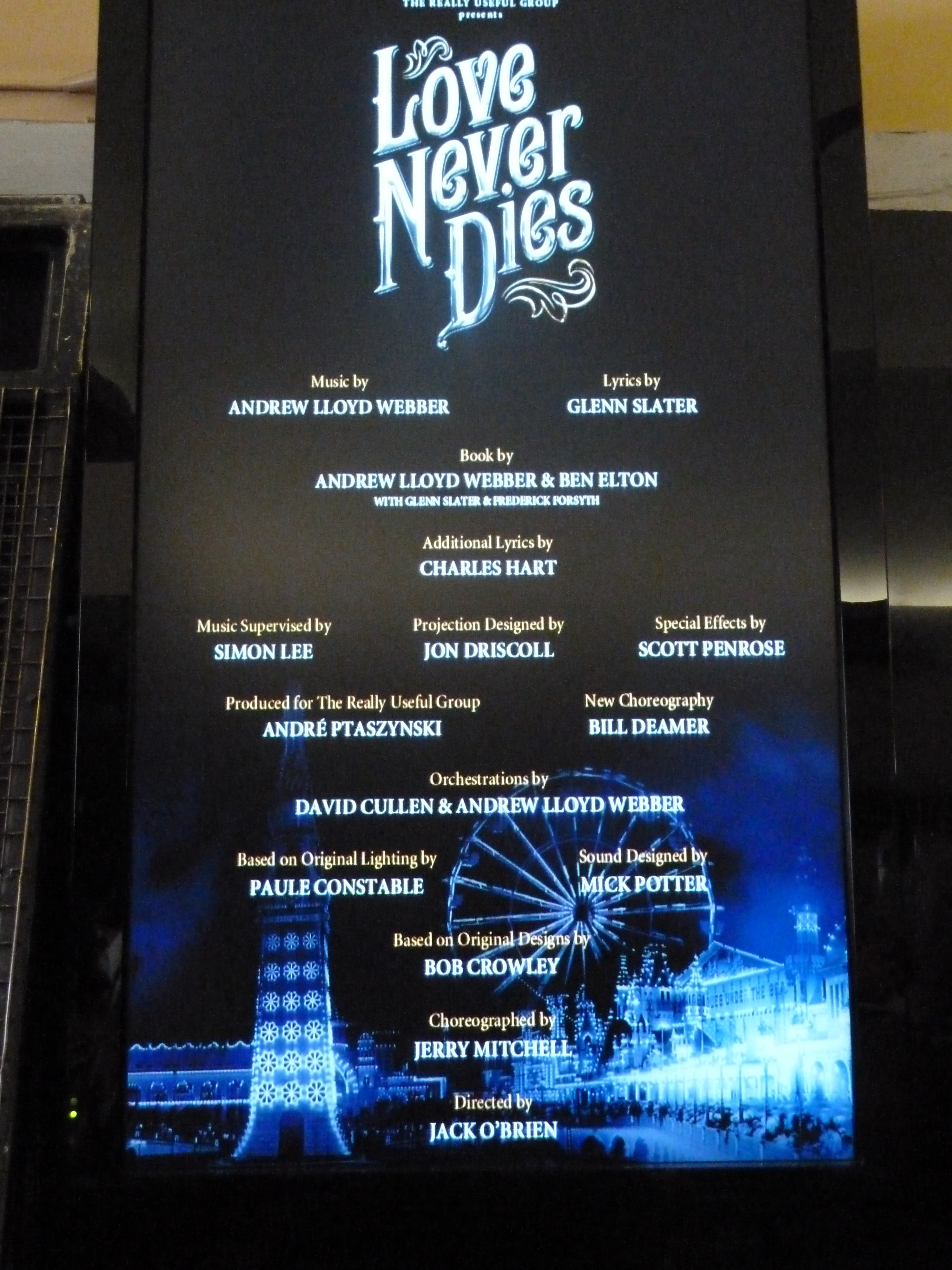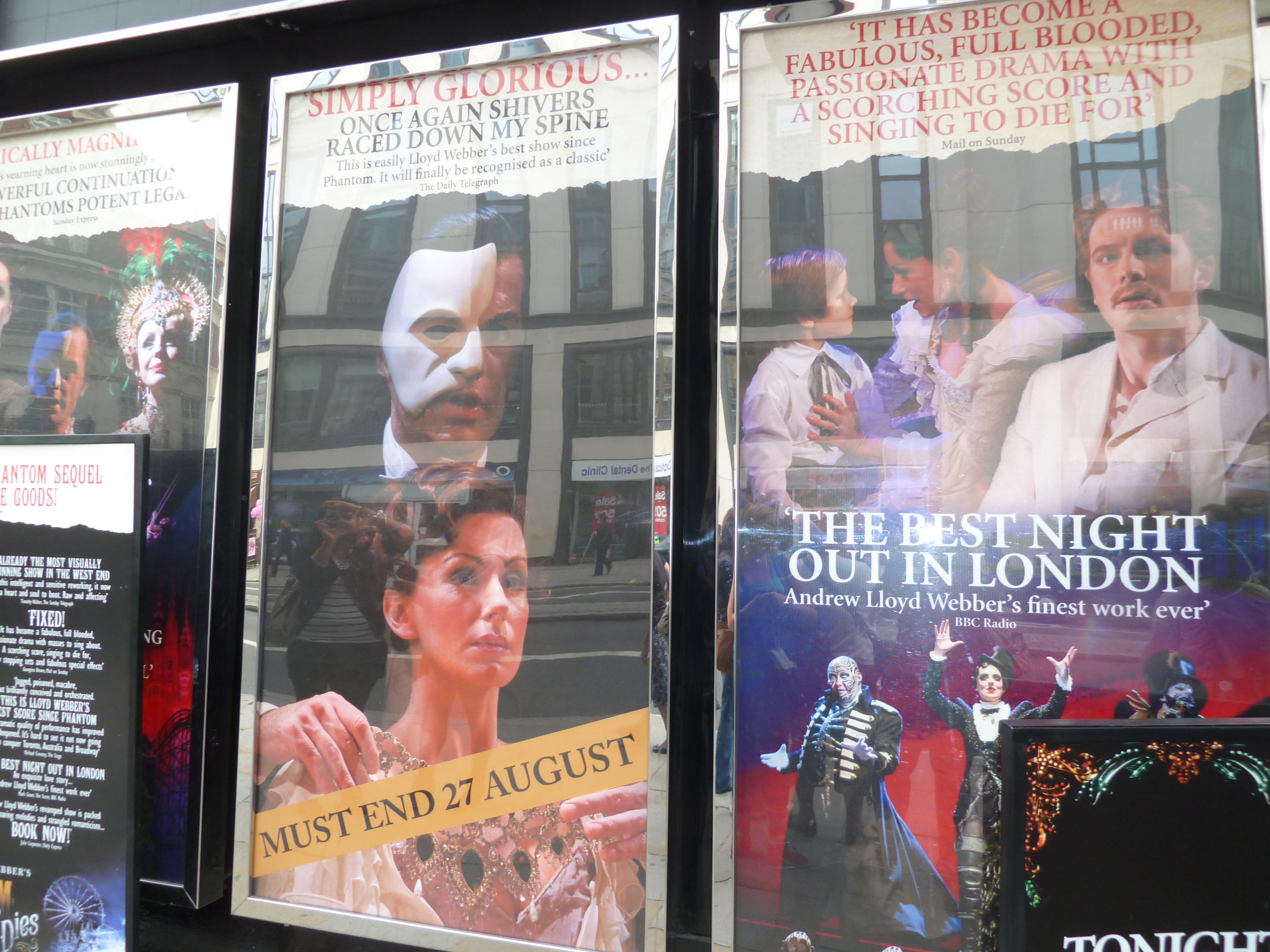 Jag gillar verkligen Love never dies och jag förstår inte riktigt att varför den inte fått mer publik. Men tyvärr som det står på affischerna utanför Adelphi Theater ”Must end 27 August”. Jag hade gärna sett den i vår igen. Matiné med Peter Jöback som Phantom i Phantom of the opera och sen Love never dies på kvällen. Men tyvärr blir det inte så.