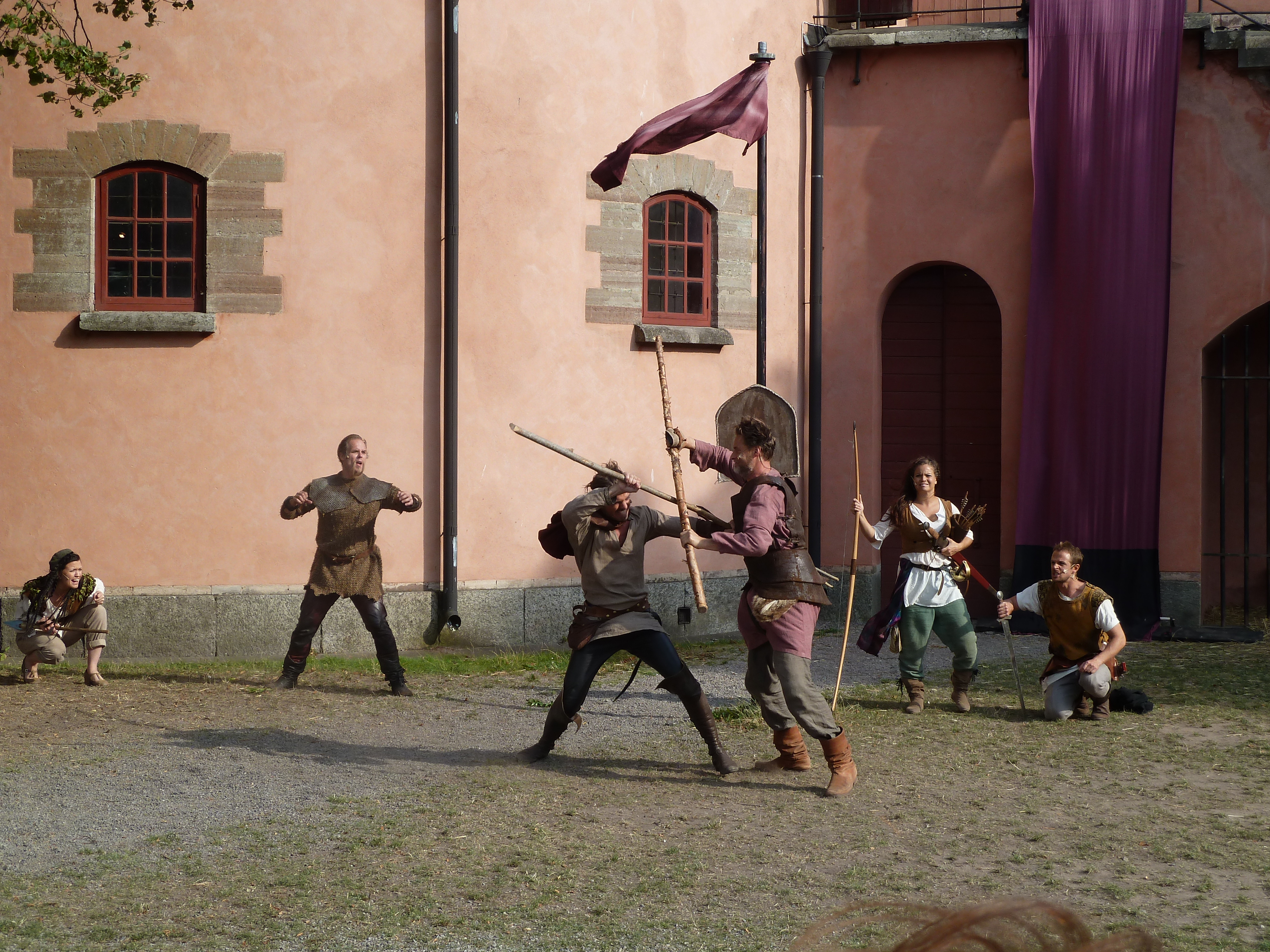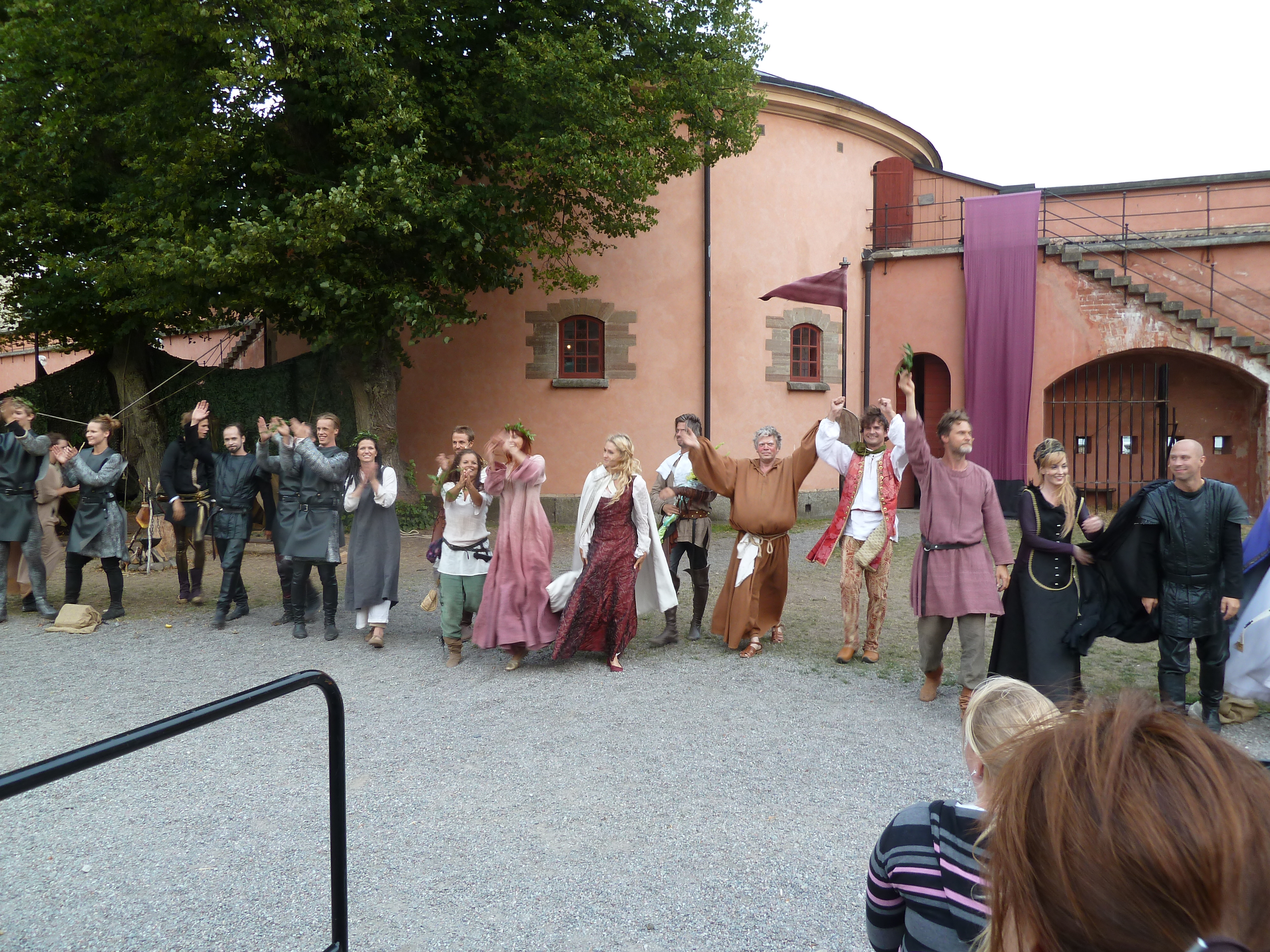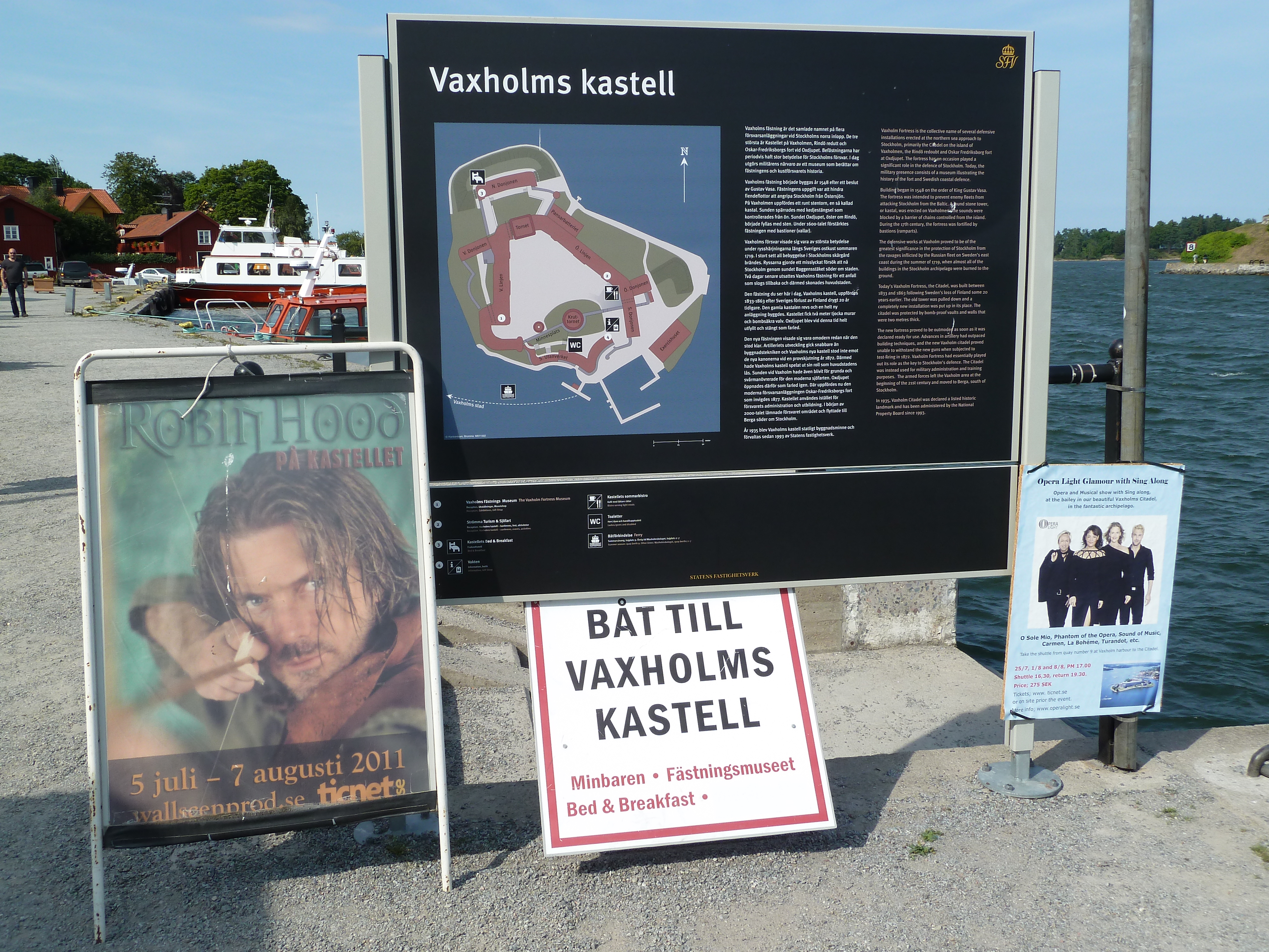 Idag bar det iväg till Waxholms Kastell med Ann-Marie för att titta på Robin Hood med bl a Jakob Stadell. Väderprognoserna hade visat på risk för regn, men ju närmare vi kom Waxholm desto blåare blev himlen. Efter lite letande efter parkering hittade vi en plats vid kyrkan där det precis varit ett bröllop och gästerna var ute på kyrkogården i sina bästa sommarkläder. Det var riktitgt varmt och skönt i Waxholm och vi tittade runt lite innan vi handlade varsin tunnbrödsrulle nere vid hamnen. En enkel lunch men med en av våra största hockeylegender i kön bakom oss så fick även tunnbrödsrullen lite stjärnglans på sig. Vi tog 16 båten ut till Kastellet i sällskap med ett par från ensamblen. När vi kom fram orienterade vi oss lite och fick informationen om att insläppet var 16.50, dvs 10 minuter innan det skulle börja. Så vi hade god tid på oss att titta på alla kanoner och beundra utsikten.
