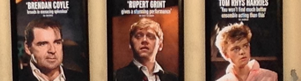 Mojo utspelar sig på en klubb där man lanserat en ny stjärna, typ Elvis, och det är på den tiden då agenter börjat inse att det finns pengar att tjäna och att man gör vad som helst för att få en del av kakan. Det är mycket pillerätande, f….ord hela tiden och en råare ton än man är van vid. En hel del våld också, så inget för barn som gillar Harry Potter. Rubert spelar Sweets, en rätt osäker kille och man ser en del Ron i honom. Men han gör en bra prestation. Brendan Coyles rollfigur är inte lika sympatisk som mr Bates utan en slipad man. De ande fyr killarna gör också bra rolltolkningar. Det är en del råaskämt och med deras dialekter är det ibland lite svårt att höra när man inte är van. Men inte så farligt så man missar handlingen. Även här rätt enkel scenografi, men det byggs om några gånger och då släcks det ner i salongen och rätt hård musik spelas, men den passar bra in i handlingen. Det är en rå historia som speglar den tuffa jargongen mellan killar, men inte för att förhärliga utan för att visa vilka konsekvenser det kan få. Ett par kornblå byxor spelar en stor roll i det hela.