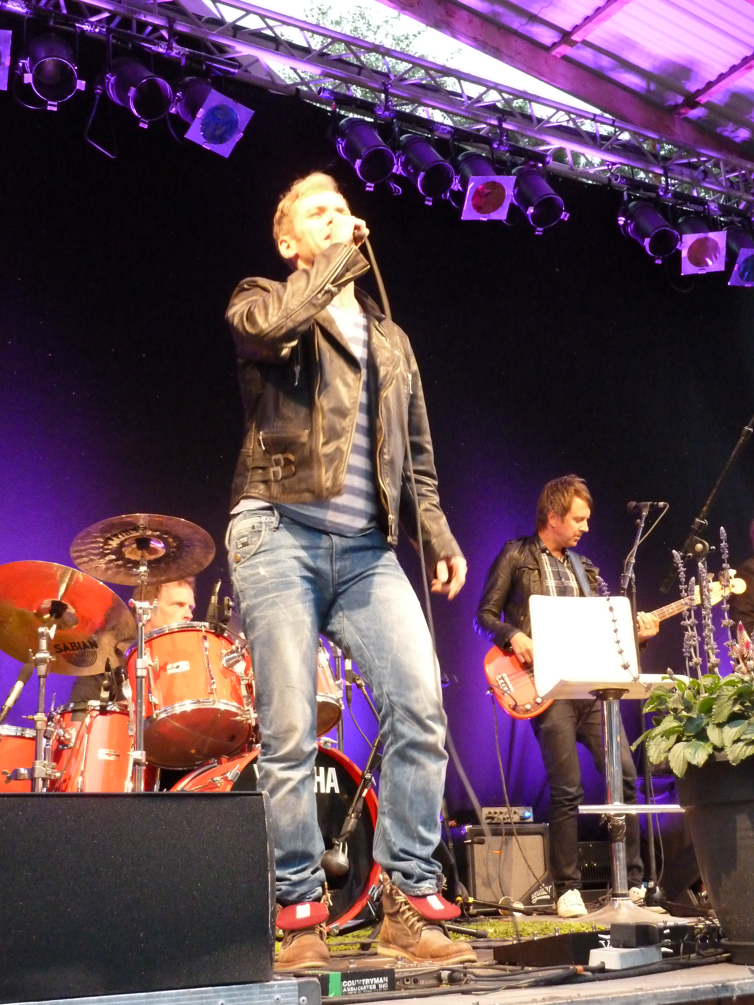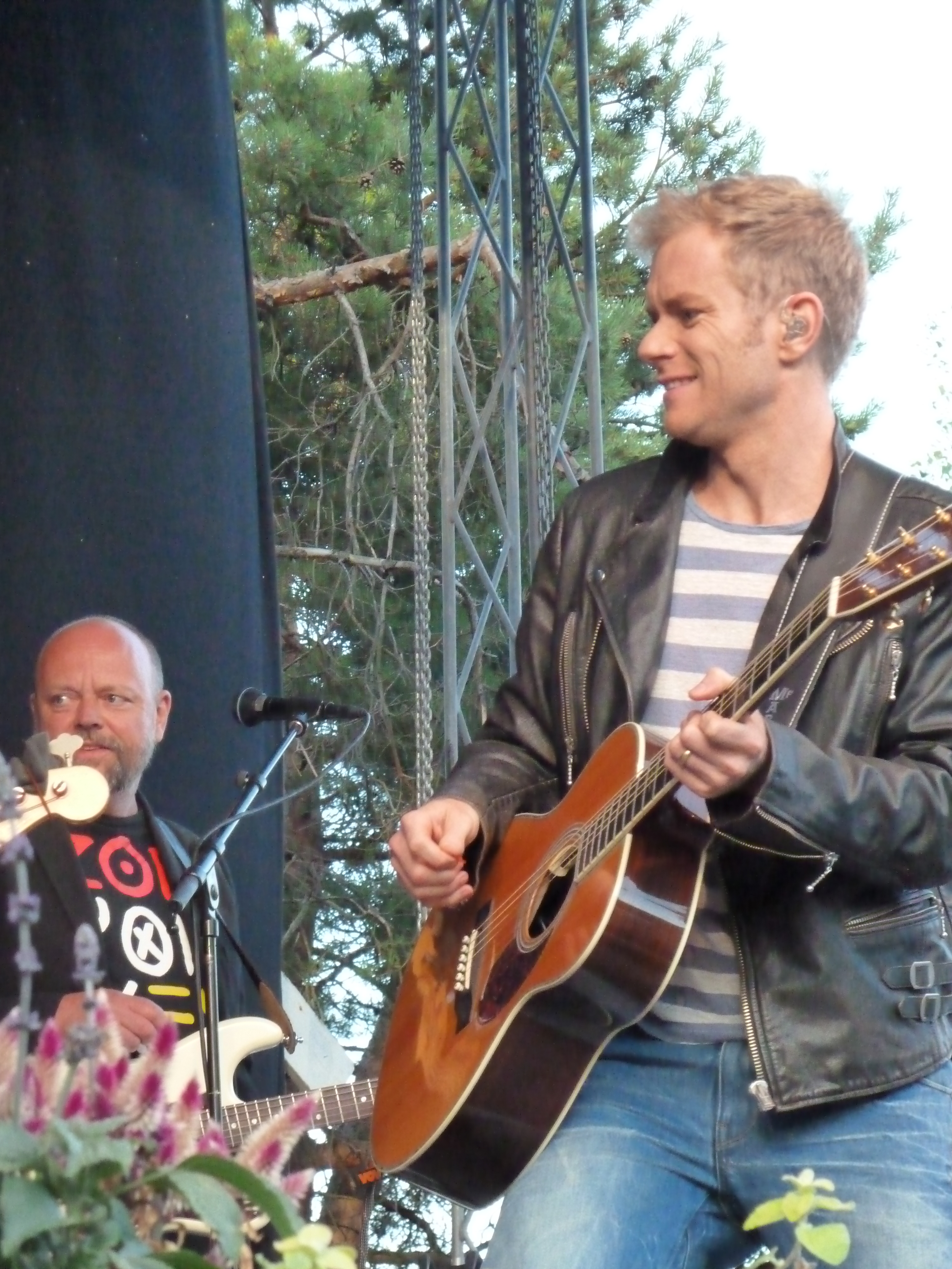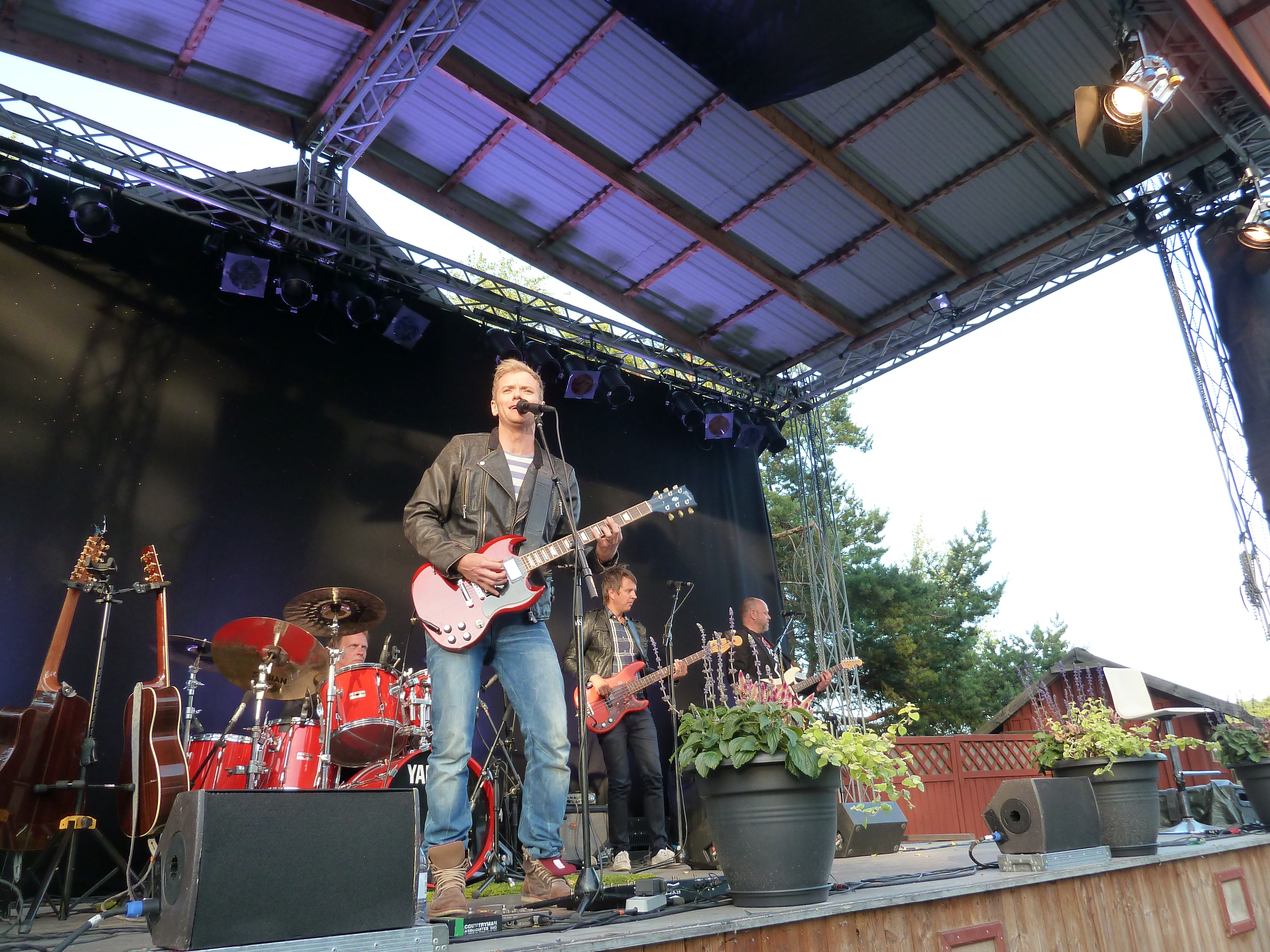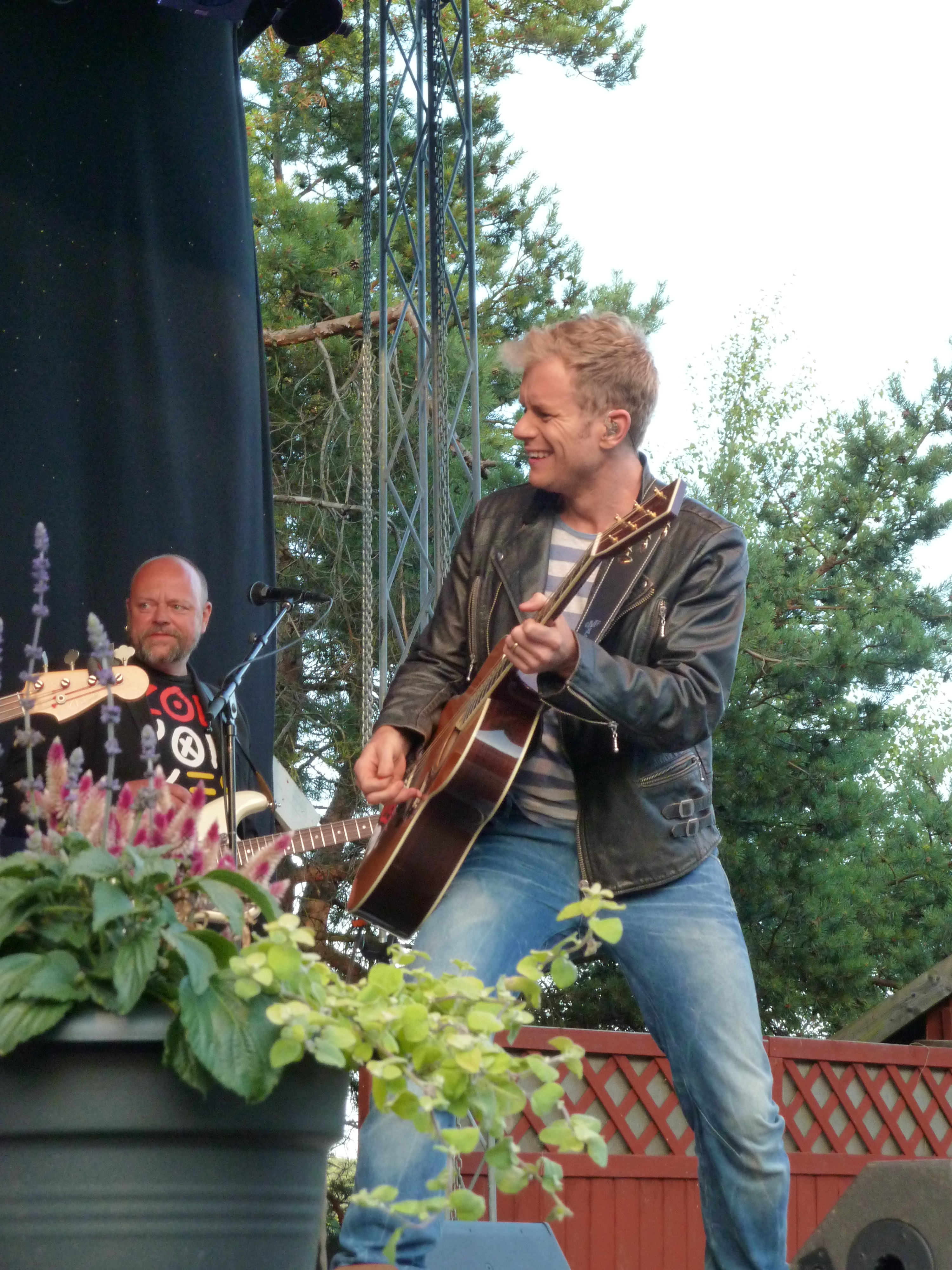 Så drar konserten igång och självklart bjuds det på den ena Queenlåten efter den andra för det är ju en rockkväll som Peter lovat. Och efter att ha spelat huvudrollen i We will rock you i London i fem år så är han suverän på att sjunga Queen. Även om det är covers så på något sätt så gör han dem till sina egna. Men det är inte bara rock han och covers han bjuder på utan även ett par egen svenska låtar som verkligen känns som svensk sommar och med stänka av Sankt Anna, där Peter kommer ifrån. Och ännu mer sommar och svenskt blir det med Ted Gärdestads, Sol vind och vatten. Även om Peter nu gör om texten lite och duvorna ruvar på grusplanen…. vilket han själv inser och skrattande berättar att han har lite problem med den texten och att när det gäller texter så hittar man gärna på lite eget när man inte kommer ihåg. Det är lite strul med ljudet i början men även det fixar han på ett bra sätt. För att inte tala om när han ska ge sig på lite häftiga rocker moves och snurra runt mikrofonen i sladden och micken flyger iväg. Och så slänger han vattenflaskorna runt sig för att vara lite mer Rockn’ roll. Det är så härligt att se vilken självinsikt han har! Även om han har en röst som slår många tuffare rockkillar så är han inte den typen, utan en urtrevlig östgöte med fantastisk röst!