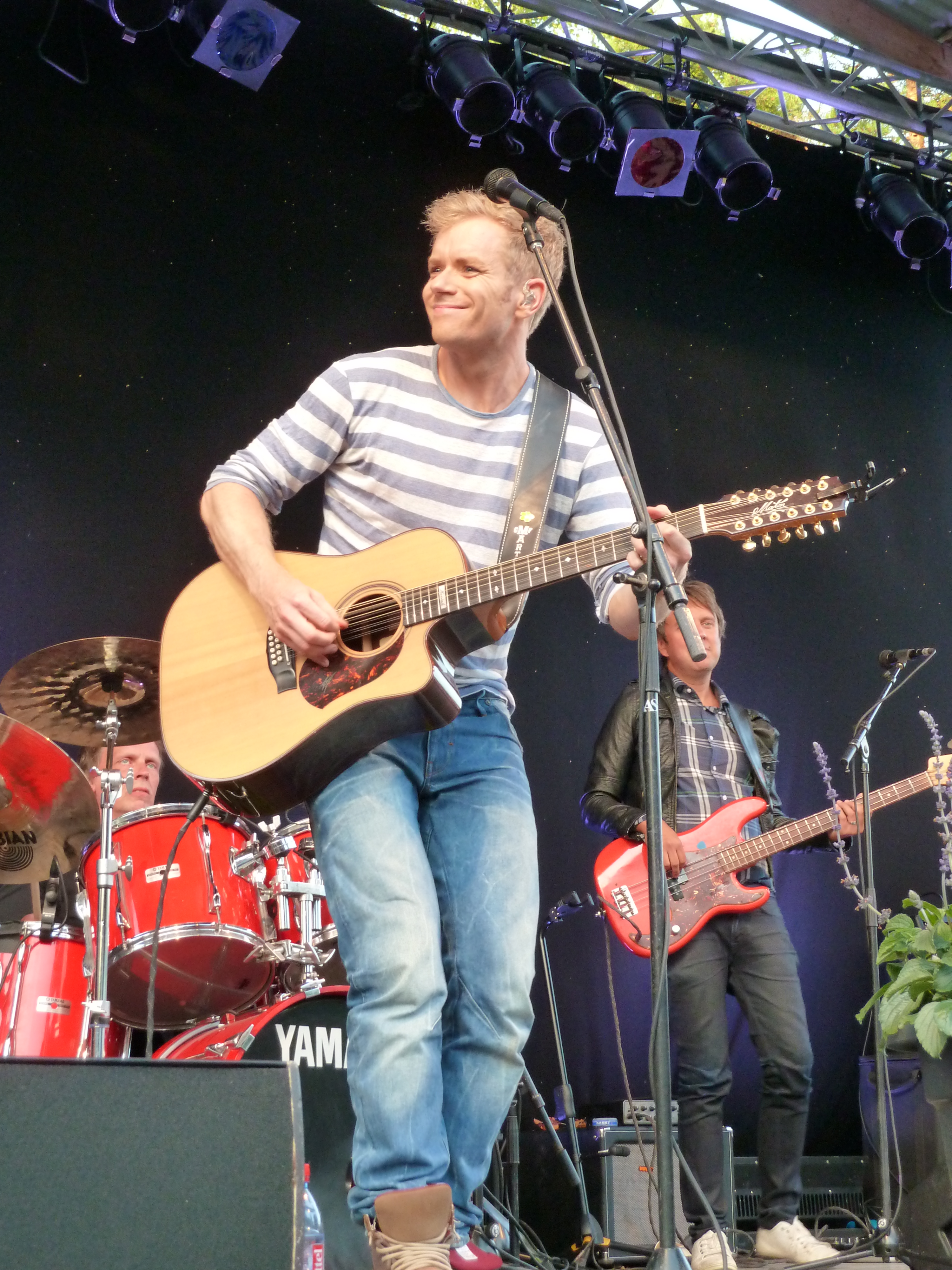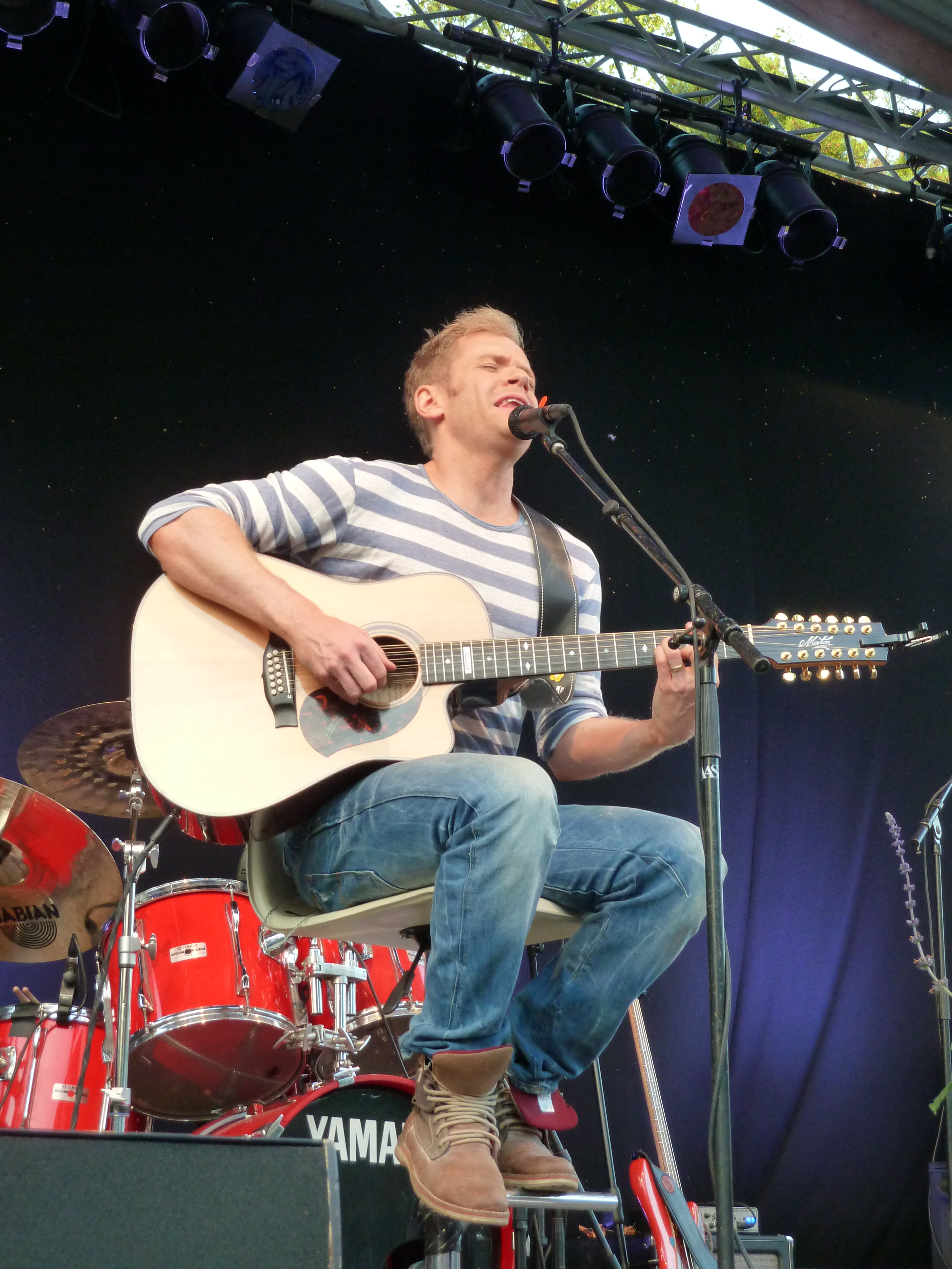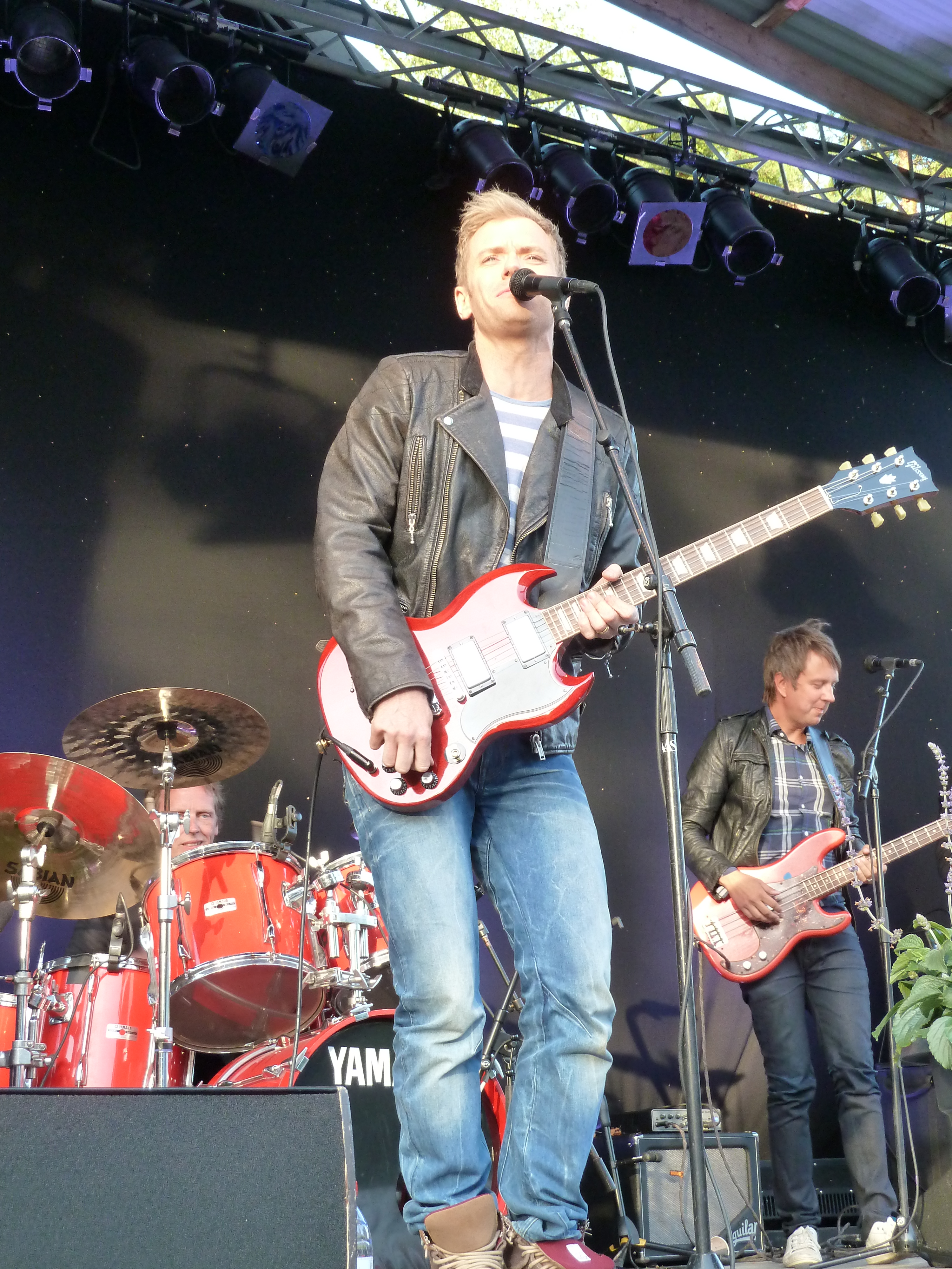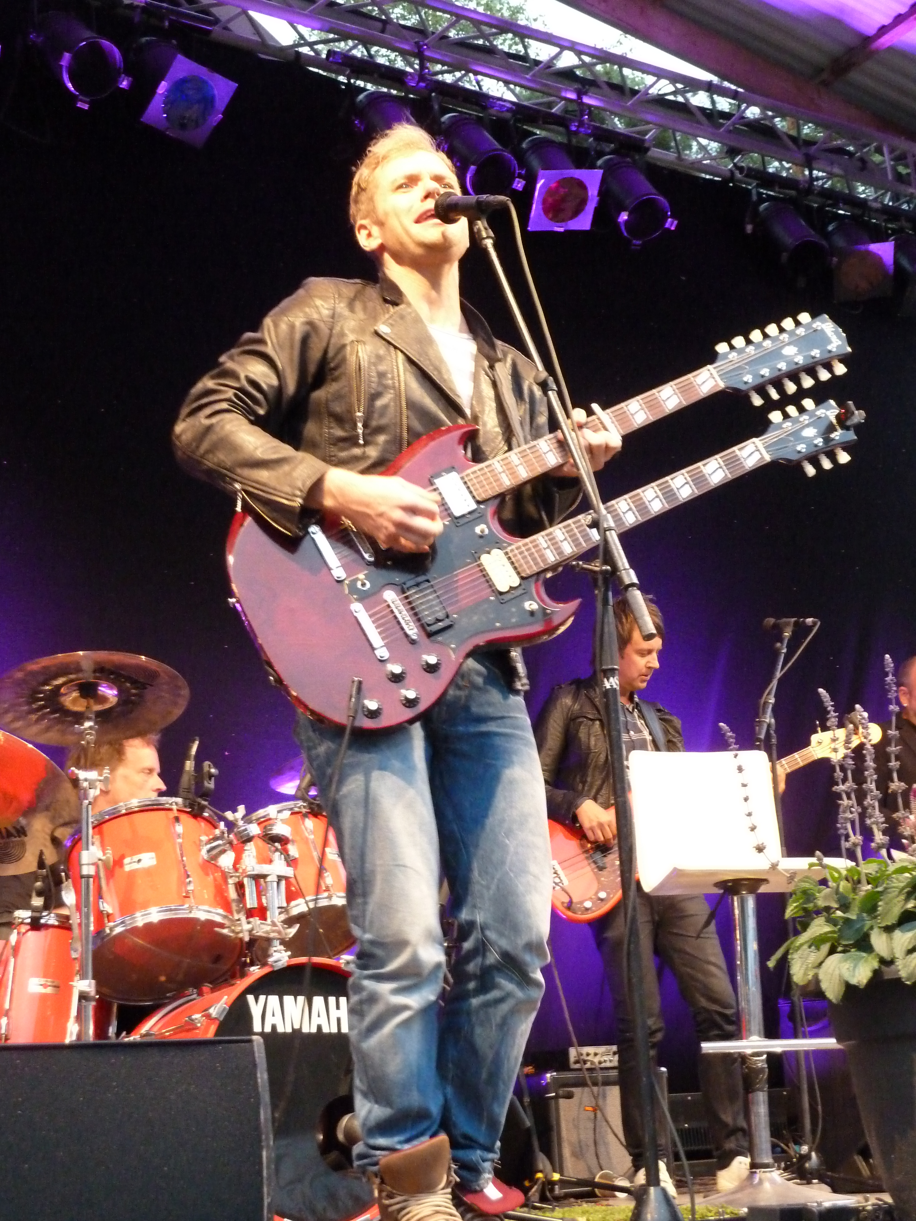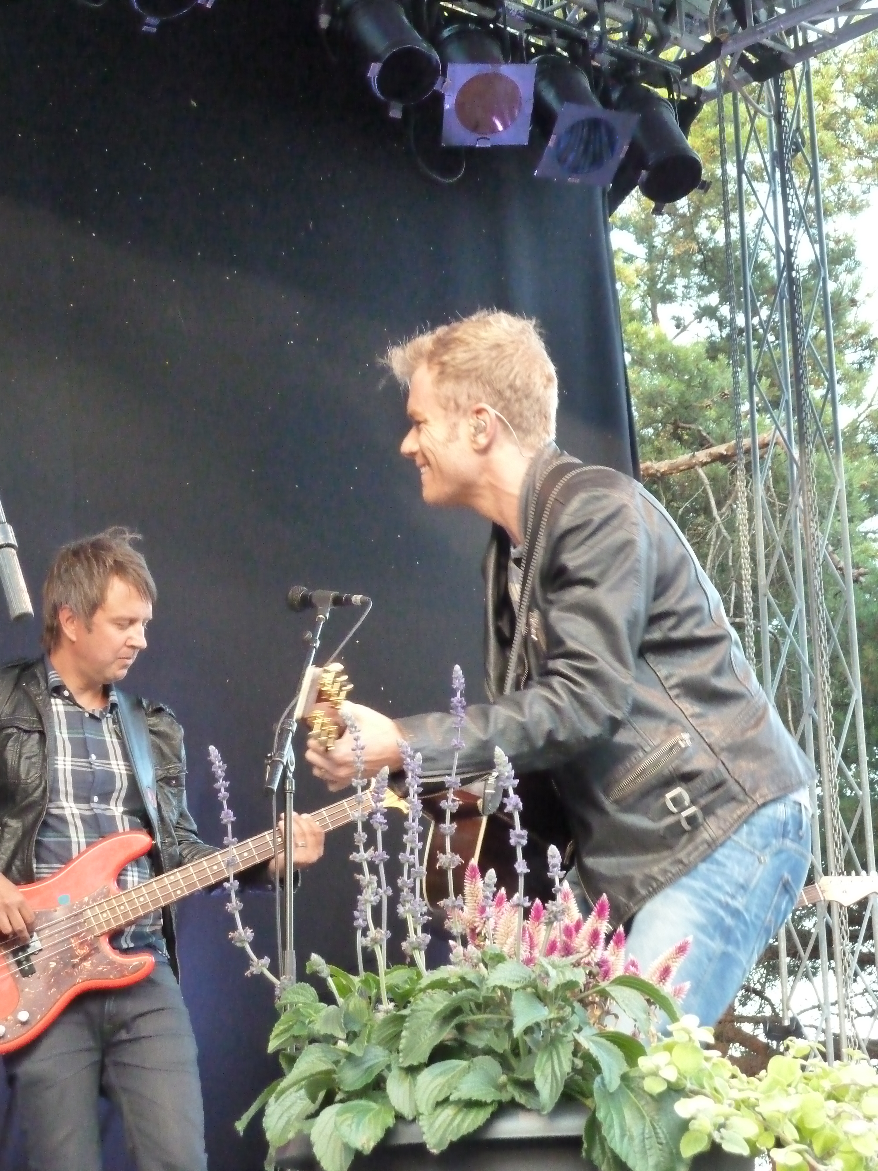 Så drar konserten igång och självklart bjuds det på den ena Queenlåten efter den andra för det är ju en rockkväll som Peter lovat. Och efter att ha spelat huvudrollen i We will rock you i London i fem år så är han suverän på att sjunga Queen. Även om det är covers så på något sätt så gör han dem till sina egna. Men det är inte bara rock han och covers han bjuder på utan även ett par egen svenska låtar som verkligen känns som svensk sommar och med stänka av Sankt Anna, där Peter kommer ifrån. Och ännu mer sommar och svenskt blir det med Ted Gärdestads, Sol vind och vatten. Även om Peter nu gör om texten lite och duvorna ruvar på grusplanen…. vilket han själv inser och skrattande berättar att han har lite problem med den texten och att när det gäller texter så hittar man gärna på lite eget när man inte kommer ihåg. Det är lite strul med ljudet i början men även det fixar han på ett bra sätt. För att inte tala om när han ska ge sig på lite häftiga rocker moves och snurra runt mikrofonen i sladden och micken flyger iväg. Och så slänger han vattenflaskorna runt sig för att vara lite mer Rockn’ roll. Det är så härligt att se vilken självinsikt han har! Även om han har en röst som slår många tuffare rockkillar så är han inte den typen, utan en urtrevlig östgöte med fantastisk röst!