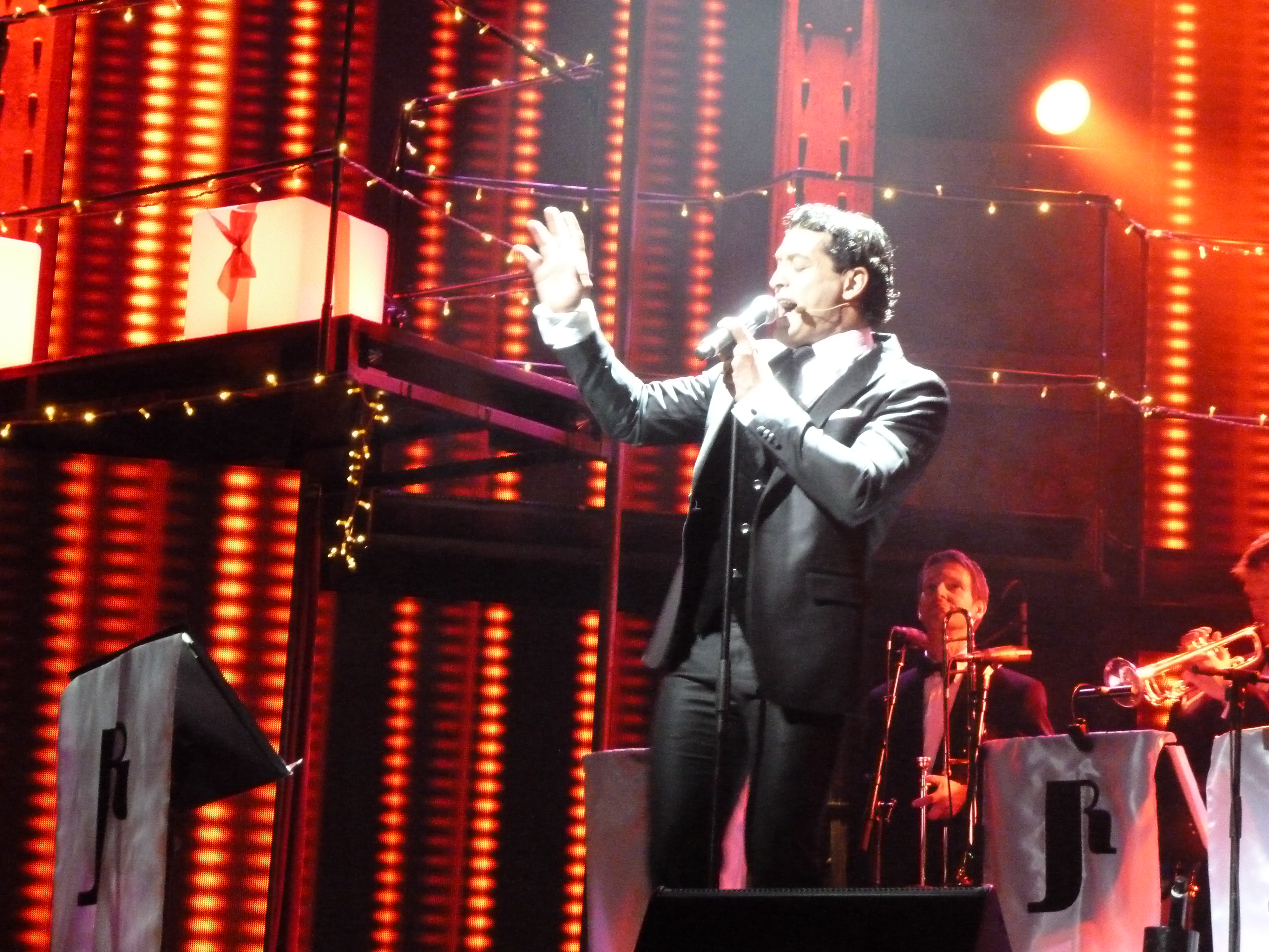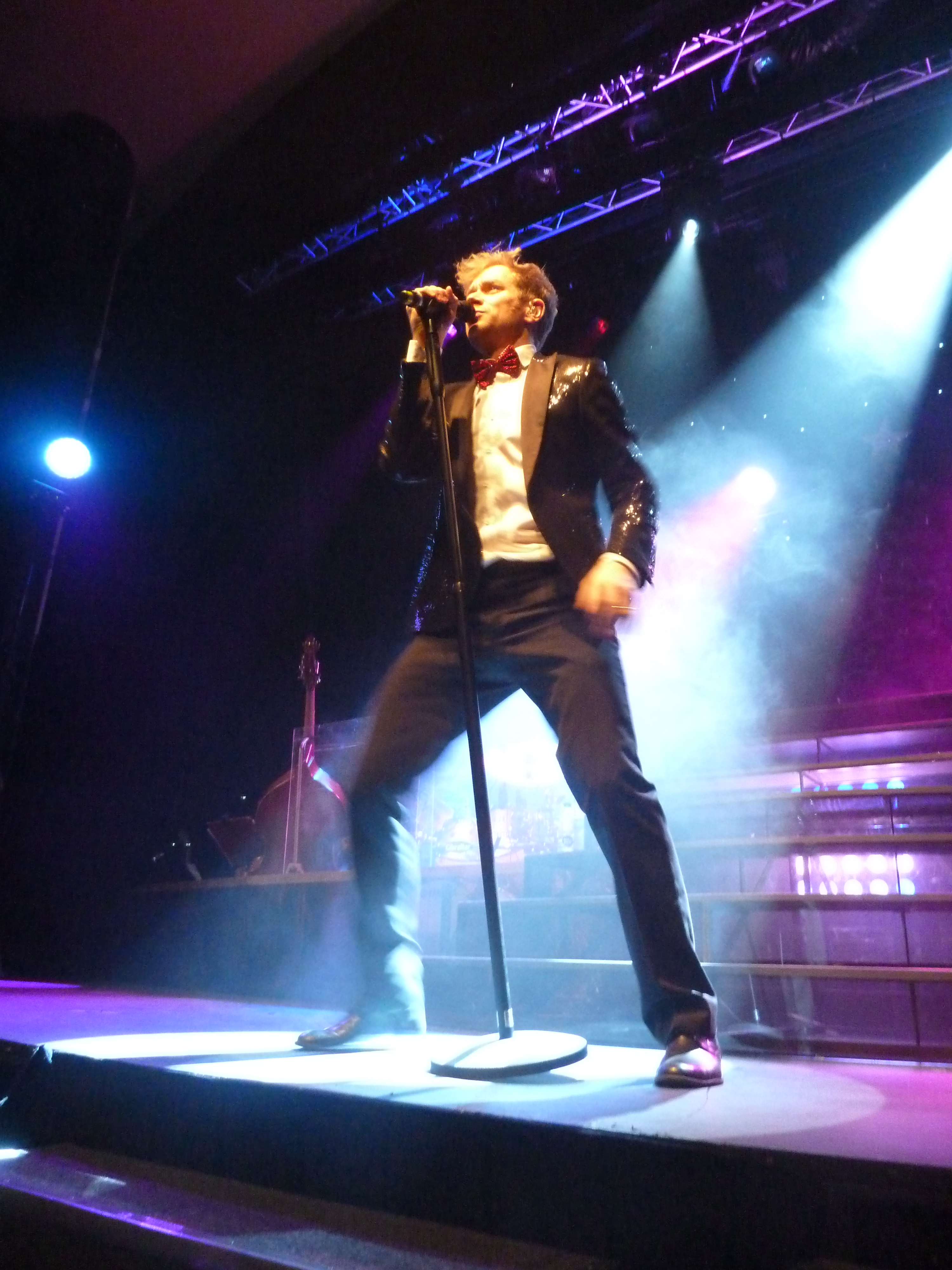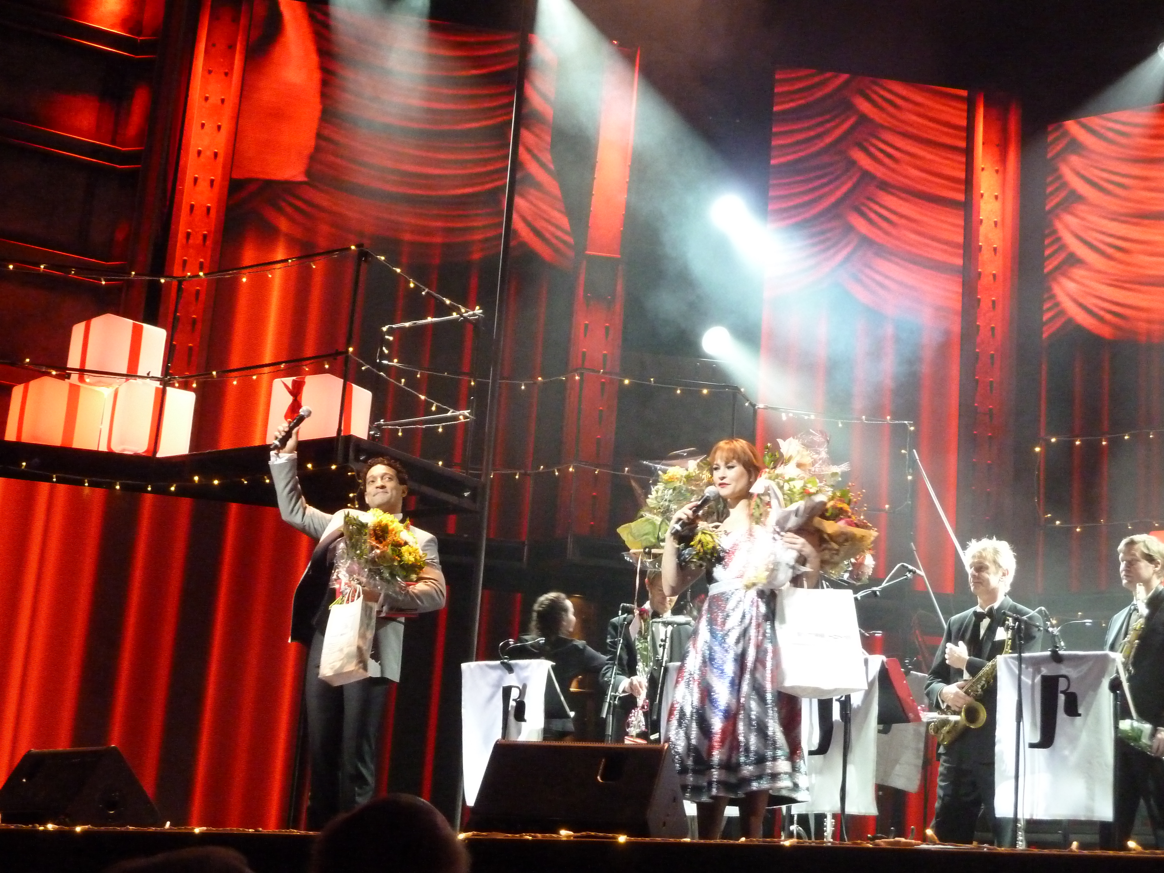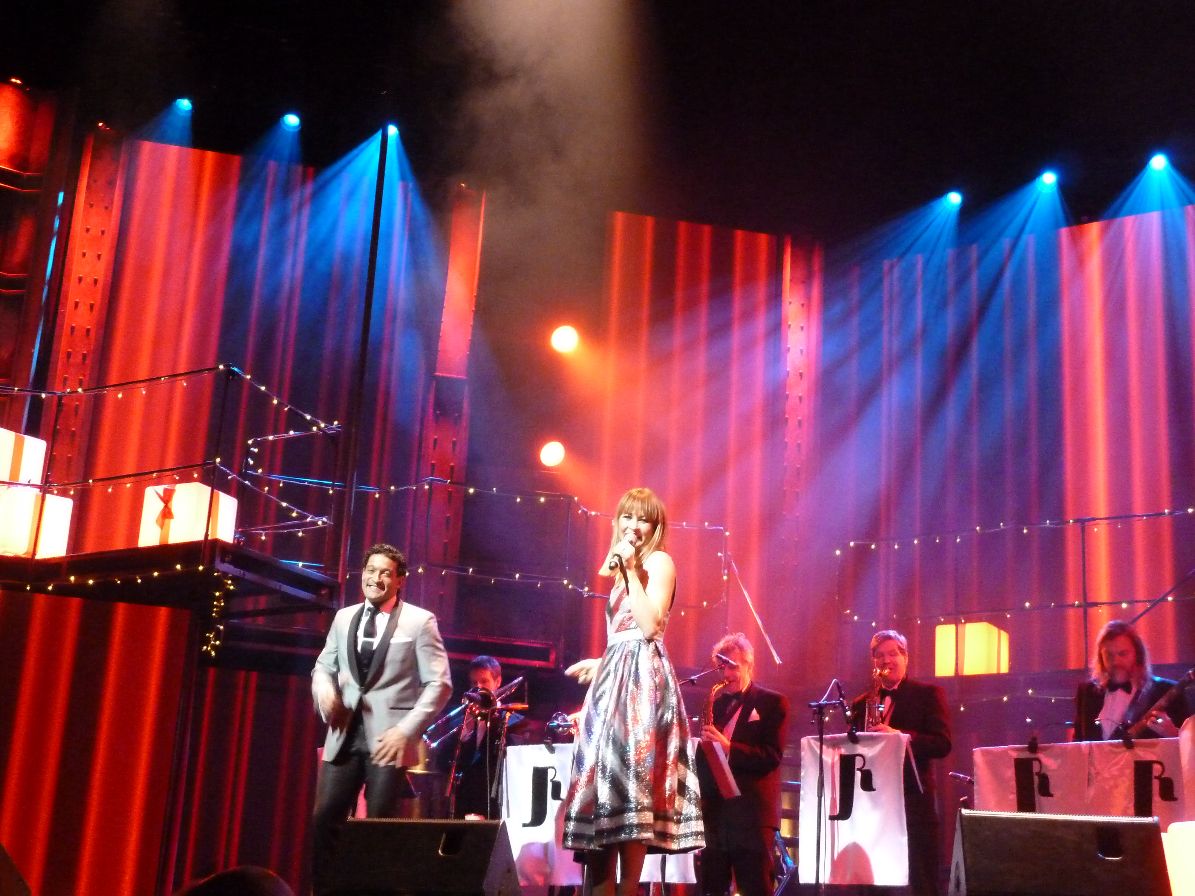 P1070466Ytterligare en julshow, men i en helt annan stil än de jag sett tidigare i år. Den här gången är det Janne Radesjös 8amannaband,  med en kvinnlig, Hanna Lindblad, och en manlig, Rennie Mirro, solist som intar scen. Programmet består främst av en rad klassiska amerikanska jullåtar. Det är fart och fläkt och riktigt juligt. Scen är smyckad med ljusslingor och paket och ljussättningen skiftar i olika juliga färger. Riktigt snyggt och enkelt.
