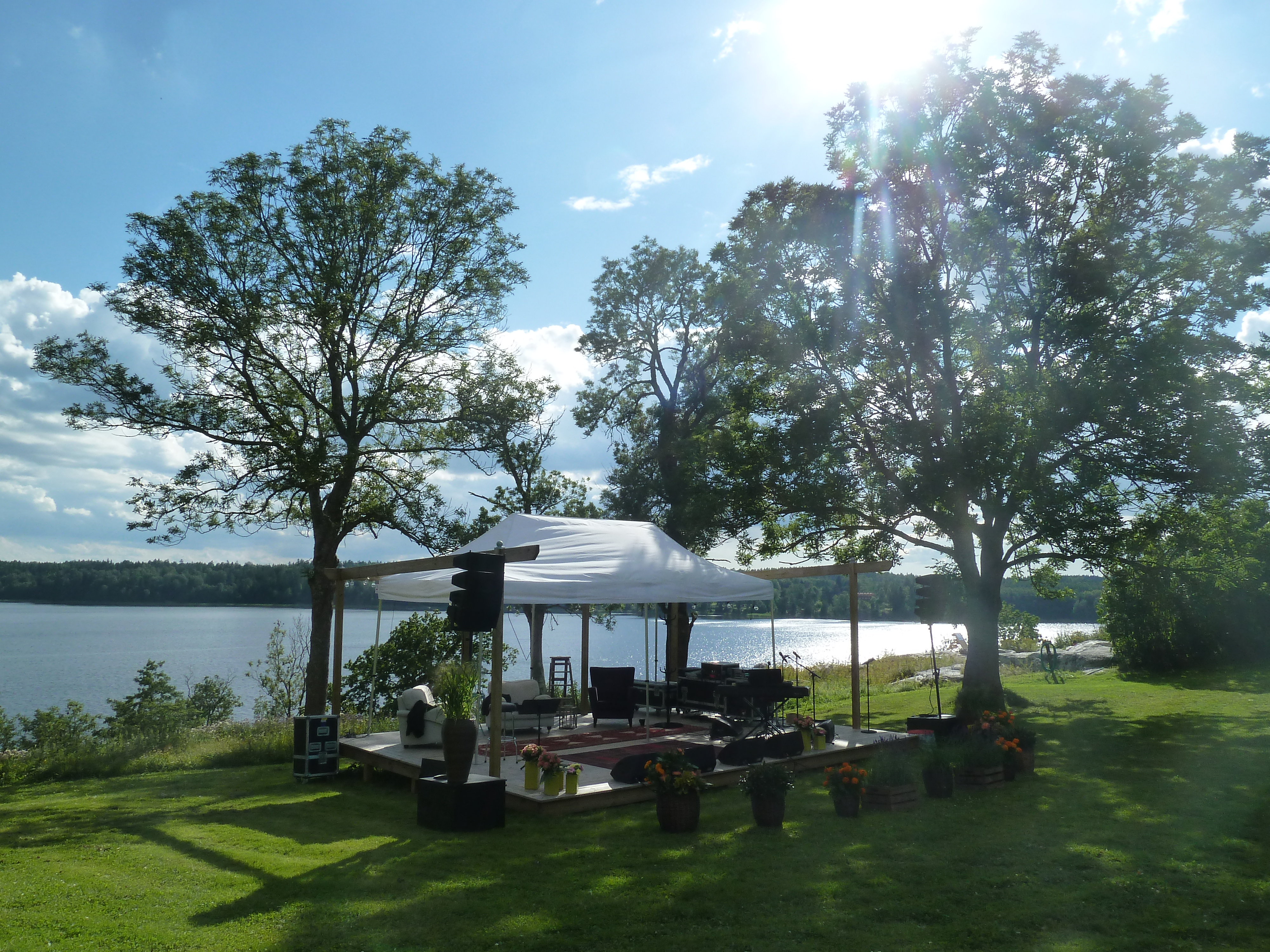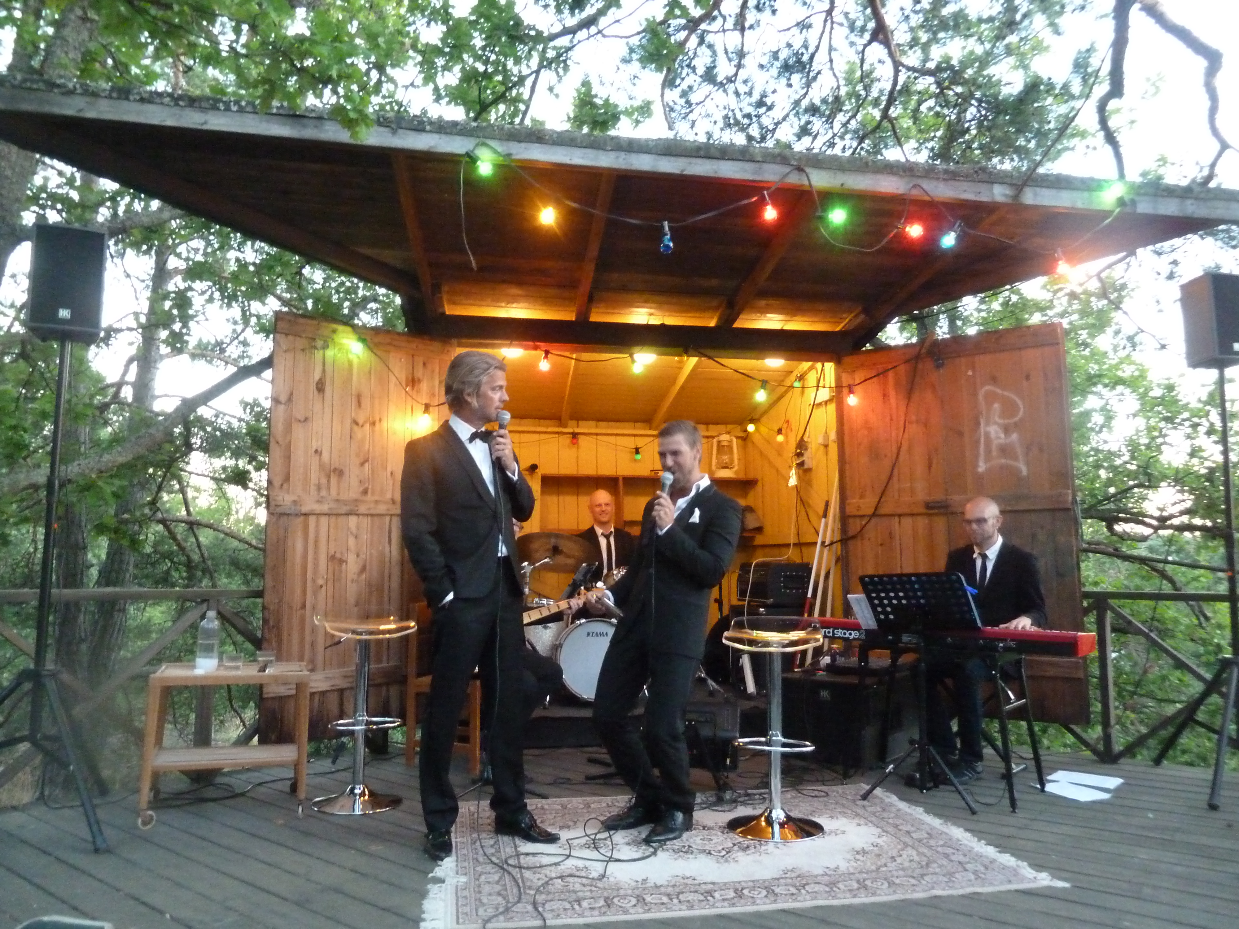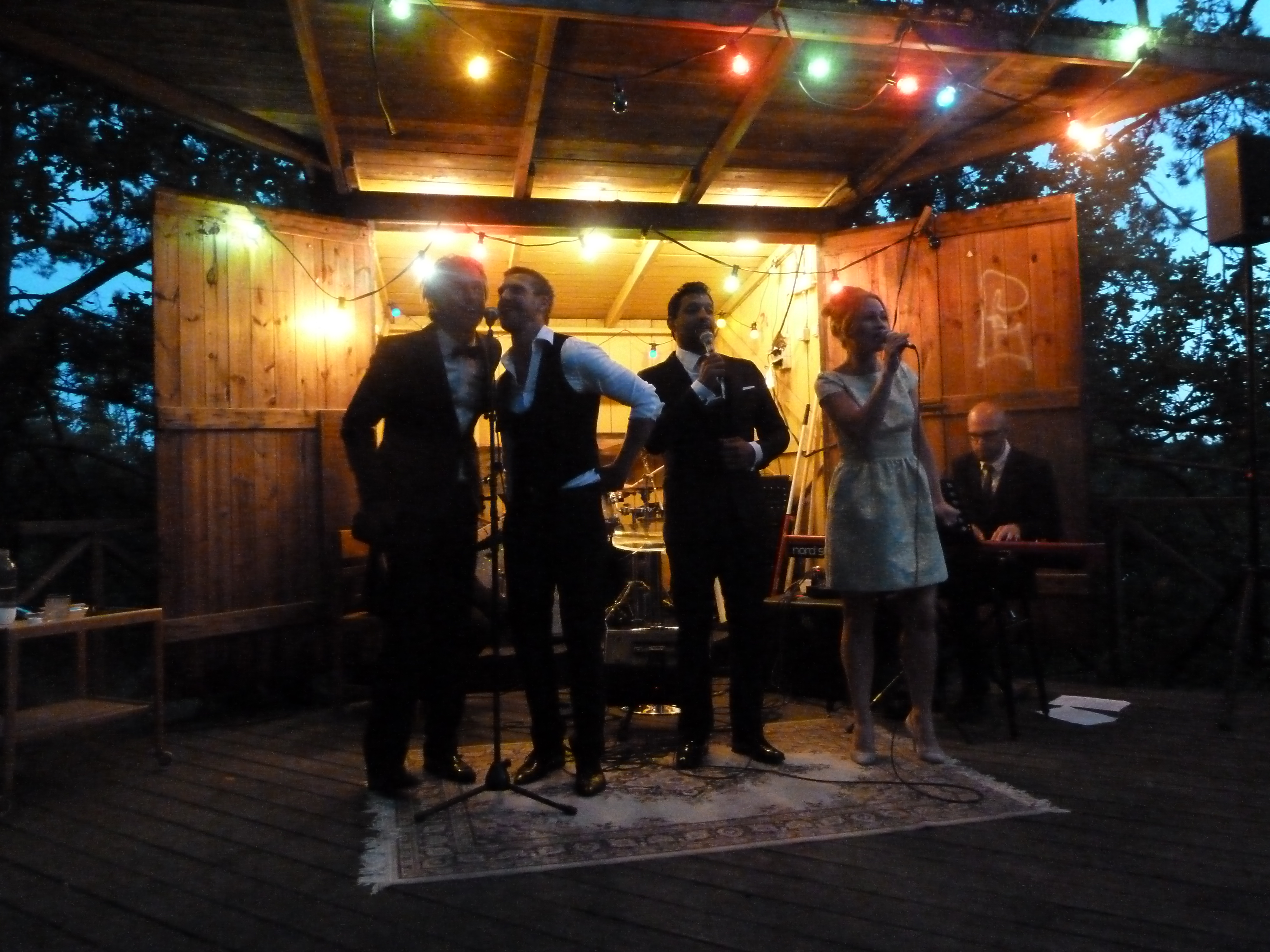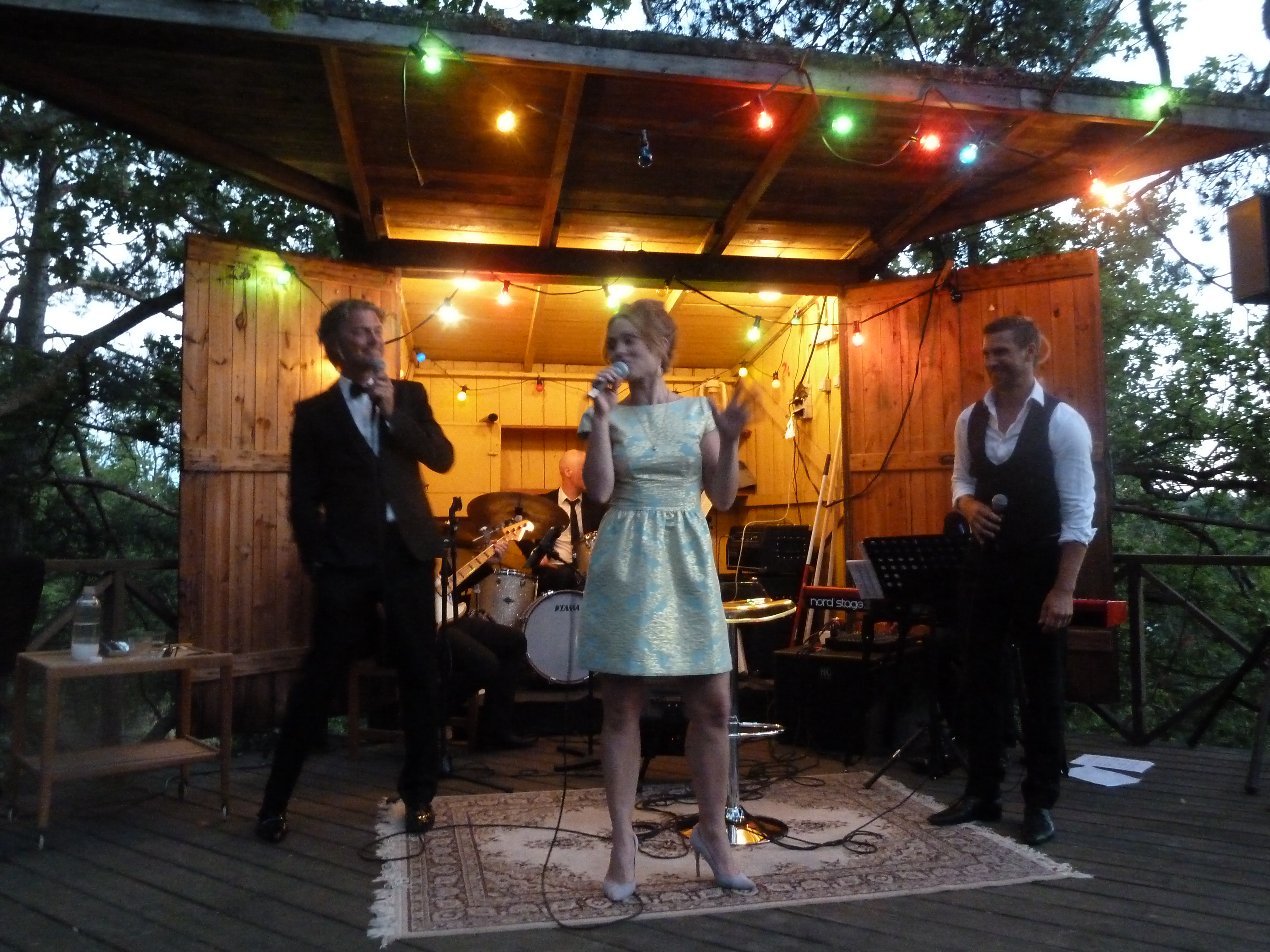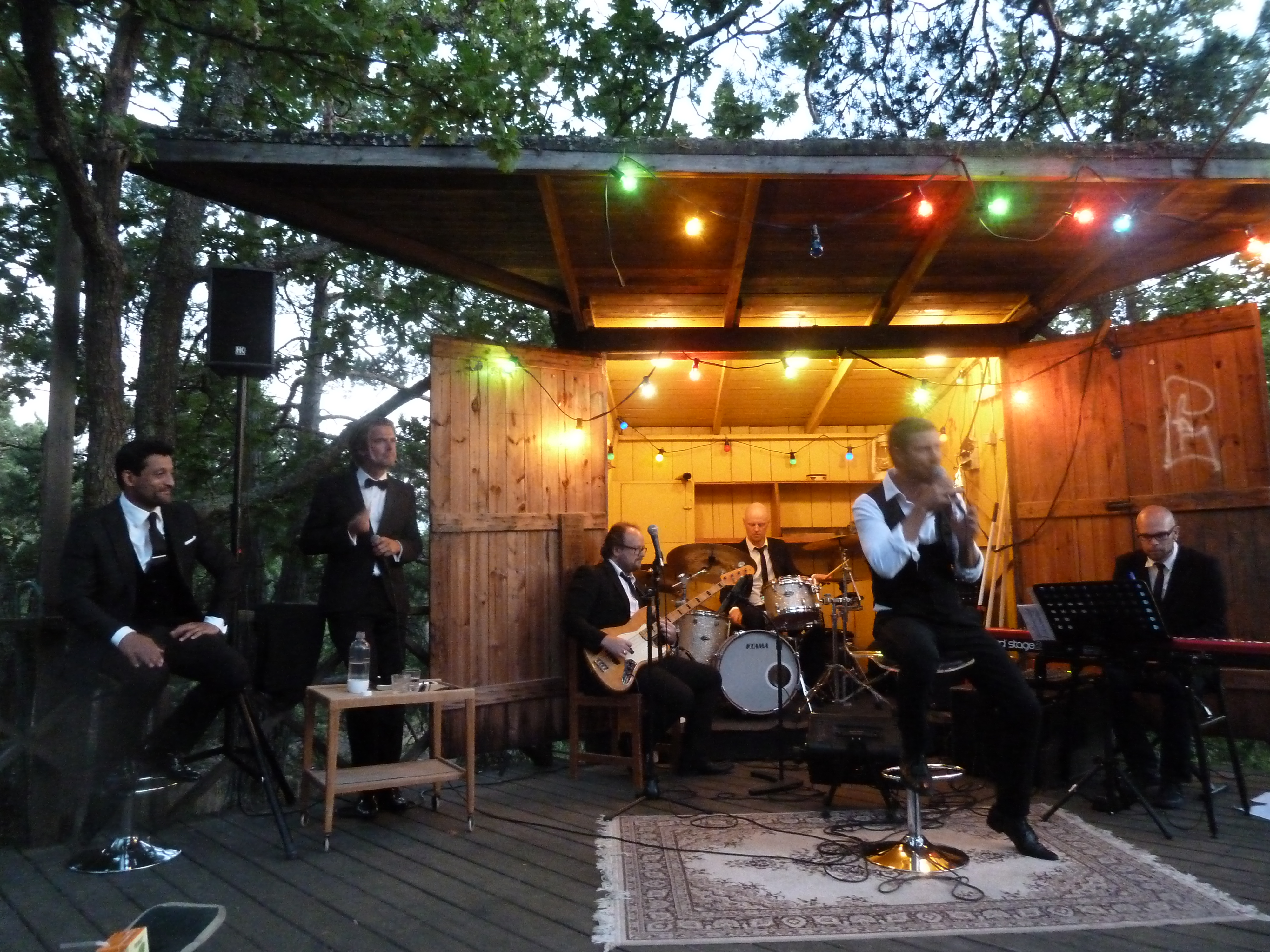 En ljummen augustikväll begav vi oss till Norra Lagnö Dansbana föra att se några av våra musikalfavoriter och det var inte det enklaste att hitta upp till dansbanan. Ta först trappan ni ser fick vi tips av några som vi mötte på vägen, och trappa och trappa kan man ju diskutera om det var eller inte. Men vi tog oss upp och vandrade vidare över berghällarna och så ser vi en vitmålad sten med en liten handskriven lapp och lite längre upp ett litet trästånd som visade sig vara biljettluckan. Dock obemannad när vi kom. Och då såg vi dansbanan! typisk svensk landsortsdansbana i trä med plats för orkester som en garderob. Och när man steg i på dansbanan så var det som att gå in i en trädkoja! Man var mitt uppe bland trädtopparna! Hur läckert som helst och måste bara upplevas. Så ännu en magisk scen! Det vara kanske ett 80tal stolar utställda på dansbanan och sen satt publiken på berghällen som var på ena siden av dansbanan.
