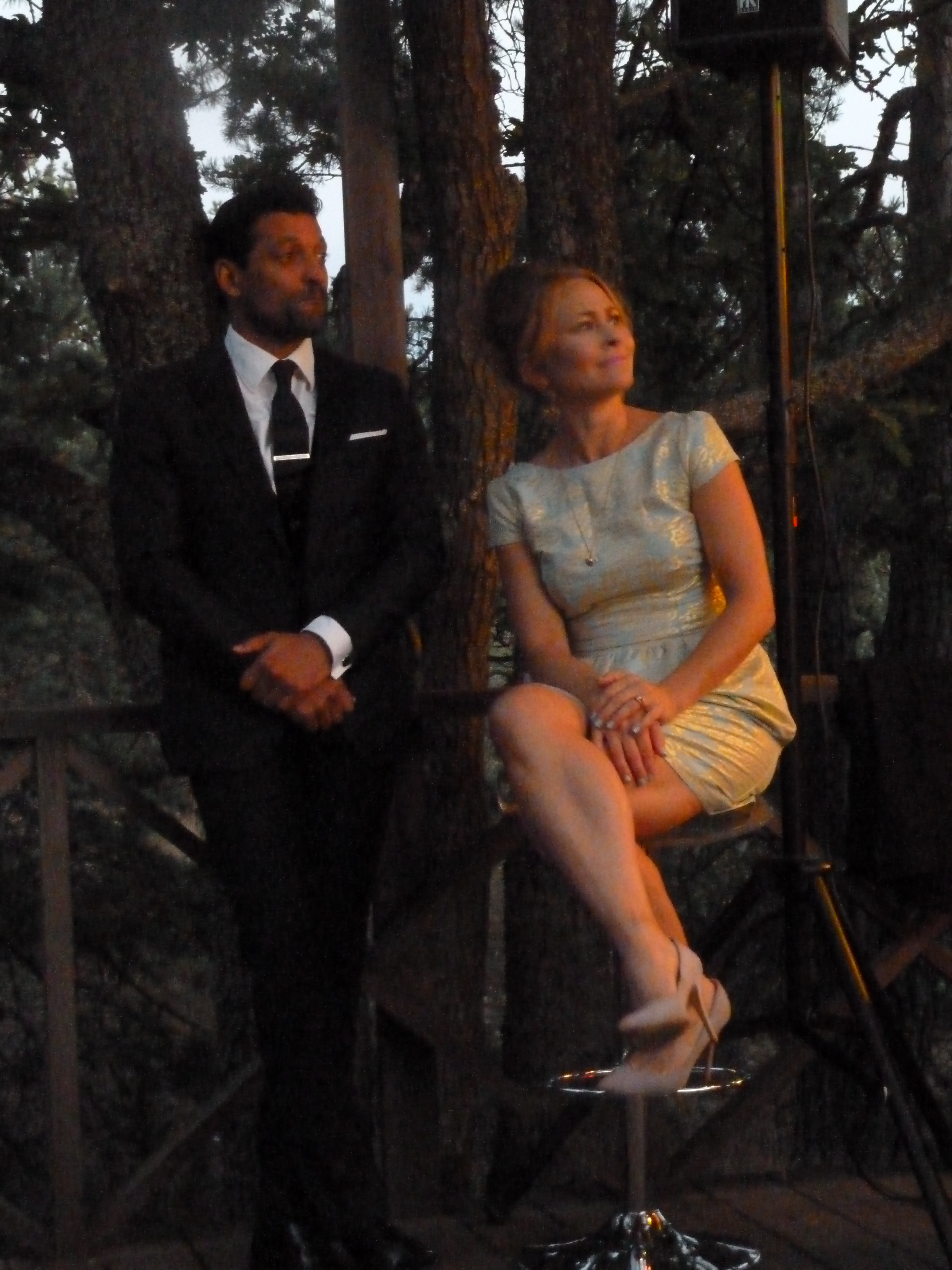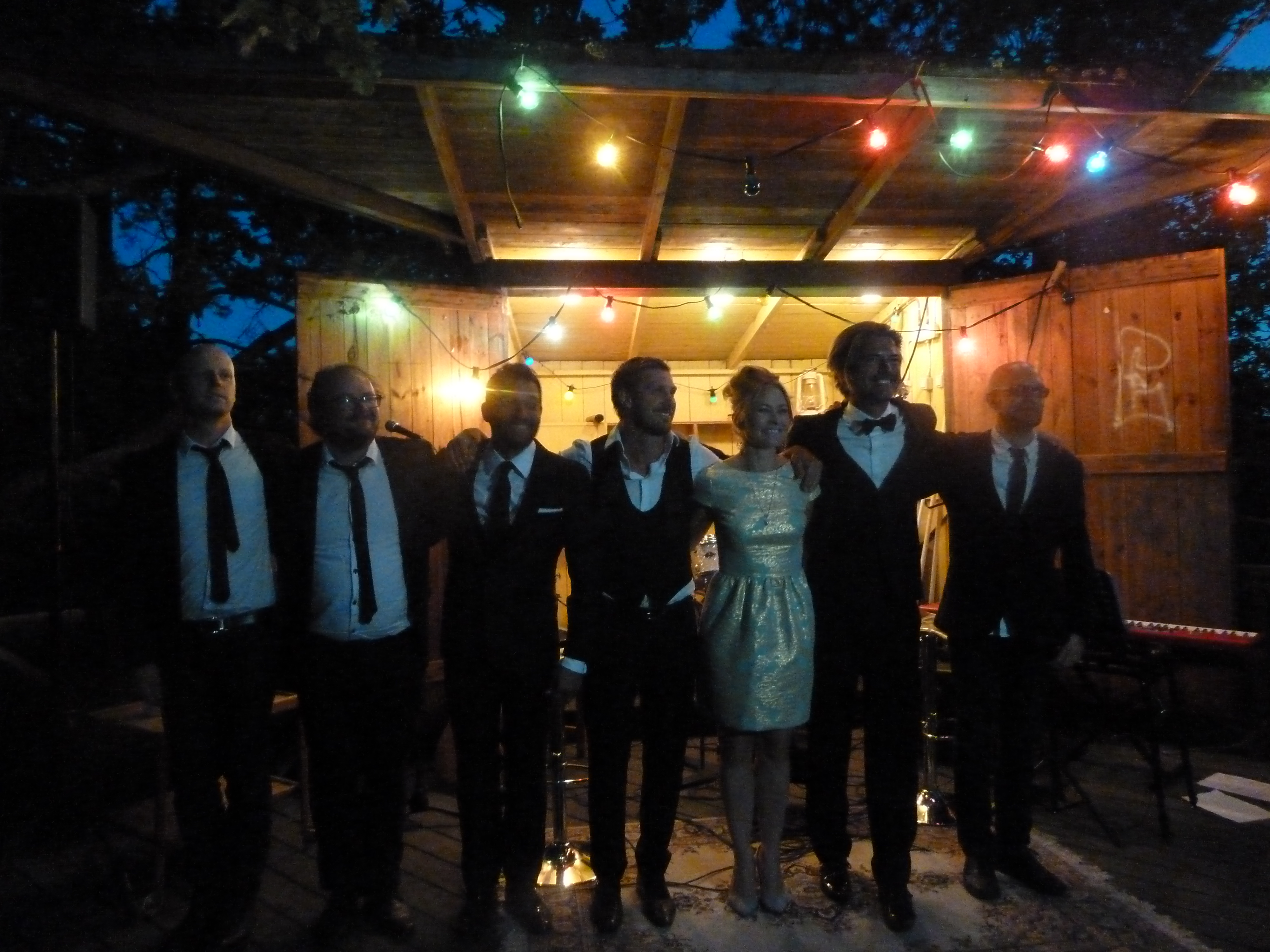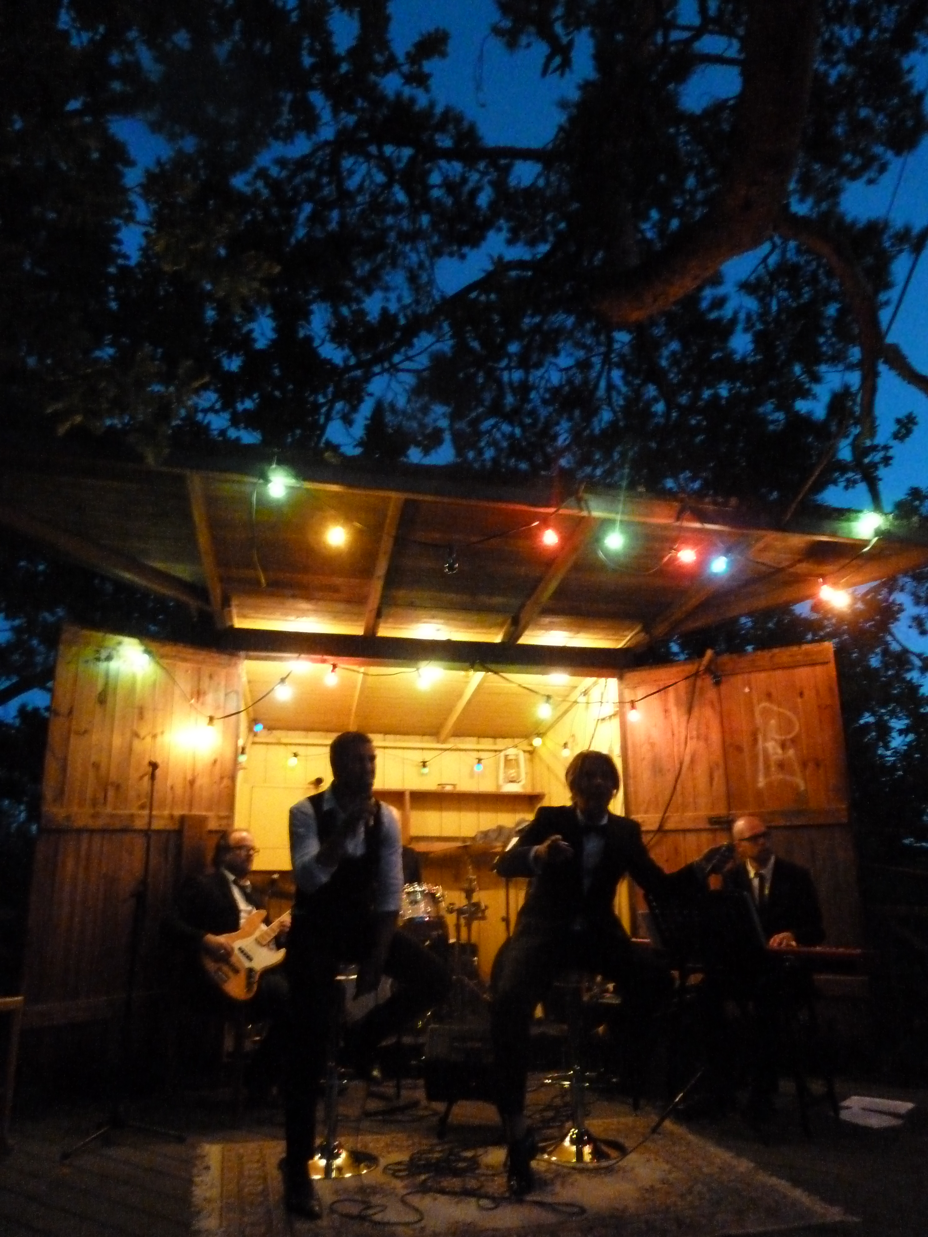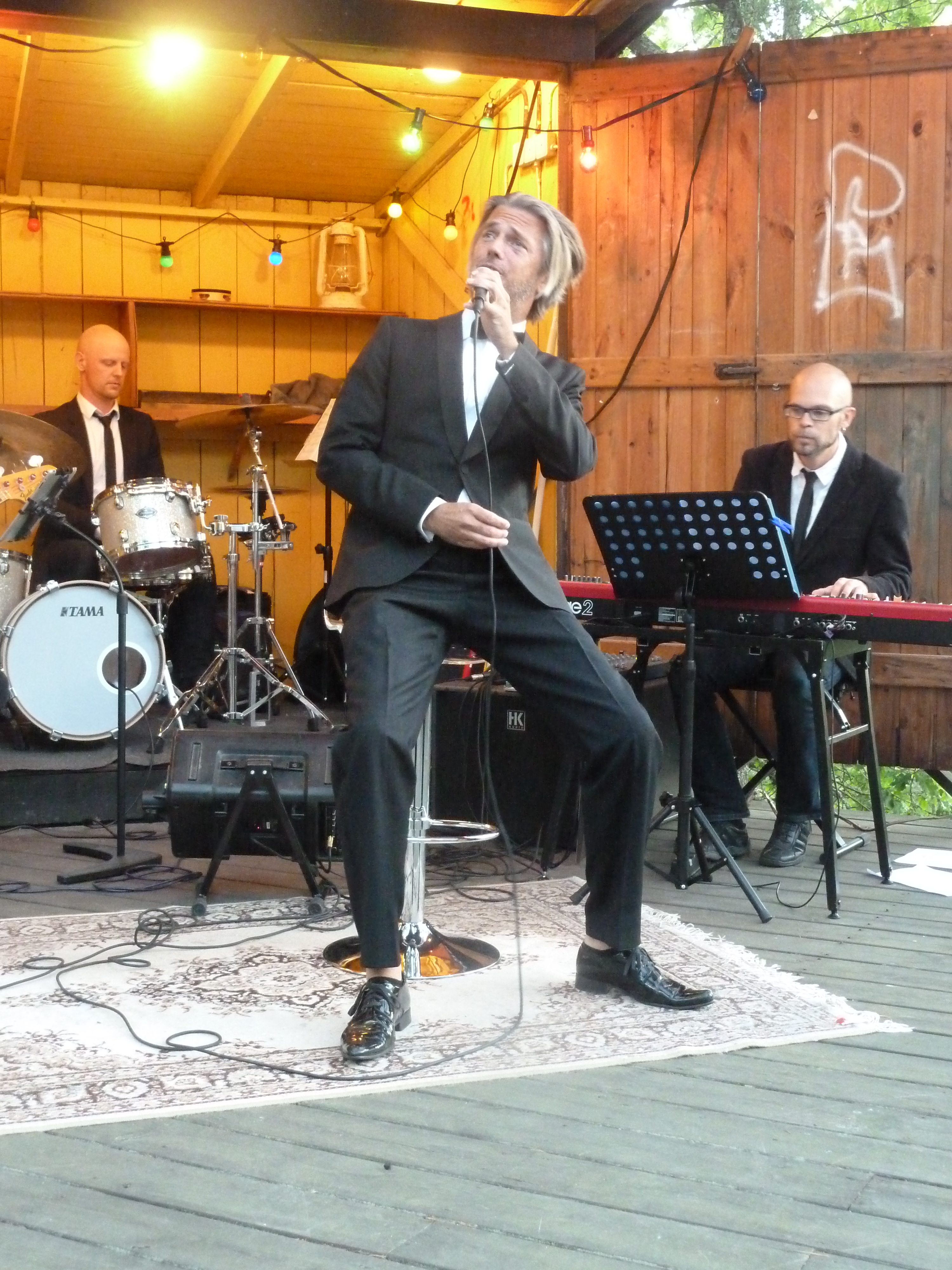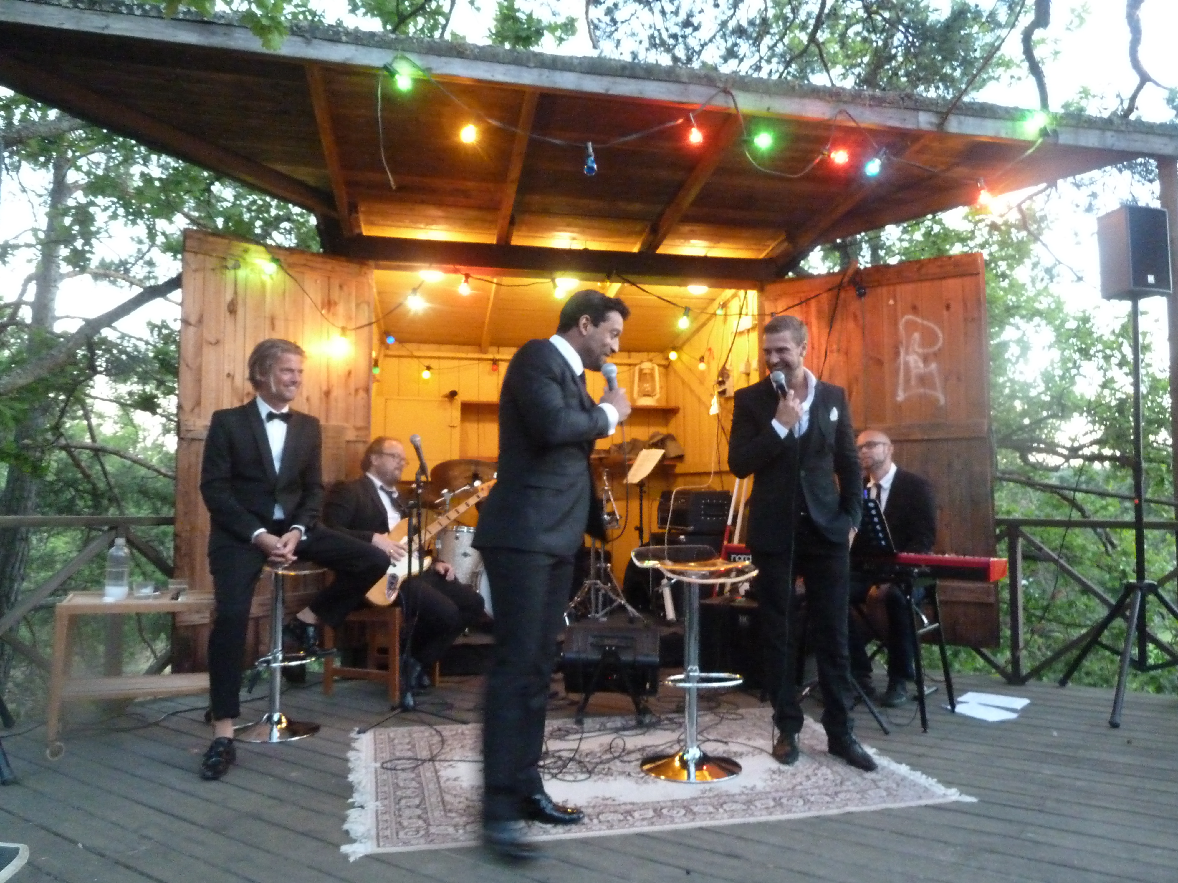 En ljummen augustikväll begav vi oss till Norra Lagnö Dansbana föra att se några av våra musikalfavoriter och det var inte det enklaste att hitta upp till dansbanan. Ta först trappan ni ser fick vi tips av några som vi mötte på vägen, och trappa och trappa kan man ju diskutera om det var eller inte. Men vi tog oss upp och vandrade vidare över berghällarna och så ser vi en vitmålad sten med en liten handskriven lapp och lite längre upp ett litet trästånd som visade sig vara biljettluckan. Dock obemannad när vi kom. Och då såg vi dansbanan! typisk svensk landsortsdansbana i trä med plats för orkester som en garderob. Och när man steg i på dansbanan så var det som att gå in i en trädkoja! Man var mitt uppe bland trädtopparna! Hur läckert som helst och måste bara upplevas. Så ännu en magisk scen! Det vara kanske ett 80tal stolar utställda på dansbanan och sen satt publiken på berghällen som var på ena siden av dansbanan.