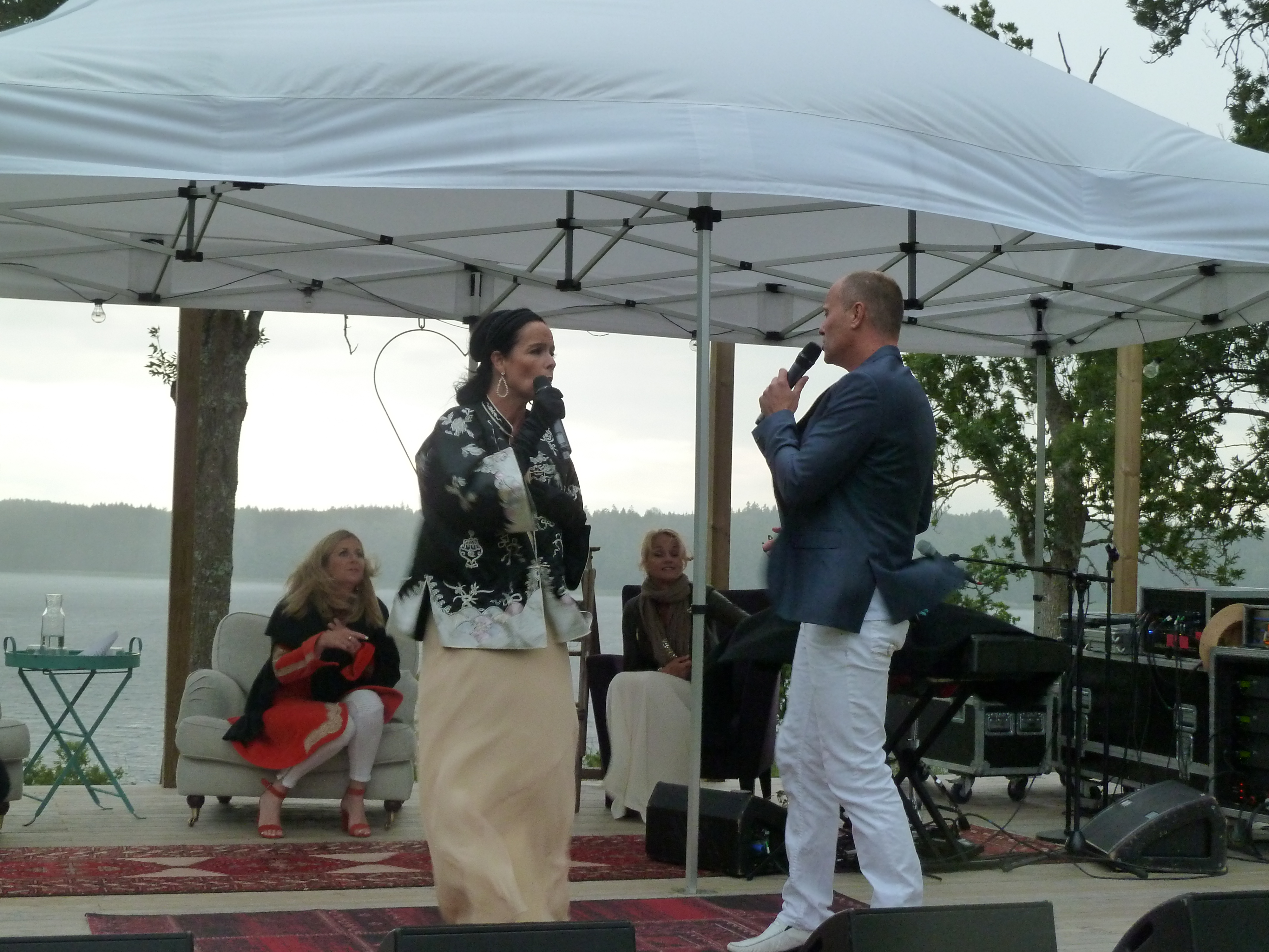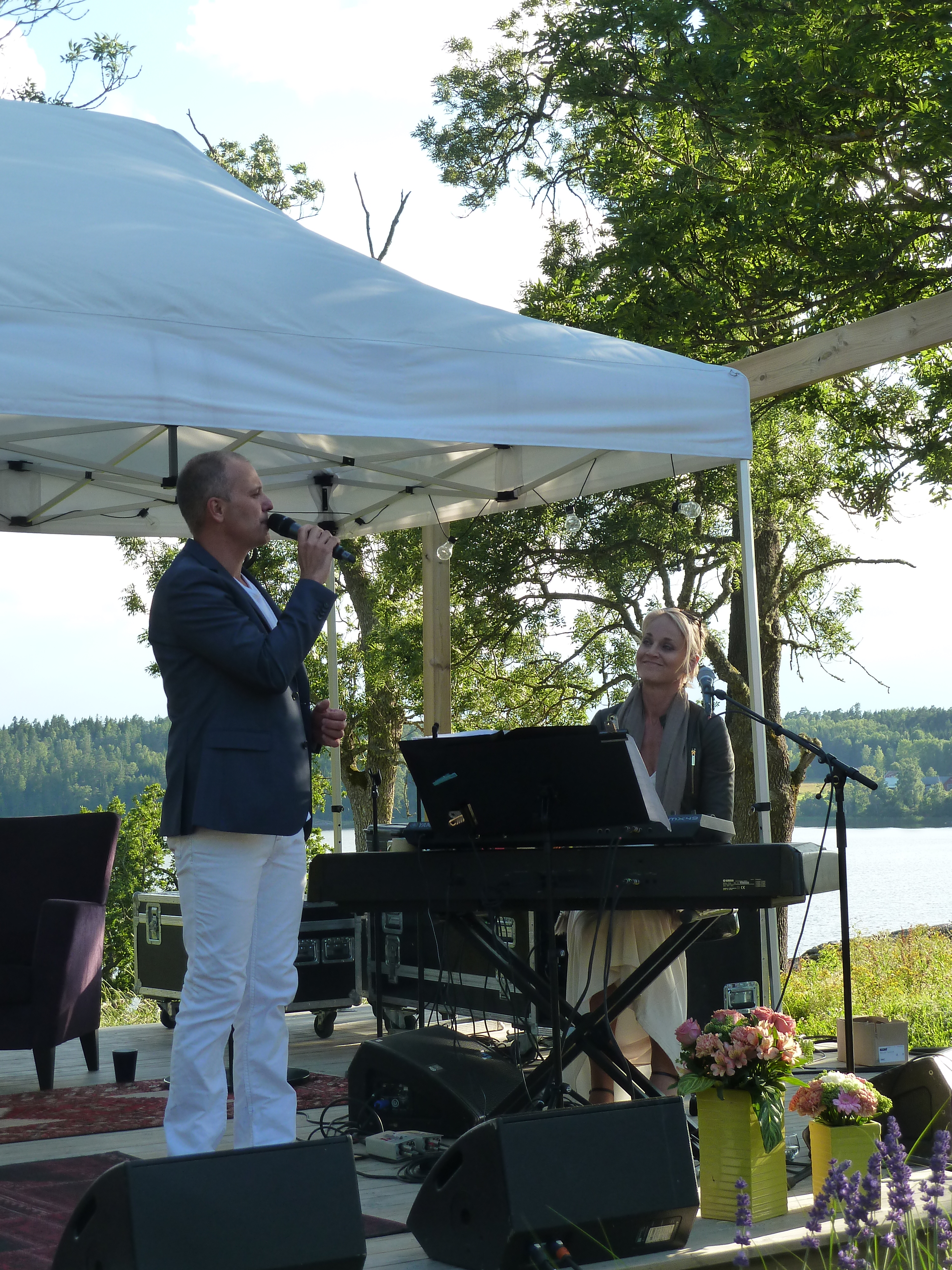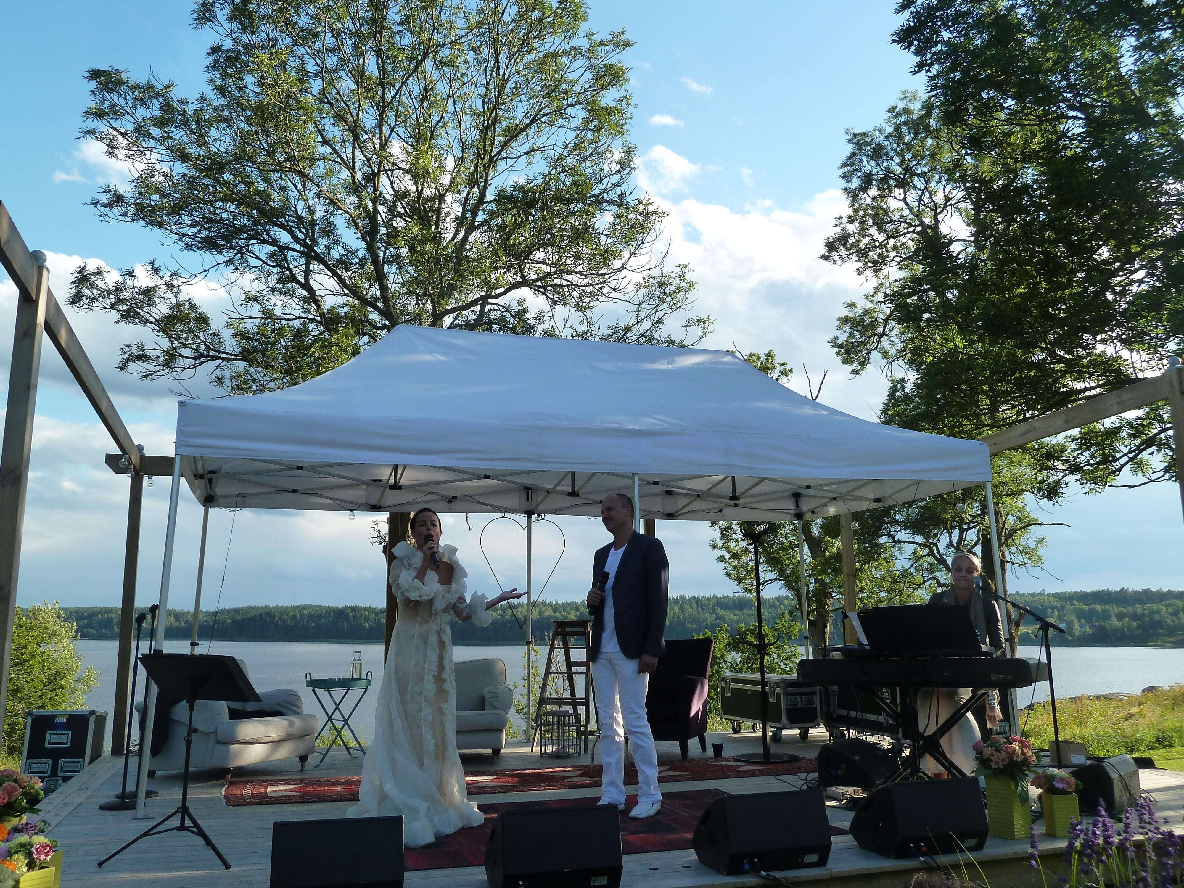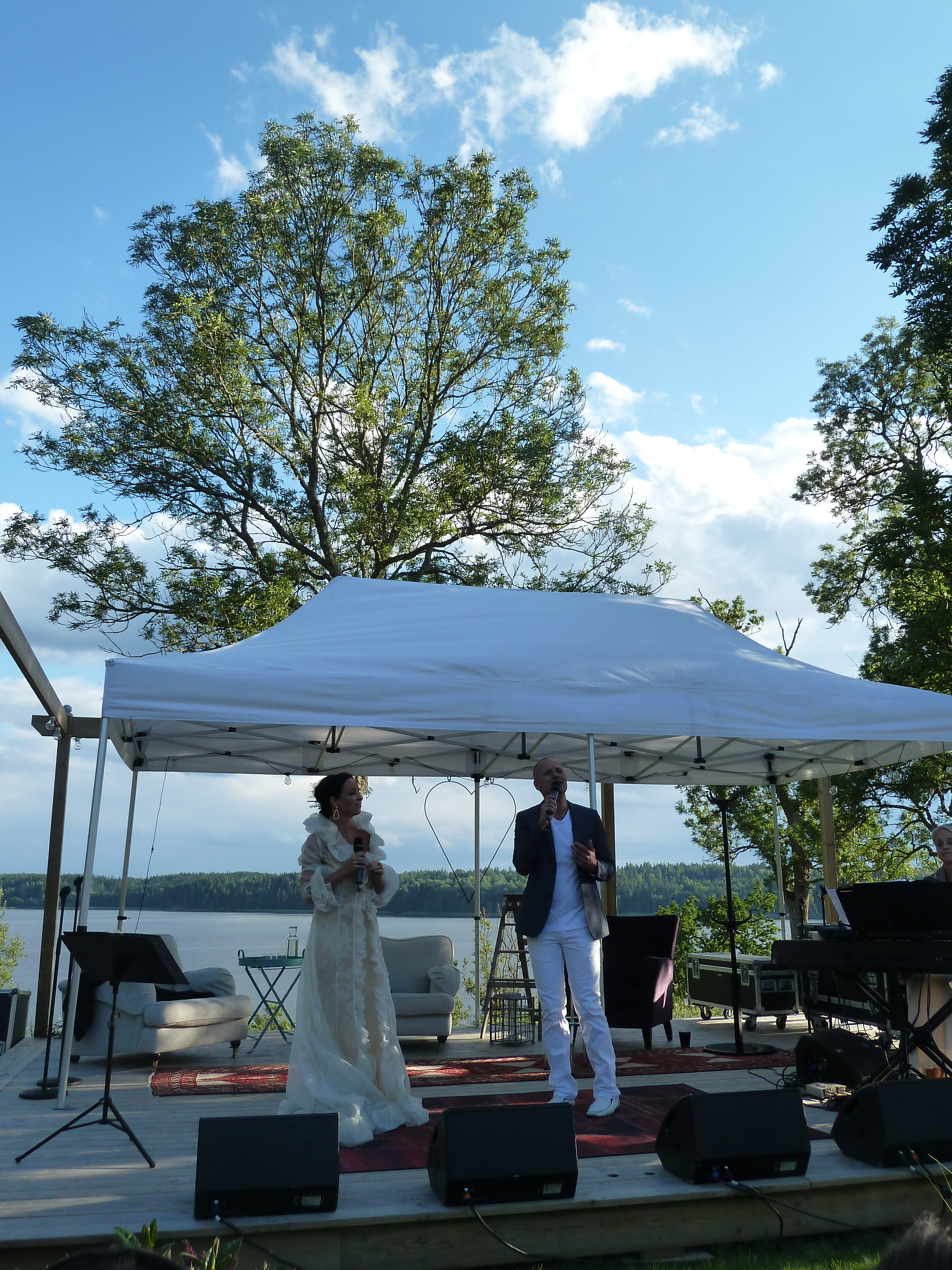 Men en konsert en skön solig kväll i augusti med några av våra bästa musikalartister kan ju inte bli annat än fantastisk i en sådan underskön miljö. Värden Niklas inleder och hälsar alla välkomna och sen bjuder han in sina damer till scen. Först pianisten Carina E Nilsson som han uppträtt tillsammans med många gånger och det märks för de är verkligen samspelta. Sen är det dags för underbara Malena Laszlo att äntra scenen, som vanligt i en av sina fantastiska klänningar. En stund senare så byter Niklas dam och Gunilla Backman träder in på scen. Under kvällen bjuds vi på allt från Phantom of the opera, Les Miserable, Miss Saigon och Mamma Mia. Men även smakprov från Malenas kommande föreställning, The American Songbook på svenska. Gunilla bjöd på en väldigt bra tolkning av ”Regn på min parad” från Funny Girl som med all sannolikhet ingår i hennes Barbara Streisandföreställning på Stadsteatern  Självklart blev det ett par vackra duetter också. Kvällen absolut bästa nummer var när Niklas sjöng Getsemane. En riktigt stark tolkning som gav gåshud. Och det var inte för att regnstormen började dra in över Sund. Tyvärr blev vädrets makter för starka så kvällen avbröts lite tidigare än de tänkt sig. Regnet öste ner, publiken tog på sig regnkläder men vare sig publiken eller Niklas ville sluta, så det blev en rad discolåtar i regnet. Går alldeles utmärkt att dansa i full regnmundering!