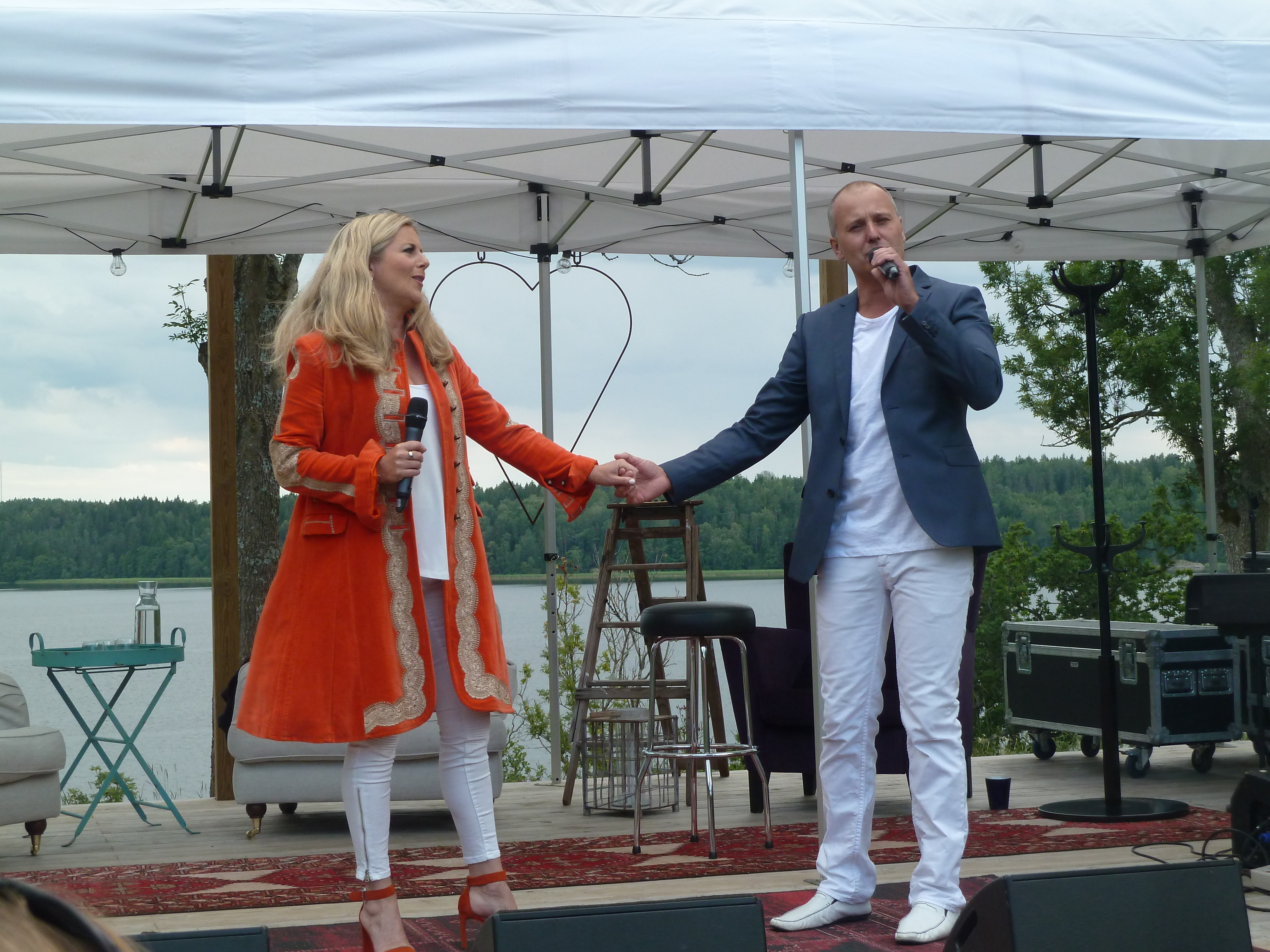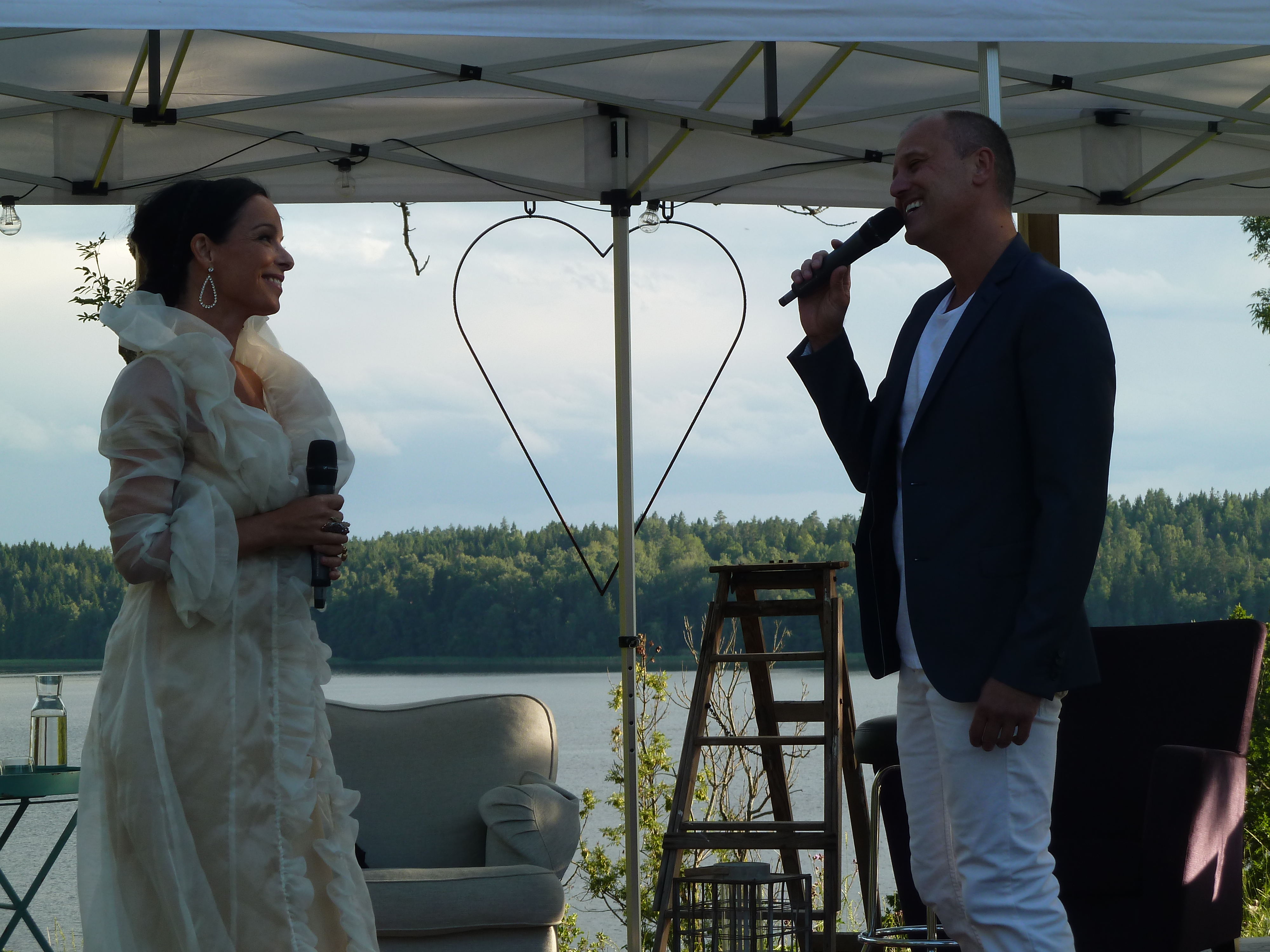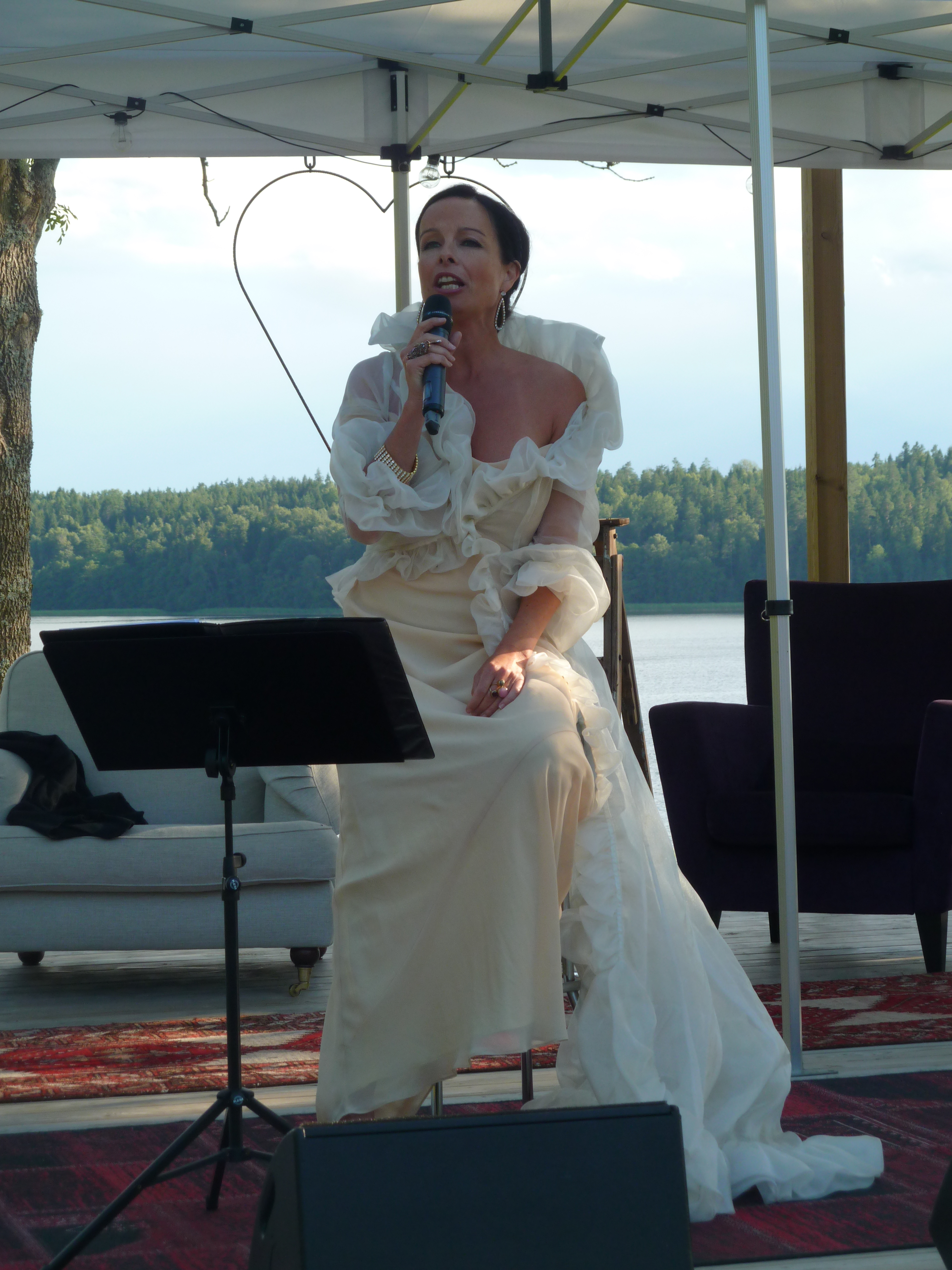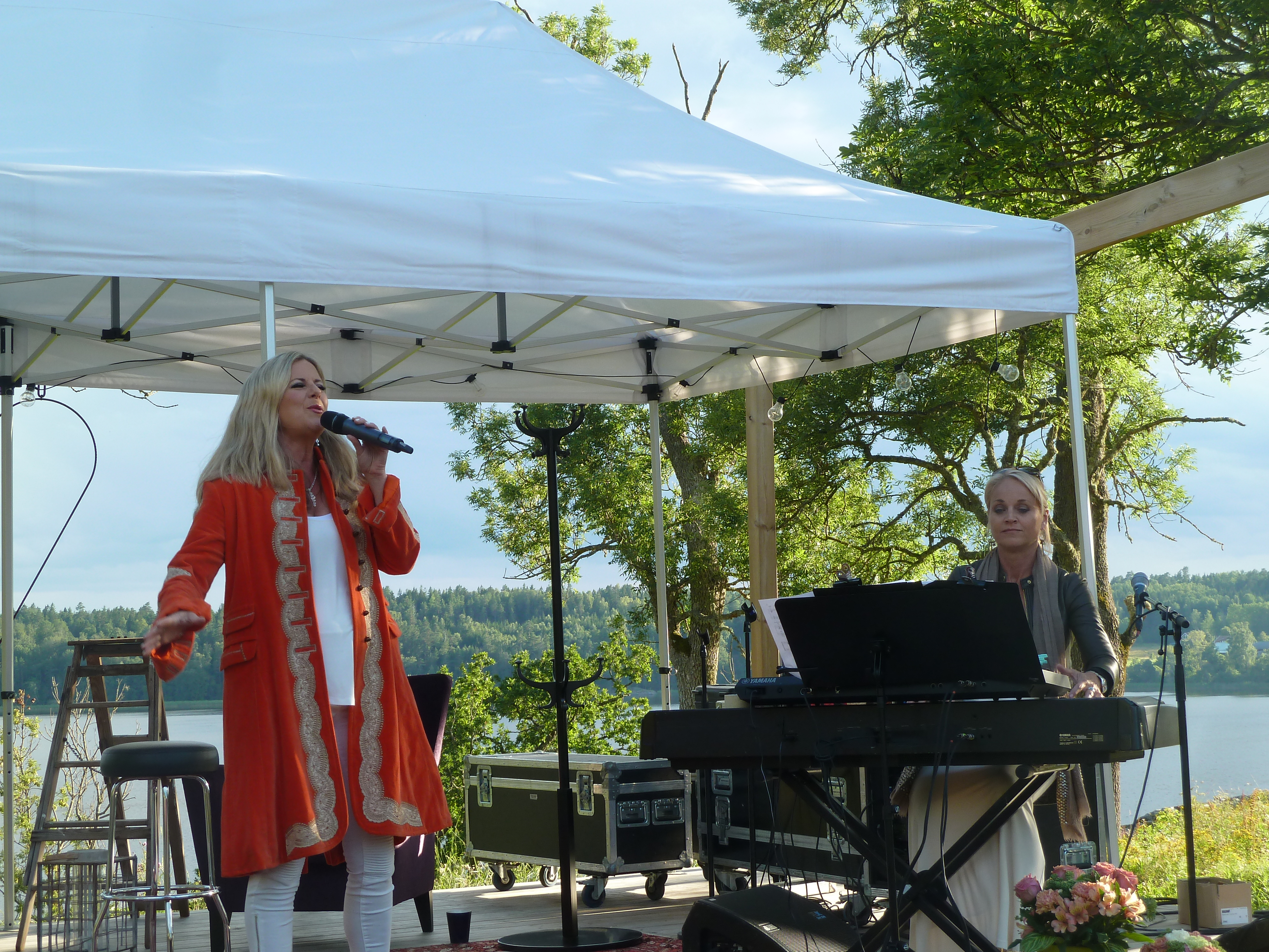 Men en konsert en skön solig kväll i augusti med några av våra bästa musikalartister kan ju inte bli annat än fantastisk i en sådan underskön miljö. Värden Niklas inleder och hälsar alla välkomna och sen bjuder han in sina damer till scen. Först pianisten Carina E Nilsson som han uppträtt tillsammans med många gånger och det märks för de är verkligen samspelta. Sen är det dags för underbara Malena Laszlo att äntra scenen, som vanligt i en av sina fantastiska klänningar. En stund senare så byter Niklas dam och Gunilla Backman träder in på scen. Under kvällen bjuds vi på allt från Phantom of the opera, Les Miserable, Miss Saigon och Mamma Mia. Men även smakprov från Malenas kommande föreställning, The American Songbook på svenska. Gunilla bjöd på en väldigt bra tolkning av ”Regn på min parad” från Funny Girl som med all sannolikhet ingår i hennes Barbara Streisandföreställning på Stadsteatern  Självklart blev det ett par vackra duetter också. Kvällen absolut bästa nummer var när Niklas sjöng Getsemane. En riktigt stark tolkning som gav gåshud. Och det var inte för att regnstormen började dra in över Sund. Tyvärr blev vädrets makter för starka så kvällen avbröts lite tidigare än de tänkt sig. Regnet öste ner, publiken tog på sig regnkläder men vare sig publiken eller Niklas ville sluta, så det blev en rad discolåtar i regnet. Går alldeles utmärkt att dansa i full regnmundering!