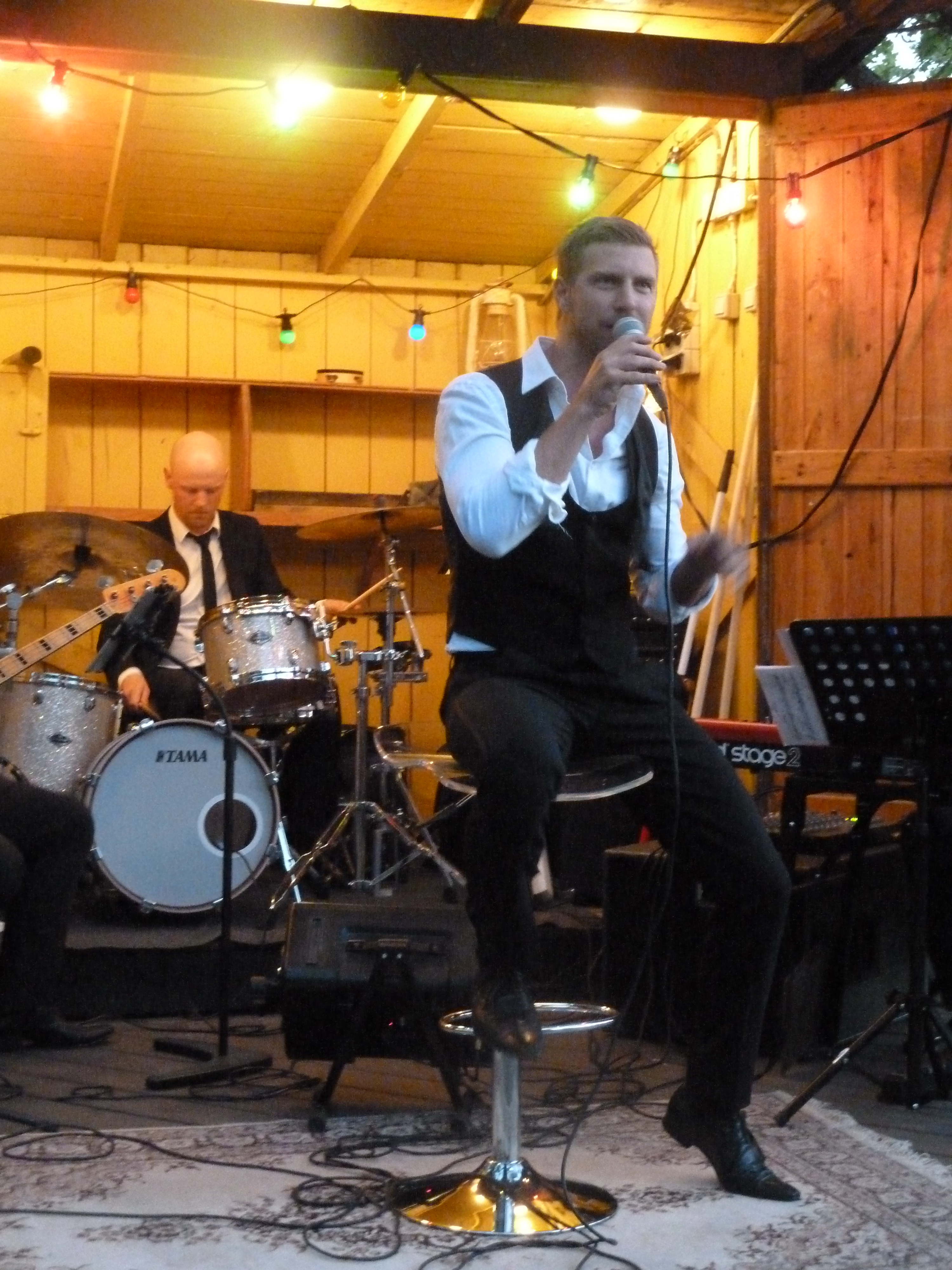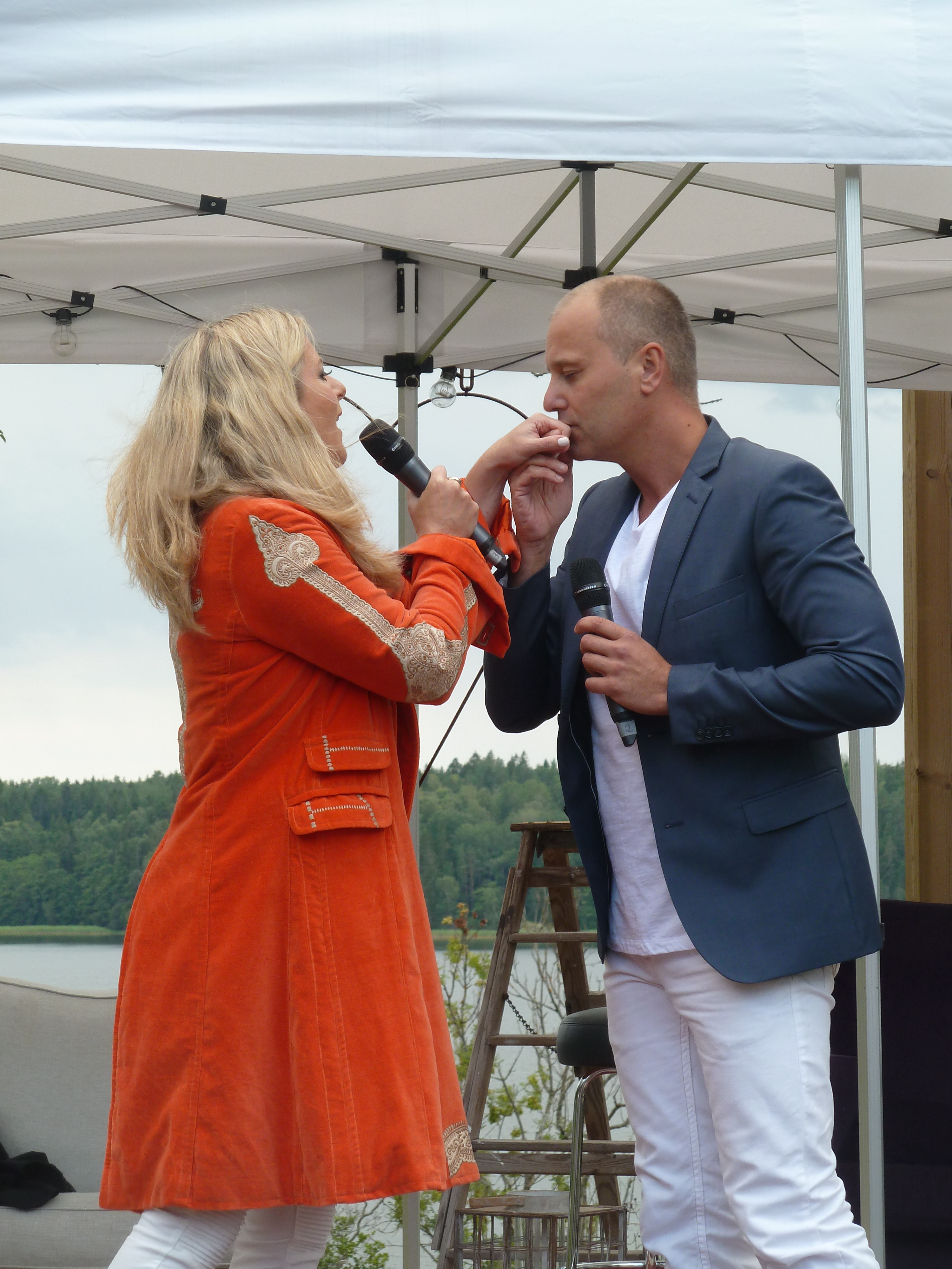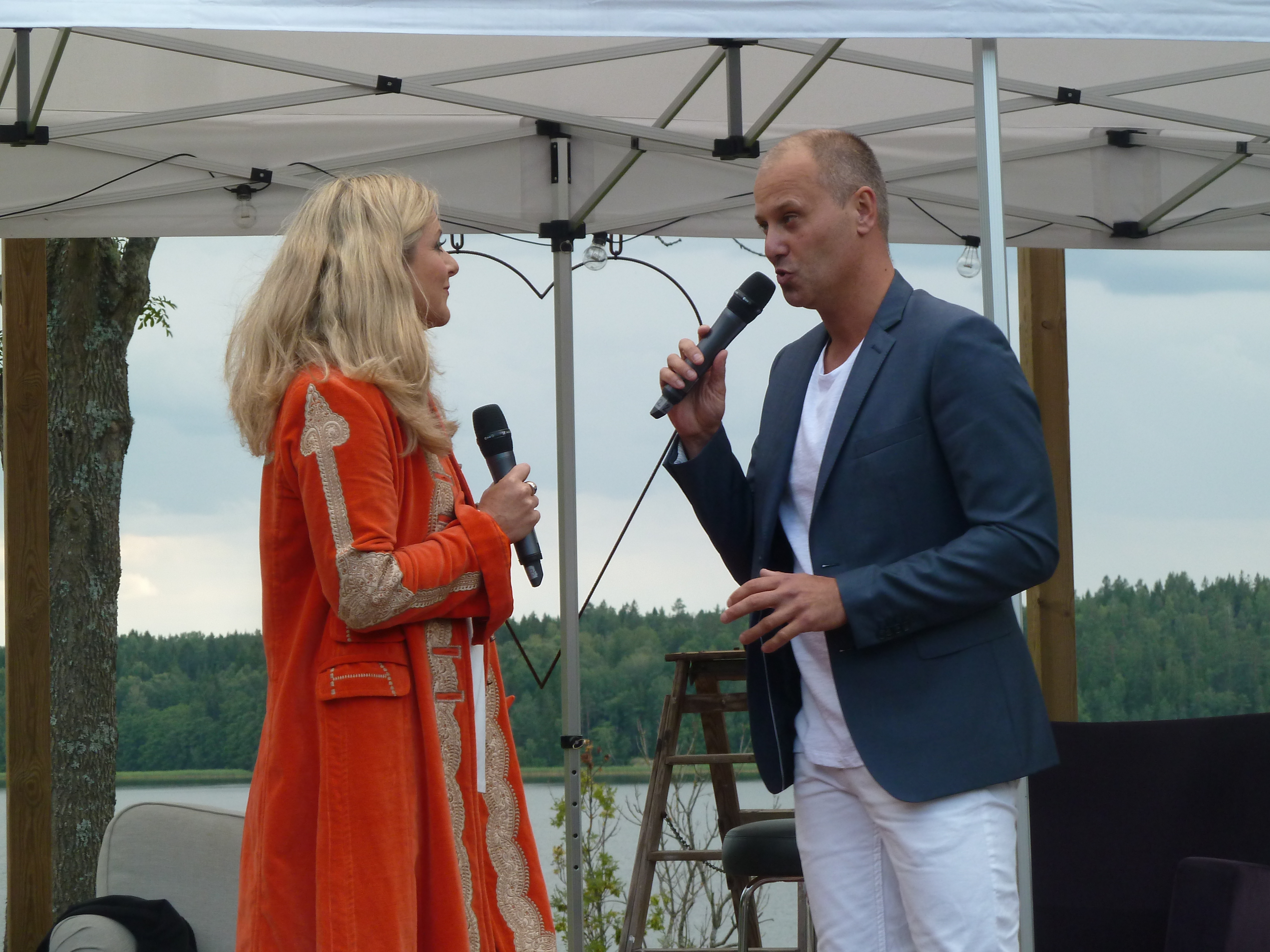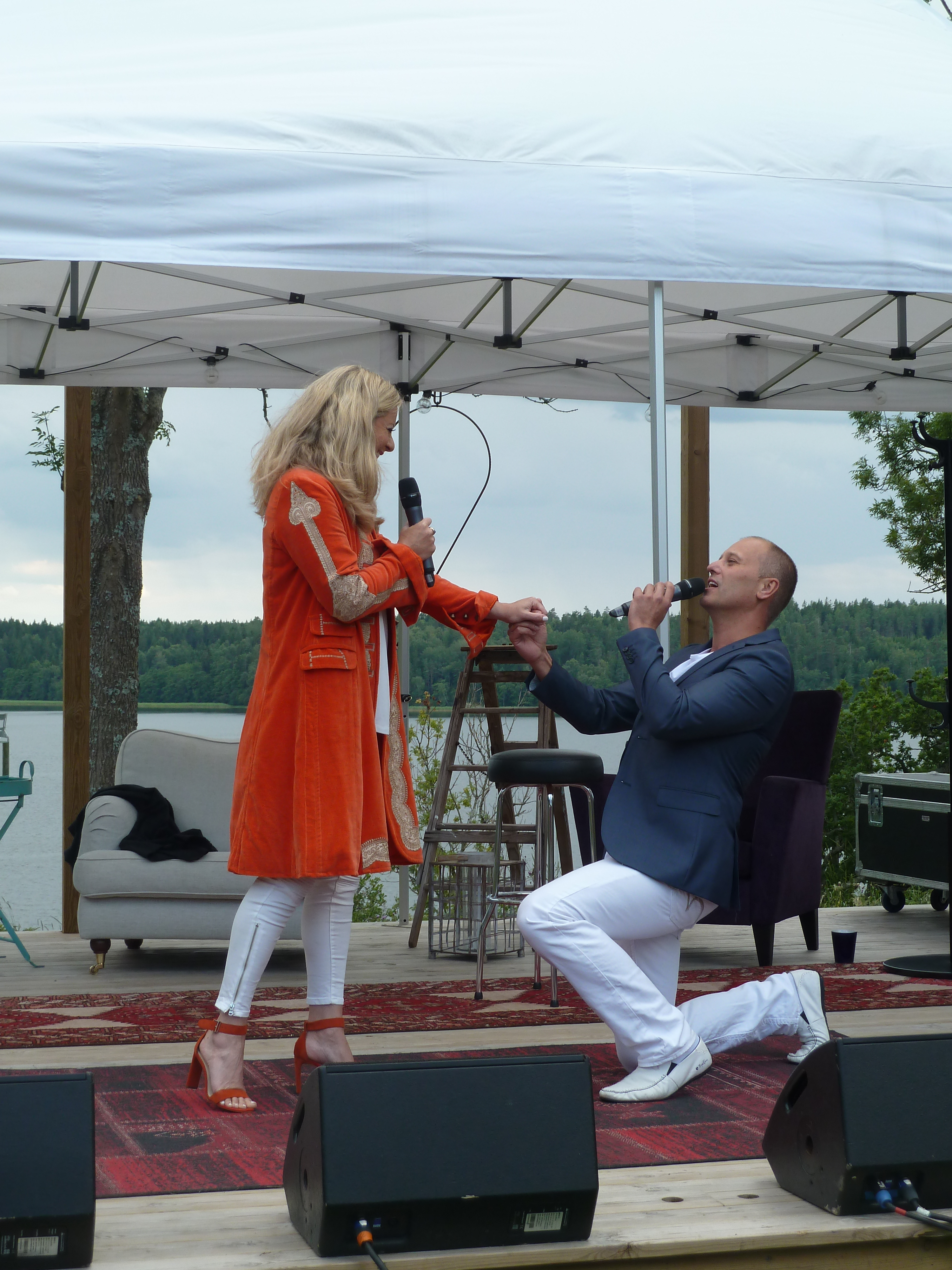Men en konsert en skön solig kväll i augusti med några av våra bästa musikalartister kan ju inte bli annat än fantastisk i en sådan underskön miljö. Värden Niklas inleder och hälsar alla välkomna och sen bjuder han in sina damer till scen. Först pianisten Carina E Nilsson som han uppträtt tillsammans med många gånger och det märks för de är verkligen samspelta. Sen är det dags för underbara Malena Laszlo att äntra scenen, som vanligt i en av sina fantastiska klänningar. En stund senare så byter Niklas dam och Gunilla Backman träder in på scen. Under kvällen bjuds vi på allt från Phantom of the opera, Les Miserable, Miss Saigon och Mamma Mia. Men även smakprov från Malenas kommande föreställning, The American Songbook på svenska. Gunilla bjöd på en väldigt bra tolkning av ”Regn på min parad” från Funny Girl som med all sannolikhet ingår i hennes Barbara Streisandföreställning på Stadsteatern  Självklart blev det ett par vackra duetter också. Kvällen absolut bästa nummer var när Niklas sjöng Getsemane. En riktigt stark tolkning som gav gåshud. Och det var inte för att regnstormen började dra in över Sund. Tyvärr blev vädrets makter för starka så kvällen avbröts lite tidigare än de tänkt sig. Regnet öste ner, publiken tog på sig regnkläder men vare sig publiken eller Niklas ville sluta, så det blev en rad discolåtar i regnet. Går alldeles utmärkt att dansa i full regnmundering!