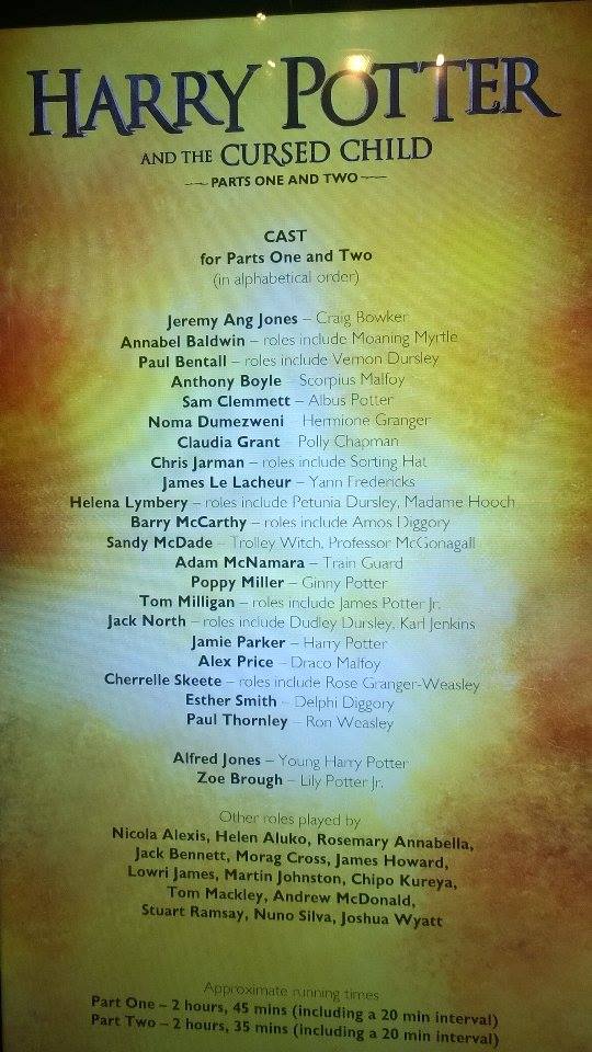 Som sagt vi såg orginalcasten och jag måste säga att jag är imponerad av alla i den. Ingen kan väl ha missat att man har valt Noma Dumezweni som Hermione. En mörk kvinna som spelar Hermione, och hon är helt perfekt! Spelar en stark och kraftfull Hermione. Jamie Parker spelar Harry Potter. Paul Thornley är Ron Weasly och bägge två är bra i sina roller Poppy Milller är jättebra som Ginny Potter. Alla fyra axlar mantlarna väl som vuxna. De nya huvudrollerna är ju Albus Potter, Scorpius Malfoy och Delphi Diggory. Sam Clemmett, som Ablus Potter är fantastisk. Riktigt imponerad blev jag av Anthony Boyle som spelar Scorpius Malfoy, pojken som alla undrar vem är hans pappa egentligen? Och Ester Smith som Delphi Diggory är helt underbar! Men hela ensamblen är väldigt bra och det märks att de har kul att göra den här föreställningen. Och vem skulle inte göra det när de efter varje akt möts av publikens jubel och dånande applåder? Under akten var det i stort sett knäpptyst, men efter varje akt ville applåderna inte ta slut och de blev inropade flera gånger i det vanliga applådtacket. Publiken gillade verkligen föreställningen, gammal som ung och det var verkligen en väldigt blandad publik.