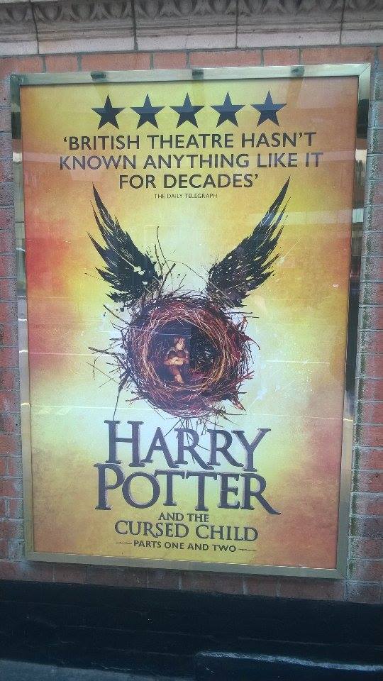 Själva upplägget är ju speciellet med att den är uppdelad i två delar och man kan välja att se den två kvällar i följd, eller bägge på samma dag. Jag valde det senare för när man väl ser den vill man ju se klart! Man blir uppmanad att komma 1 timme innan för det är säkerhetskontroll etc. Så vi var på plats strax före kl 12 och då ringlade sig kön från entrén till stage door på teatern, dvs ett halvt varv runt huset. Det var många som var klädda i HP-tröjor, caper, halsdukar etc, så publiken såg mer ut som om den var på väg till en konsert eller en fotbollsmatch, inte på väg till en teater! Men jättekul att se. När de väl öppnat så gick kontrollen rätt snabbt och inne så påminde de flera gånger om att man inte någon gång fick ta kort inne i salongen, bara ute i barerna. Och efter varje del så delades det ut knapppar med #keepthesecrets, så jag kommer inte avslöja så mycket…. Går man utanför teatern finns inte några bilder från föreställningen som det brukar. Dock säljer de ett souvenirprogram med bilder inne på teatern och det finns lite bilder på hemsidan också.