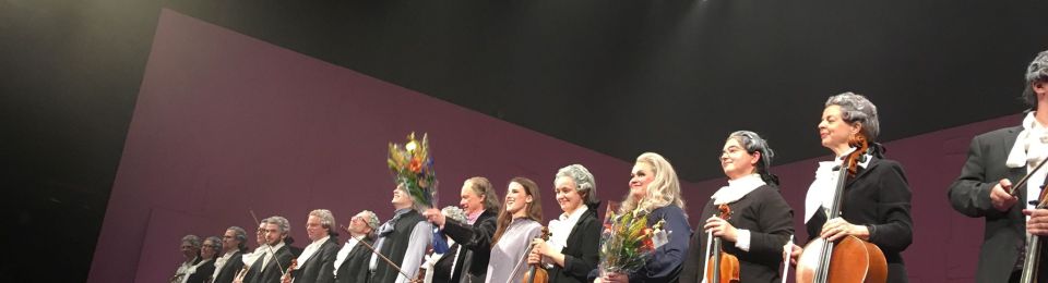 När vi kommer in i salongen var orkestern på plats på scenen och höll på att stämma instrumenten och ”värma upp”. De var tidsenligt klädda (1791) med peruker och allt, så de var en aktiv del i själva pjäsen. Pjäsen är en sammanslagning av två olika enaktare, Mozart och Salieri av Nikolai Rimskij-Korsakov och Prima la musica e poi le parole av Antonio Salieri.