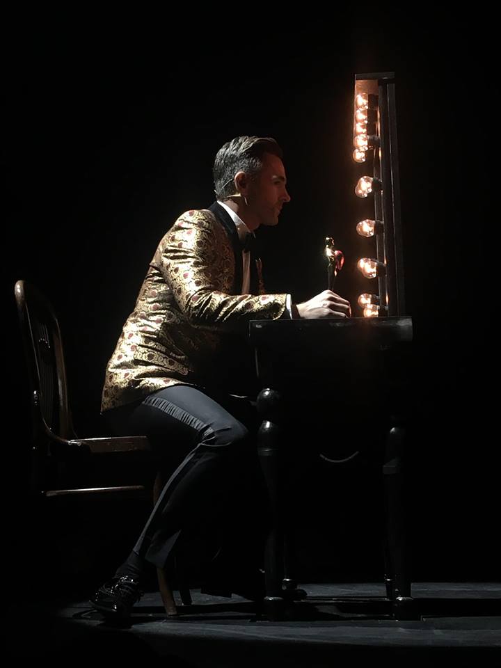 Ikväll var första gången som vi åt mat på Cirkus innan det började. Vi hade bort 7 vilket är precis vid den utbyggda runda scenen. Maten var helt ok, men det man betalar för är ju att få platserna riktigt nära scenen. Det blir en helt annan upplevelse att sitta så nära och nästan vara en del i föreställningen. Vid bord 7 är det en trappa ner från scenen så det var många gånger under kvällen som Peter eller någon från ensemblen kom springande ner eller upp från scenen. Man använder sig verkligen av hela Cirkus under föreställningen och Peter eller någon annan kan dyka upp precis var som helst i salongen så man måste vara alert och se var det händer något.