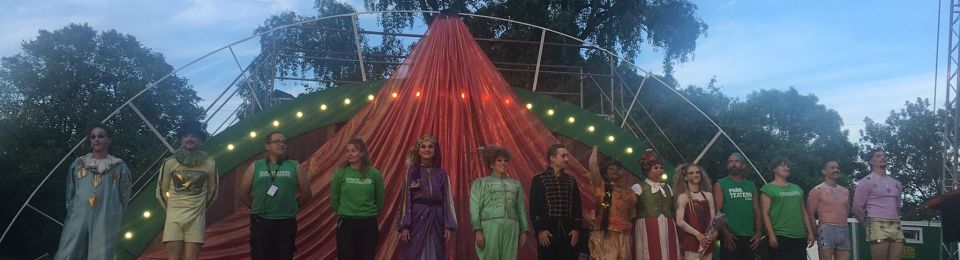 Sommar, musikal och Parkteatern är en underbar kombination. Årets musikal är Elvira Madigan som jag ser den här ljuva junikvällen i Rålambshovsparken. De gröna träden och den klarblå himlen förstärker den färgsprakande musikalen som vi bjuds på. I år har man verkligen inte sparat på färgprakten när vi besöker Cirkus Madigan, den ena kostymen är mer färggrann än den andra och det kan vi tacka Annsofi Nyberg för. Riktigt snyggt blir det när Elvira fäller ut röda långa tygstycken som bildar en gigantisk kjol och hon håller i tre stora röda ballonger högt upp på en bro över scenen.