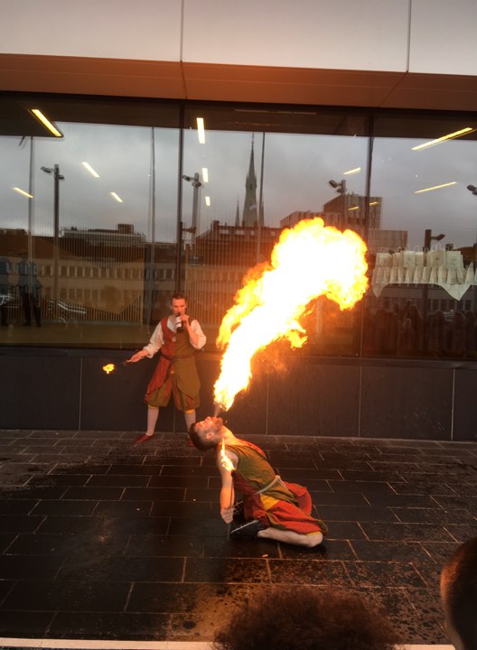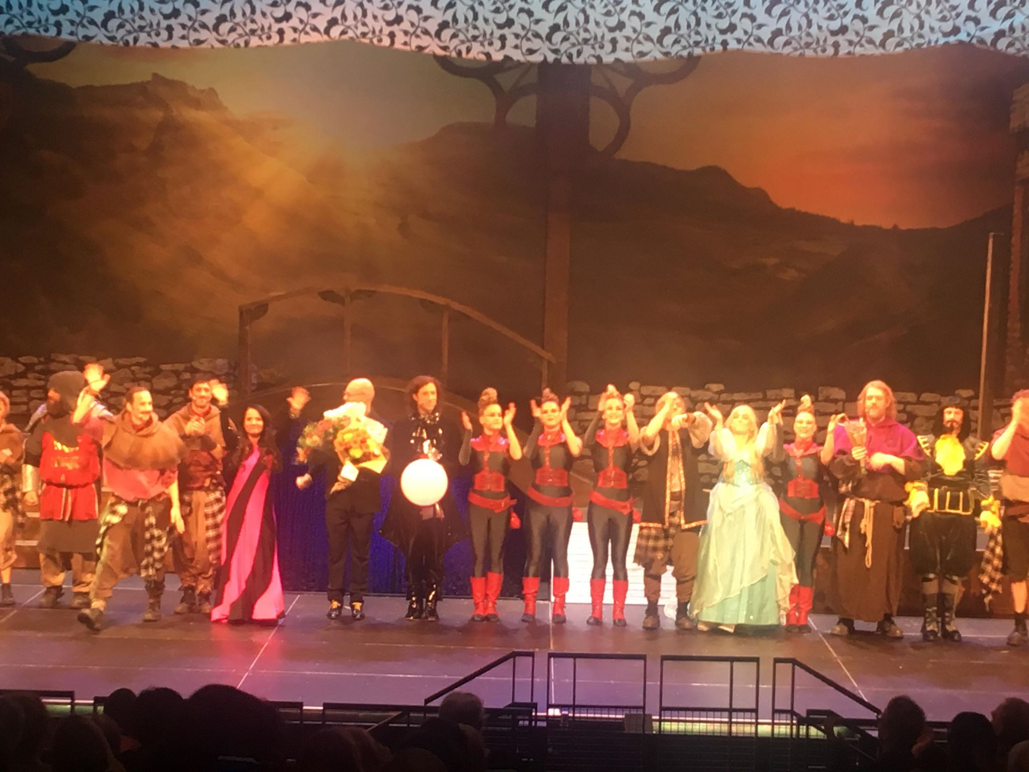För ett par veckor sedan när jag frågade min kompis 6-åriga dotter om hon ville följa med på en musikal om Robin Hood var det ett glädjetjut utan dess like ”Jag älskar Robin Hood”. Så förväntningarna på dagens föreställning var stor och redan i kön in till Waterfront började äventyret med Robin Hood. Två eldkonstnärer/eldslukare underhöll i kön och hon tyckte det var så häftigt när de sprutade eld som drakar. Hon kunde inte få nog av det. Så fick hon syn på sheriffens vakter som gick runt och höll ögonen på kön och det var ju också häftigt. Inne i foajen fortsatte det med soldater med brynjor som gick omkring och hon tvekade inte att vara med på bild med dem. Inne i stora salen var det rikligt uppdukat med champagneglas med dricka i, Festisar, frukt i mängder, guld- och silver mynt och lite annat att äta. Men det bästa var nog att barnen fick testa att skjuta med pilbåge. Inga problem att stå i kö och vänta på att få prova på det inte.