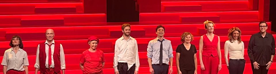 Det är sällan man ser en musikal med så många och ovanliga ord i texterna. Det är väl nästa bara Hamilton som slår den här i att vara så ordrik. Ibland vet jag inte om jag skrattar åt det dråpliga i deras resonemang och beteende eller åt de udda ordvalen som överraskar. Men en hel del skratt blir det, särskilt i första halvan som utspelas i partilokalen. När scen vrids till en röd scentrappa och det ska göras underhållning av partiet tappar det konstigt nog lite i fart. På nåt sätt har man då vant sig vid formen på musikalen och då blir det nästa för mycket ord och ibland dränkts sången av musiken och då kommer inte riktigt budskapet fram. Däremot är det riktigt snyggt att man högst upp på scentrappan ser orkestern under ledning av Carina E Nilsson.