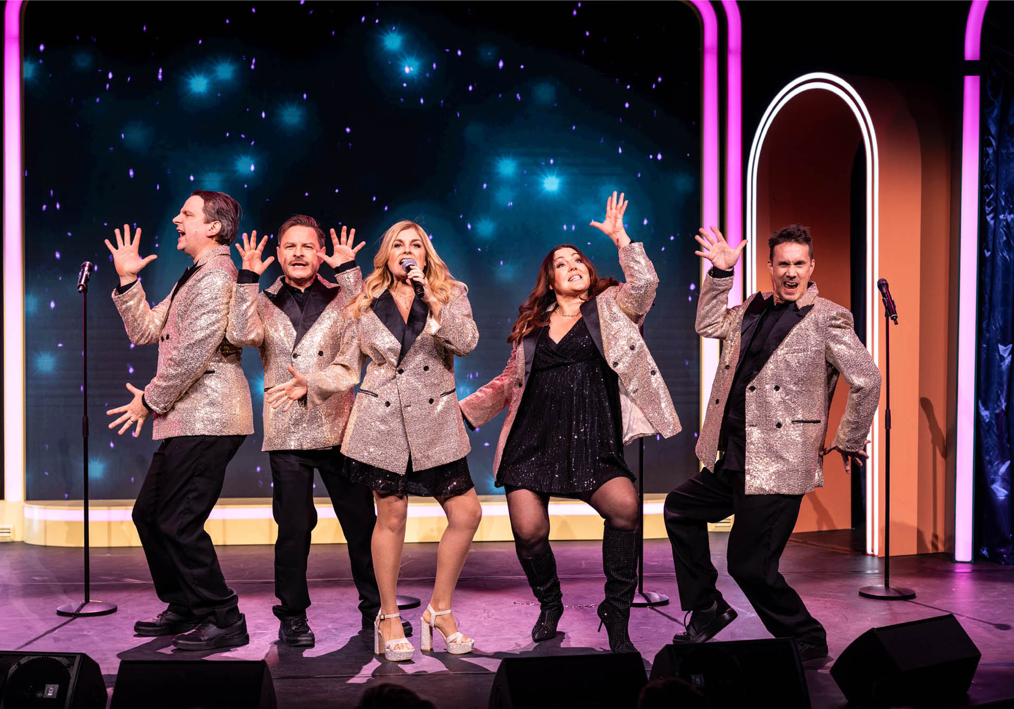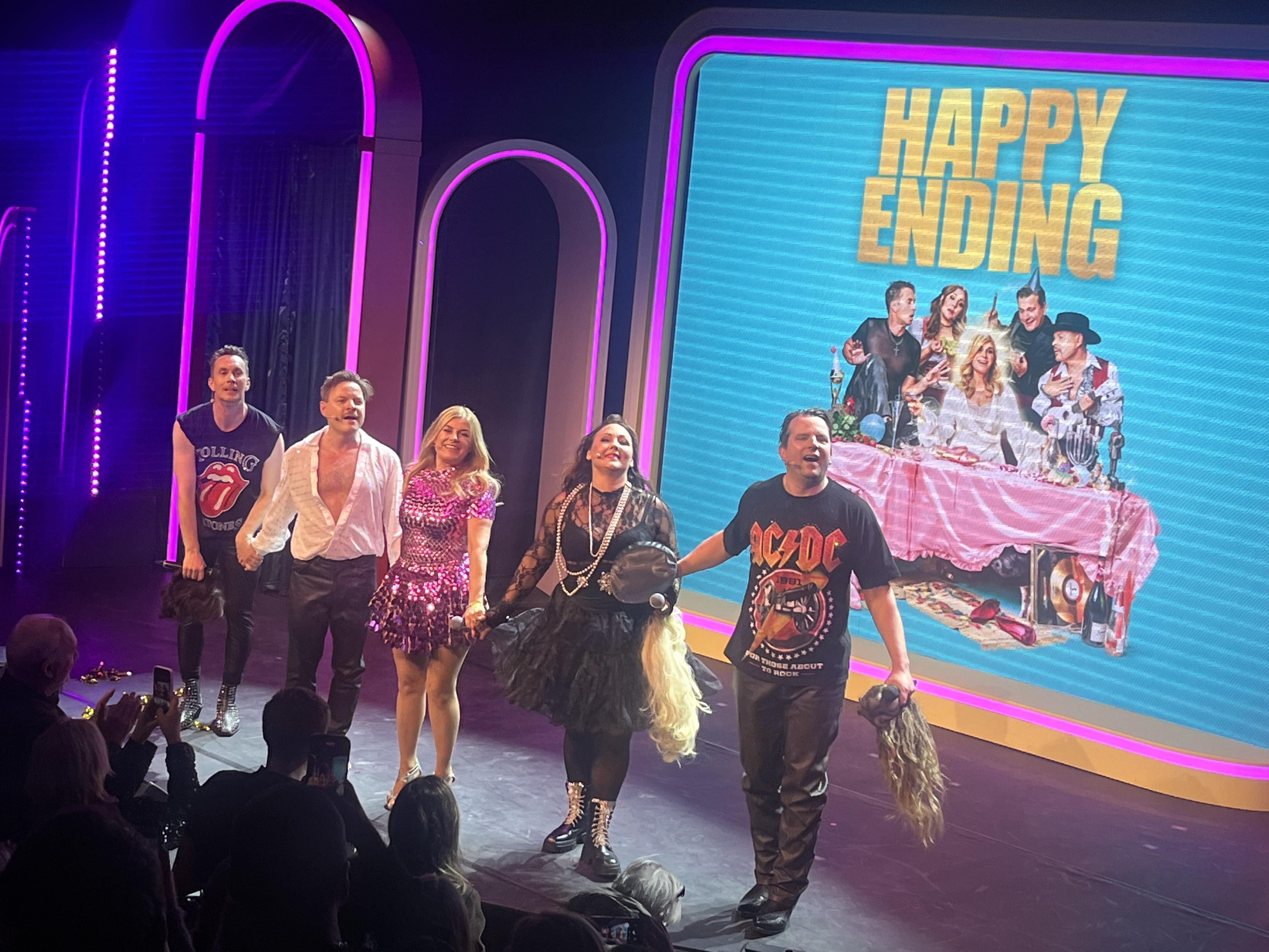 I somras tog Pernilla över programledarrollen på Allsång på Skansen och helt genialiskt inledes showen med att hela publiken står upp och sjunger allsång till en nyskriven text på Stockholm i mitt hjärta. En text full med humor, självironi och hjärta vilket är signumet för den här och de andra showerna. Sen blir det glitter och glamour när Pernillas dröm att ta sig an världen och de stora scenerna, Wembley, Broadway, Las Vegas – ja ingen scen är för stor för den stora stjärnan Pernilla. De andra, Hanna Hedlund, Kim Sulocki, Ola Forssmed och Måns Nathanaelson, är lite mer tveksamma men dras med i det men först ska de klara av den här avskedsshowen som ska blir den sista i Sverige och som inte får går fel. Det här gänget är mästerliga på att leverera sin repliker och Kims och Olas kroppsspråk är så sjukt roligt i den här föreställningen. Fingertoppskänslan när skämten ska avslutas sitter perfekt rakt igenom, det märks att mästerregissörens Edward af Silléns har ett finger med i spelet. Samspelet kunde inte varit bättre och alla tillåts att ta plats.