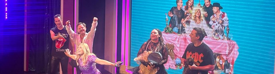 I somras tog Pernilla över programledarrollen på Allsång på Skansen och helt genialiskt inledes showen med att hela publiken står upp och sjunger allsång till en nyskriven text på Stockholm i mitt hjärta. En text full med humor, självironi och hjärta vilket är signumet för den här och de andra showerna. Sen blir det glitter och glamour när Pernillas dröm att ta sig an världen och de stora scenerna, Wembley, Broadway, Las Vegas – ja ingen scen är för stor för den stora stjärnan Pernilla. De andra, Hanna Hedlund, Kim Sulocki, Ola Forssmed och Måns Nathanaelson, är lite mer tveksamma men dras med i det men först ska de klara av den här avskedsshowen som ska blir den sista i Sverige och som inte får går fel. Det här gänget är mästerliga på att leverera sin repliker och Kims och Olas kroppsspråk är så sjukt roligt i den här föreställningen. Fingertoppskänslan när skämten ska avslutas sitter perfekt rakt igenom, det märks att mästerregissörens Edward af Silléns har ett finger med i spelet. Samspelet kunde inte varit bättre och alla tillåts att ta plats.
