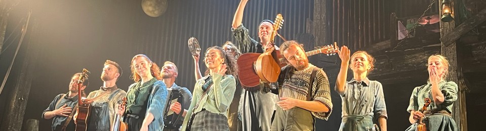 Musikalen bygger på Scott Fitzgeralds bok om Benjamin Button som föds när det är fullmånen och tidvattnet går åt fel håll – så på nåt sätt föds Benjamin som en gammal man och blir yngre och yngre tills han är en bebis. Musiken är skriven av Darren Clark och ger en irländsk känsla. Musiken framförs av musiker/artist/ensemblen på 13 personer. I stort sett är de på scen hela tiden och spelar och agerar i olika roller. Fartfyllt, glatt men också känsligt på rätt ställen. Ensemblen är helt fantastisk och utstrålar så mycket energi. Här år det samma scenografi hela tiden som får utgöra vind, pub, båt mm och justeras bara med lite trälådor då och då – men ger rätt känsla och inramning till handlingen. Det behövs inte massa effekter eller konfetti för att imponera. Det är det magiska med musikal – musikaler kan vara så olika, men som publik kan man älska dem alla.