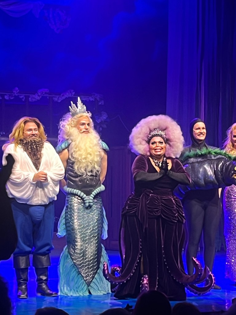 Väldigt imponerad av Stefan Clarin som även han var en stark röst. Julia Küster är underbar som en rätt korkad komisk Ariel. Hennes minspel är helt underbart när hon hamnar i prinsen kök och den franska kocken Colette (Moa Eklöf) sjunger om de olika underbara fiskar hon ska tillaga.