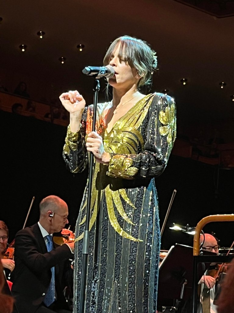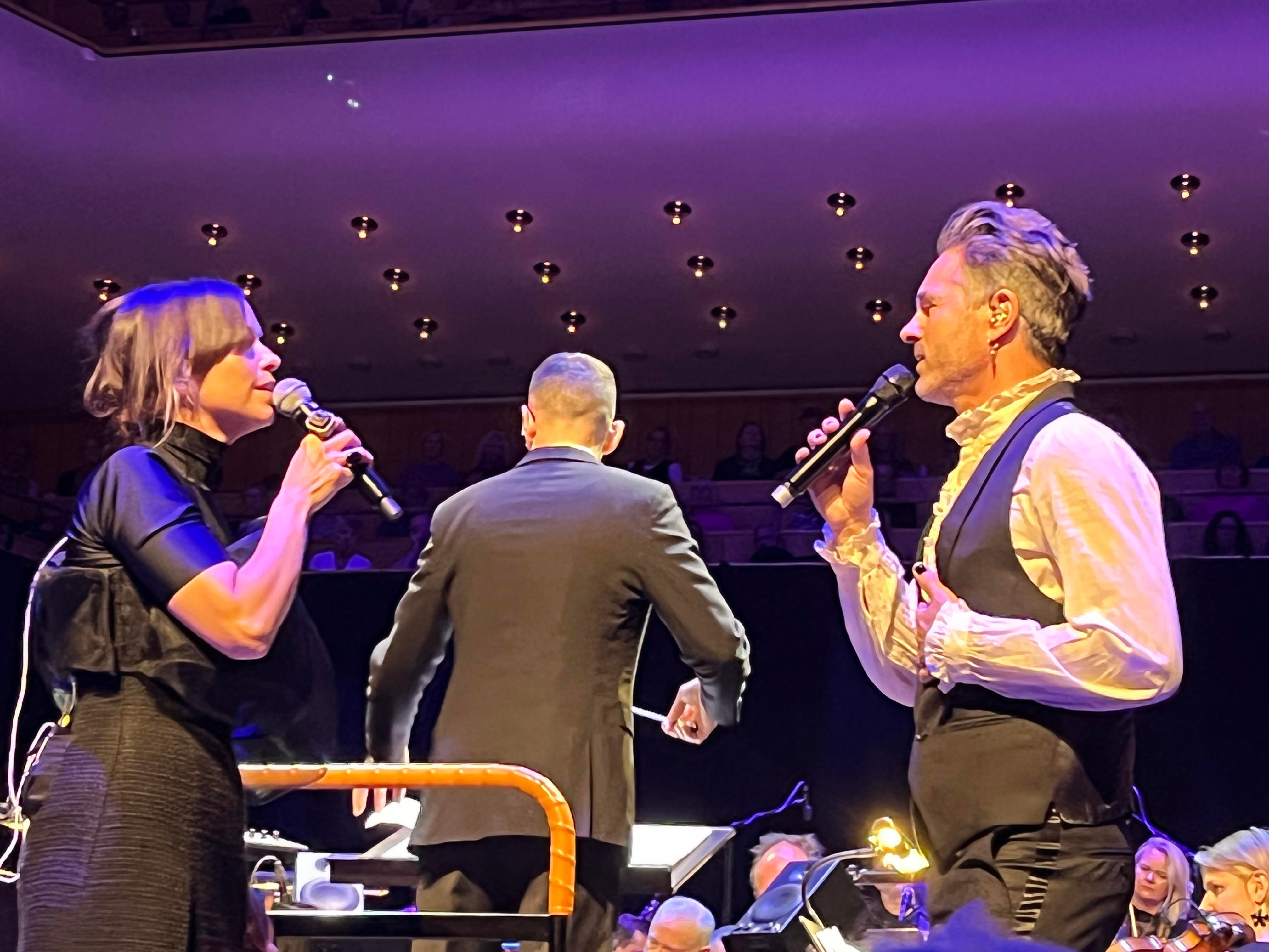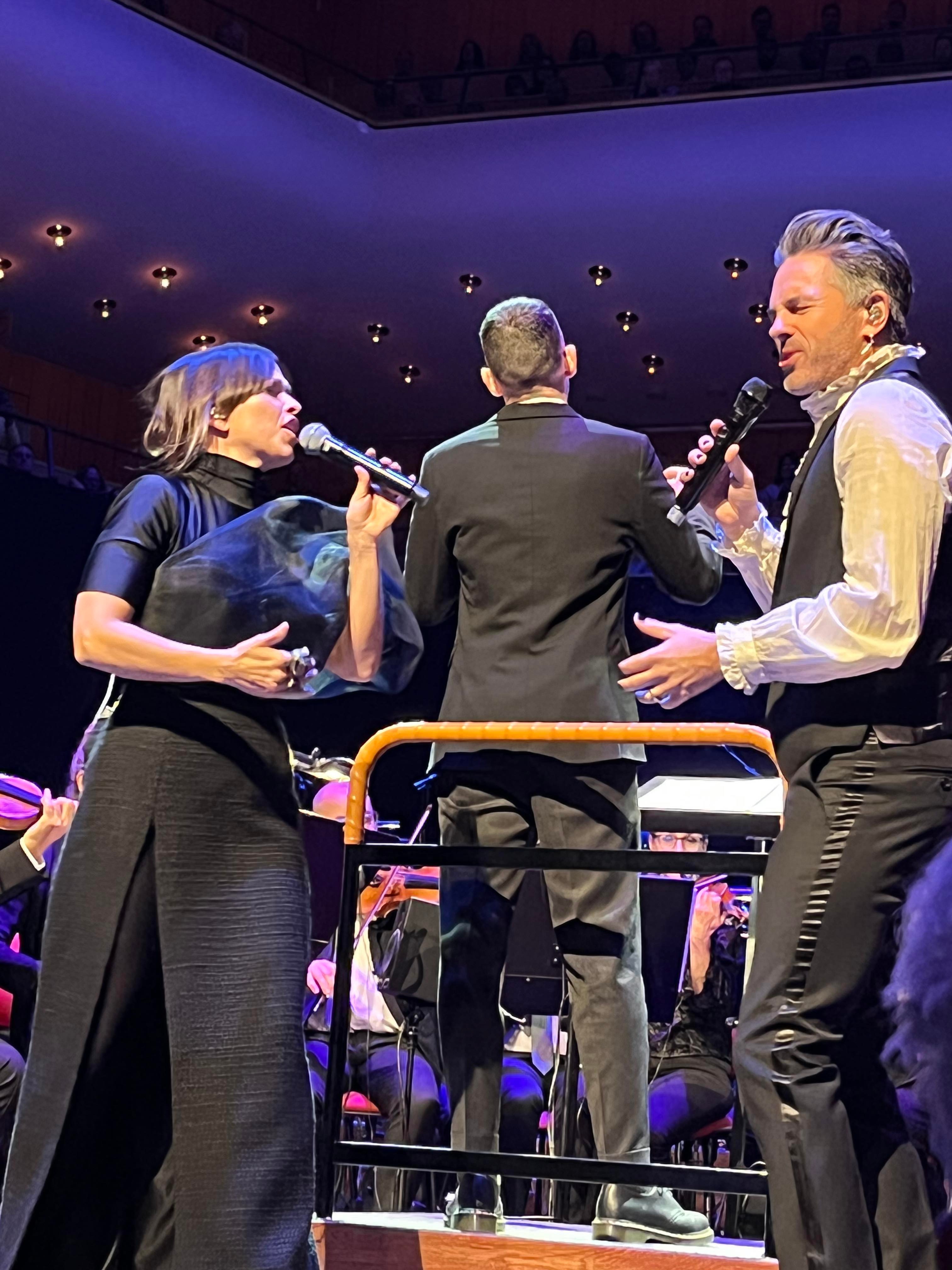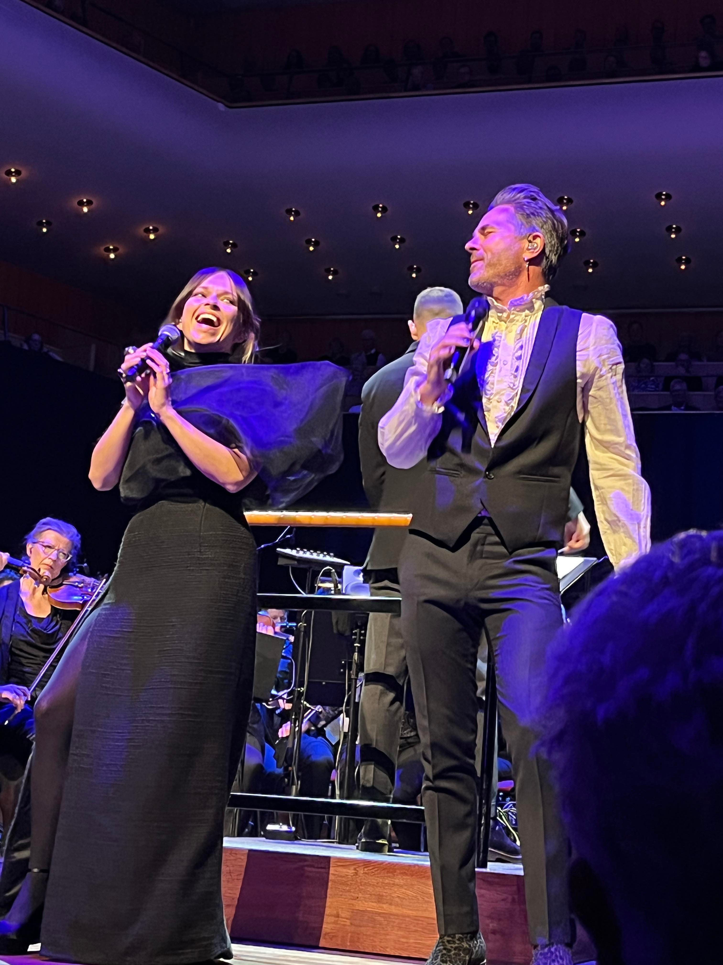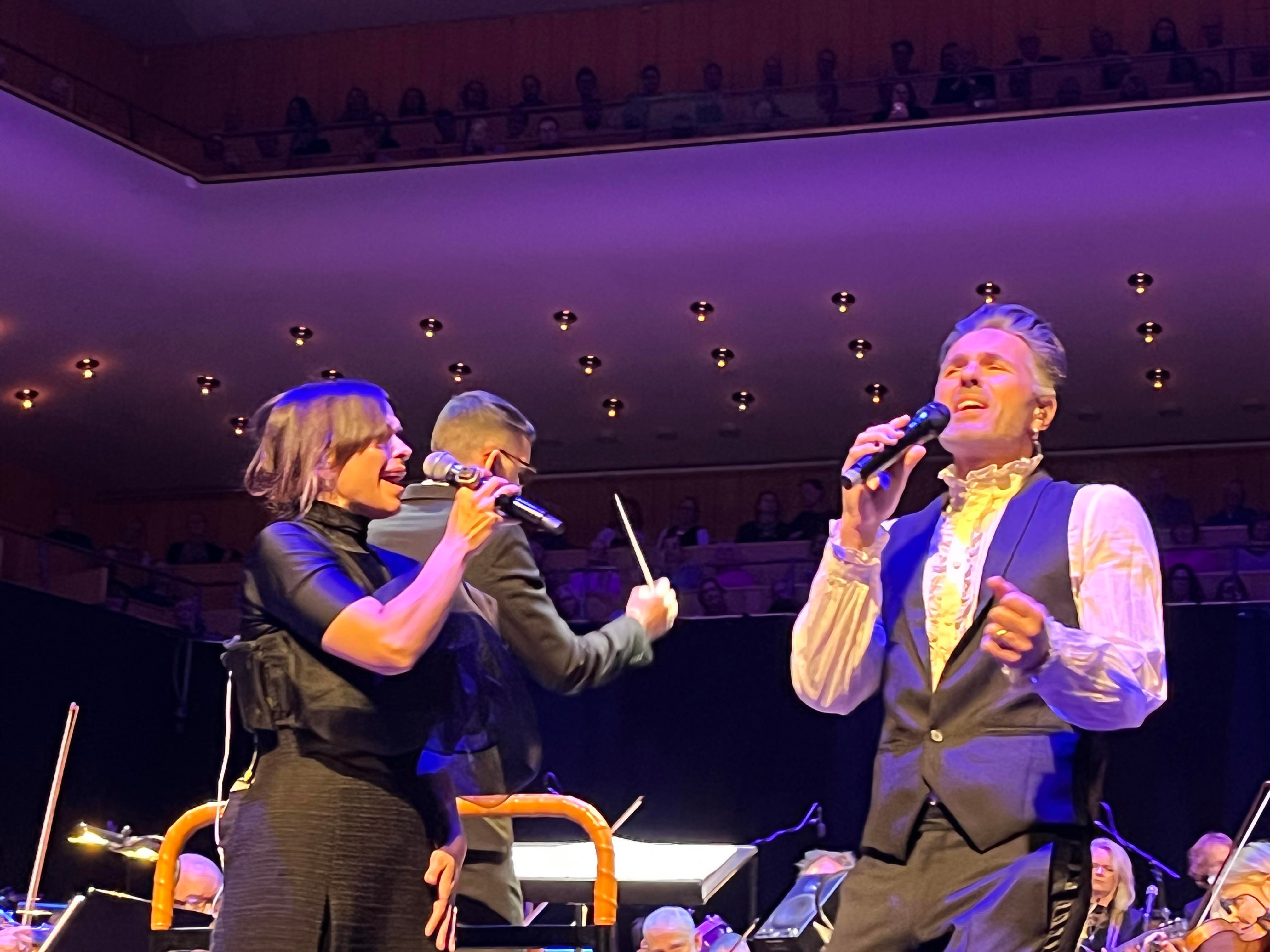 En underbar överraskning och bonus och sen var det verkligen Feeling Good resten av konserten fylld av klassiker och lite nytt. Joachim Bergström gick all in i Mack the Knife och Rennie Mirro släppte som vanligt loss i I Got Rythm. Kvällens gästartist Sarah Dawn Finer förvirrade kvällens dirigent Jonas Nydesjö med sitt inledningssnack när hon pratade om Alla Hjärtans Dag kort innan hon knyter ihop det och hon bjuder på en härlig tolkning av Perhaps, Perhaps, Perhaps med glimten i ögat. Tätt följd av hennes underbara Kärleksvisan. När hon sjunger den så håller man andan och bara njuter av varje ton. Första akten avslutas med Me and my shadow med Joachim och Rennie, en perfekt låt för dem för de är så samsjungna, en given enhet de liksom sitter ihop. I andra akten fortsätter de att sjunga tillsammans i Fine and dandy och Fever som de gör så strålande bra tillsammans.