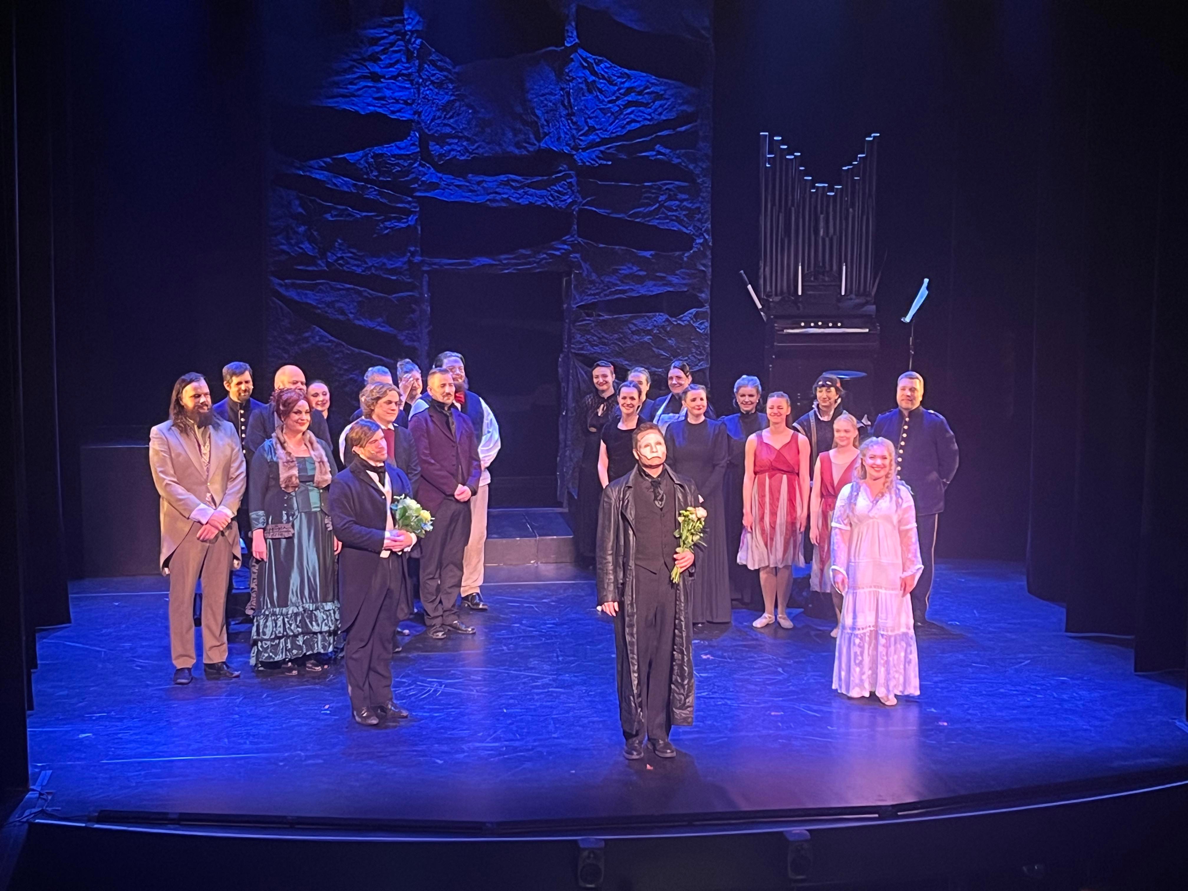 Här har man fått hitta egna lösningar för det är en mindre scen än den vanligtvis spelas på och det går inte att göra samma tekniska lösningar. Budgeten finns inte där heller för det. Men det gör att musikalen i sig kommer fram på ett helt annat sätt, man förtrollas inte av kandelabrar som kommer upp ur golvet, en gondol som glider fram i dimman eller en utsmyckad stor elefant utan här förtrollas man av John Martin Bengtsson (Fantomen), Hanna Ulvan (Christine), Sebastian Lamberth (Raoul), Anna Hammarqvist (Charlotta) och de andra på scenen och musikerna i orkesterdiket under ledning av den makalösa Julian Bigg. Flertalet på scenen har andra jobb men tillsammans på scenen lyfter de varandra och blir fullfjädrade musikalartister. John Martin har en röst som är så perfekt och han har en enorm inlevelse i sin tolkning av Fantomen,absolut en av de bästa jag har sett. Hanna Ulvans ljuva röst förtrollar oss alla i publiken.
