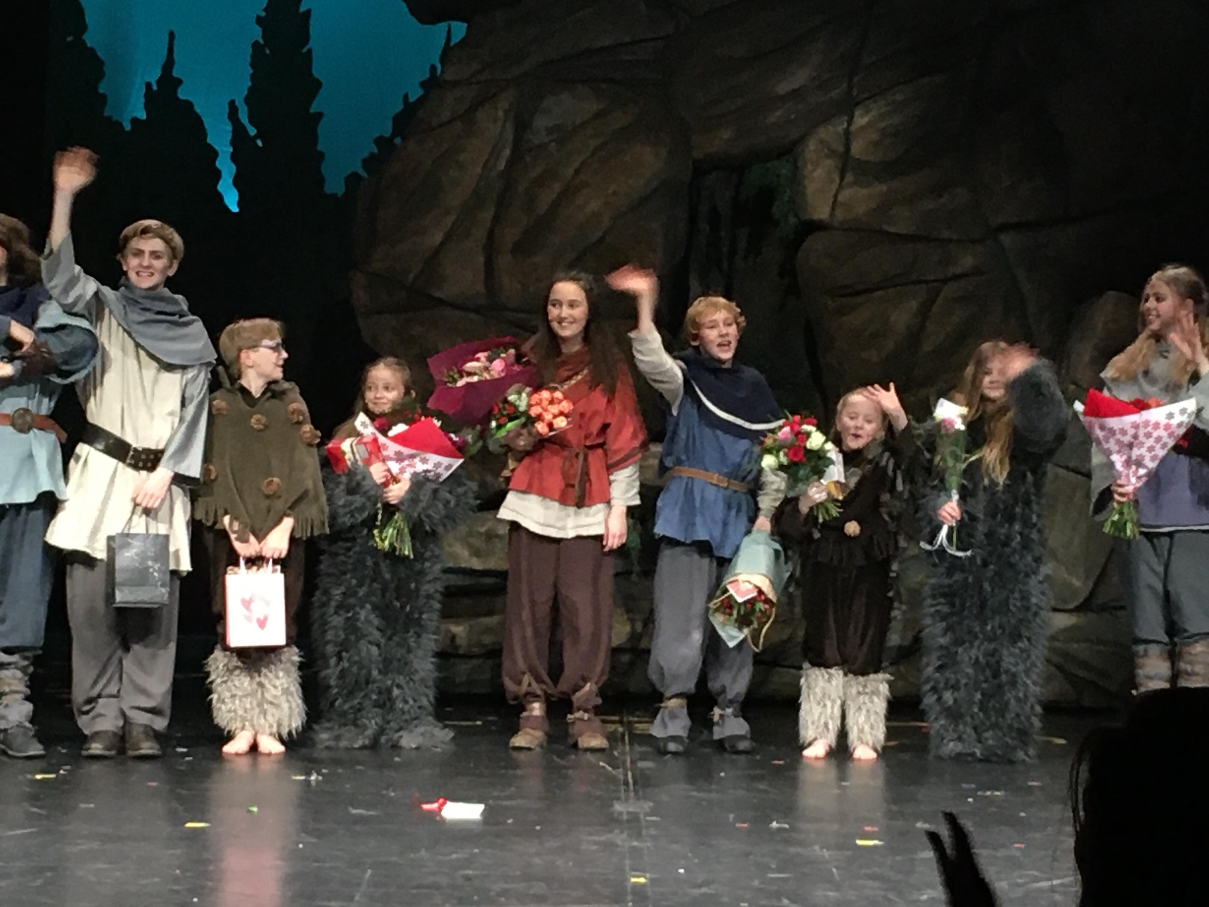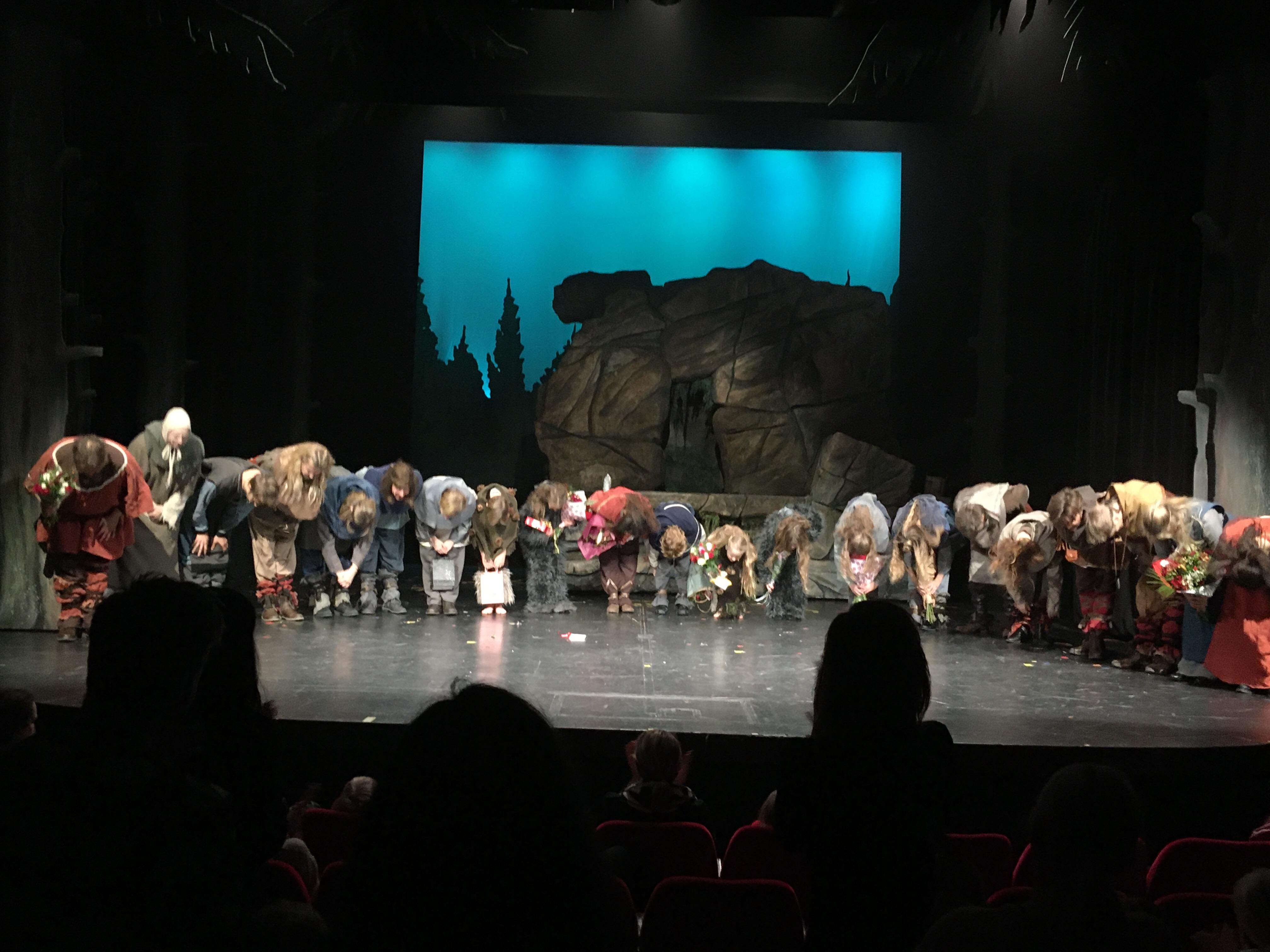 Ronja är delvis en lite mörk och skrämmande berättelse med de otäcka väsen som vildvittror, grådvärgar och de mer charmiga rumpnissarna. Med Caroline Erikssons fina kostymer blir de levande och kan nog vara lite skrämmande för de yngsta i publiken.