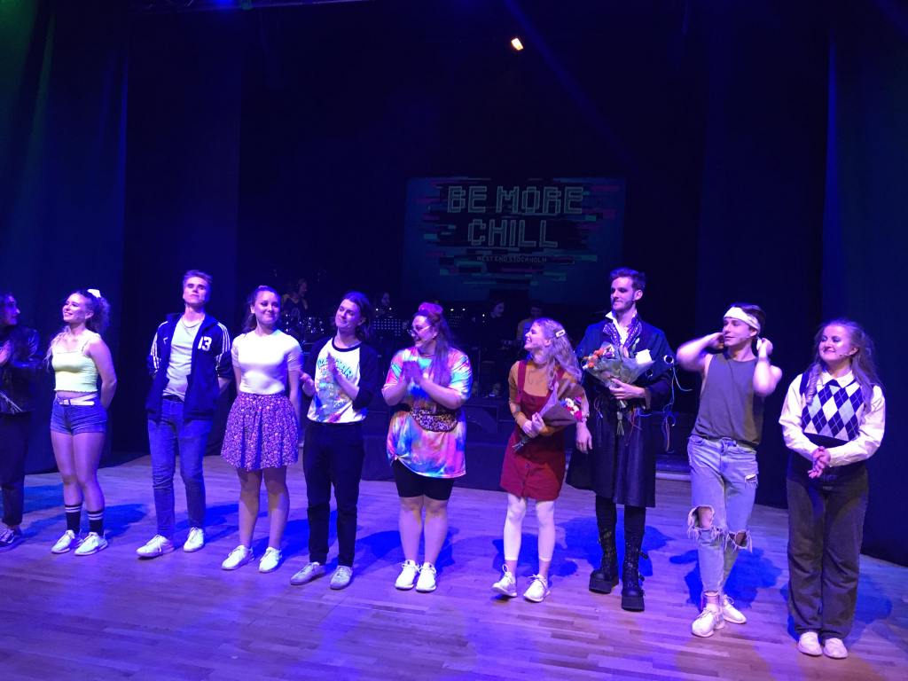 Be more chill är en rätt ny musikal från 2015 av Joe Iconis och Joe Tracz som jag inte sett förut. Handlingen är som en härlig feelgood high school film där den töntiga killen Jeremy (Benjamin Sundström), har en lika töntig sidekick, Michael (Gabriel Johansson), blir kär i Christine (Josefine Kuniholm), en av skolans snyggaste tjejer, genomgår en förvandling, blir accepterade av det coola gänget, får tjejen och på slutet inser att det viktiga är ju inte att vara cool utan att vara sig själv. Här sker förvandlingen genom att Jeremy sväljer en liten superdator, en Squip (Samuel Niklasson) som talar om för honom vad han ska säga och styr hans handlingar. En intressant tvist att det finns en underton av kritik till att vi styrs alltmer av högteknologi.