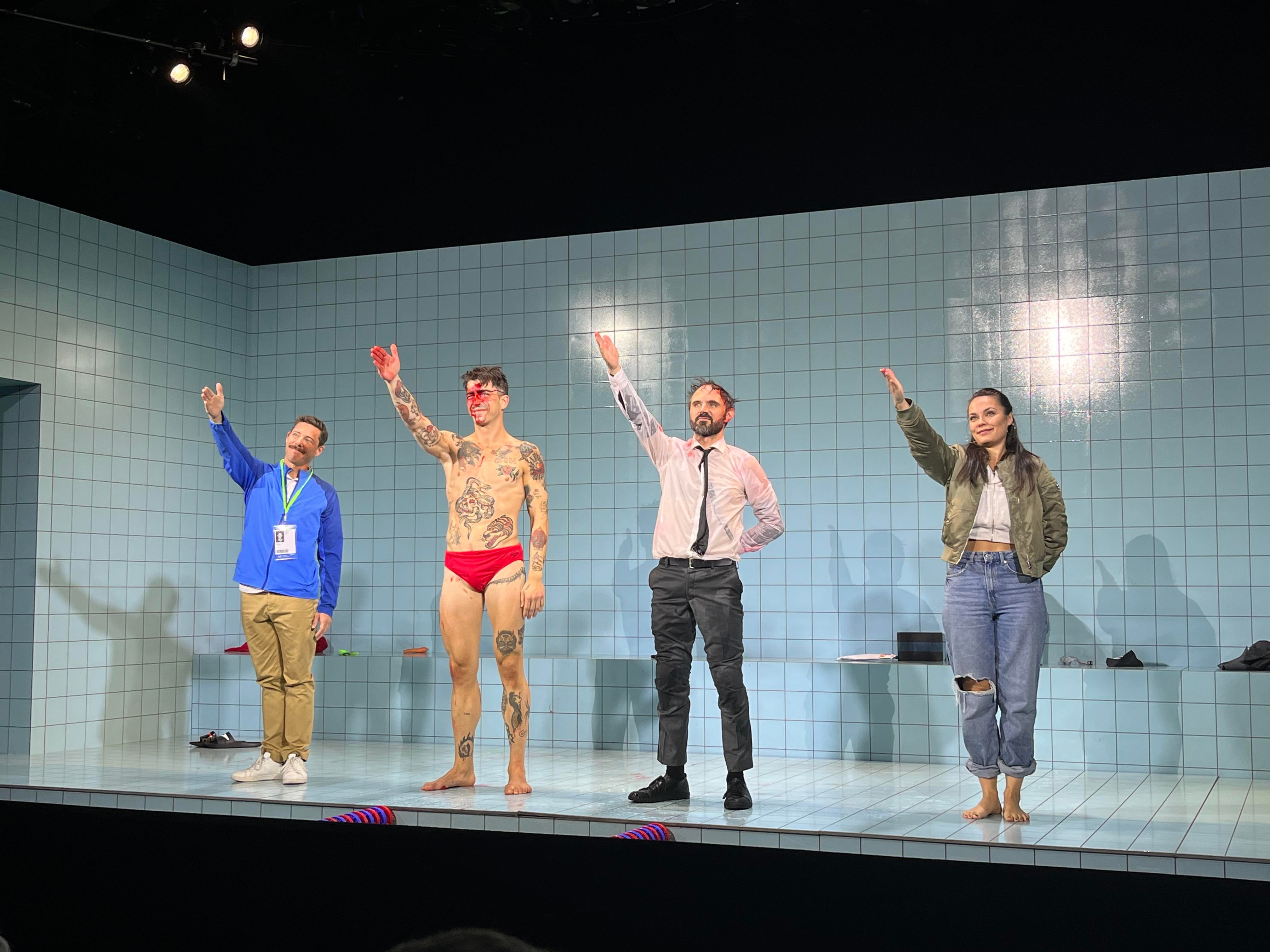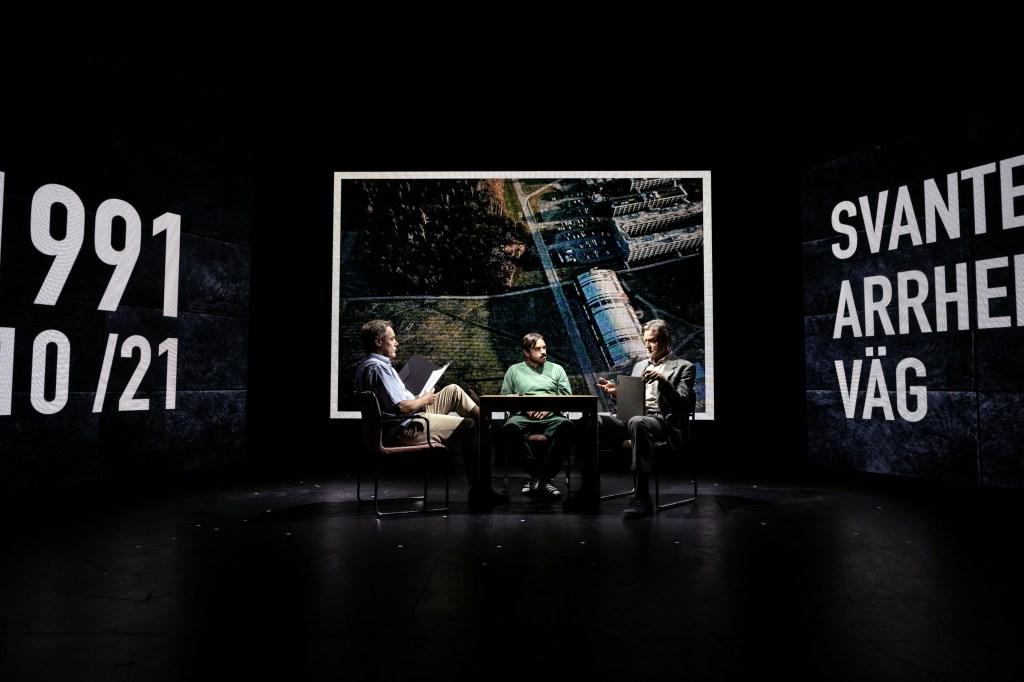 Ausonius spelas av Joel Spira och hans ord under förhören är Ausonisus ordagrant, vilket skapar en stark känsla av autenticitet. Förhörsledarna (Mattias Knave och Henrik Norman) är oerhört tålmodiga när de förhör en ständigt slingrande och ordvrängande Ausonius. Det är välspelat och intressant, men tempot långsamt och det bränner inte till. I första akten finns en viss nerv som avtar efter pausen. I längden är det inte så fascinerande att se hur Ausonius slingrar sig, hur skickligt Spira än är i sin tolkning. Förhören varvas med inspelade expertutlåtande av Carl Bildt, Jan ”supersnuten” Olsson och Gellert Tamas och faktamässiga beskrivningar om skjutningarna utan att frossa i själva händelserna. Det gör dock att det blir en distans till de avskyvärda handlingarna, vilket är syftet då fokus ska vara på själva förhöret. Under delar av föreställningen spelas bakgrundsmusik, som dessvärre är mer sövande än stämningsbyggande. För att bibehålla nerven hade pjäsen tjänat på att vara en enaktare.