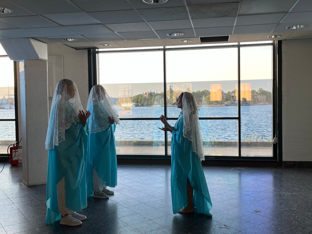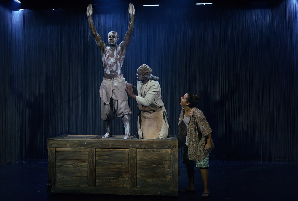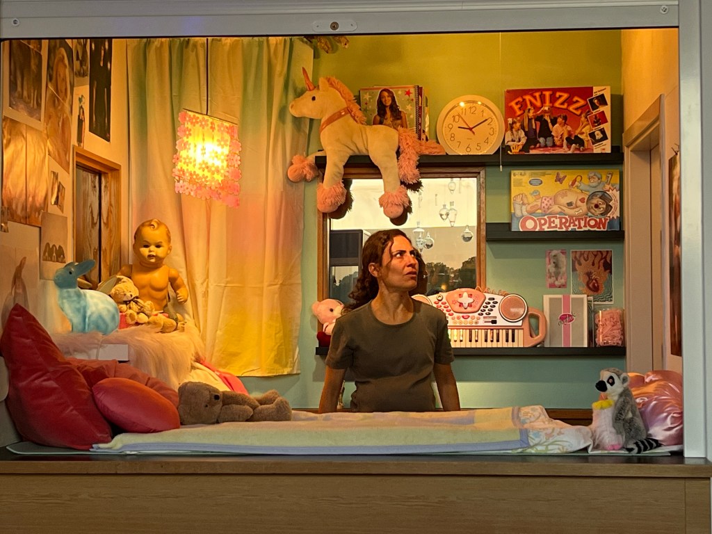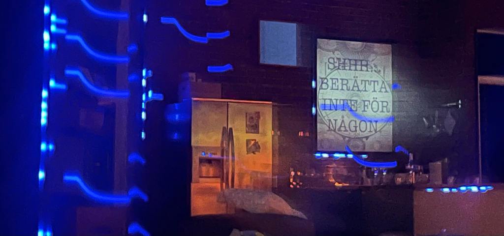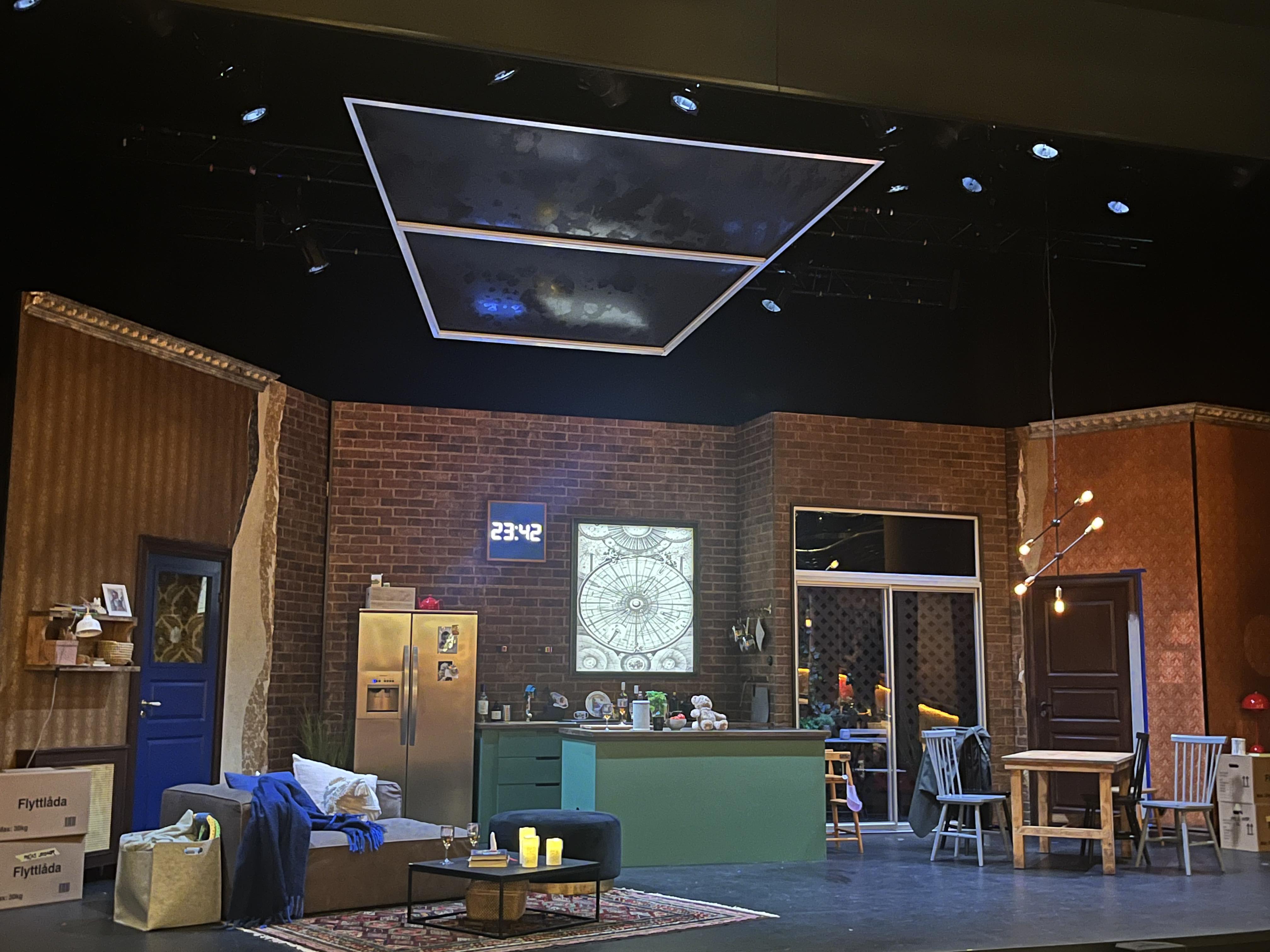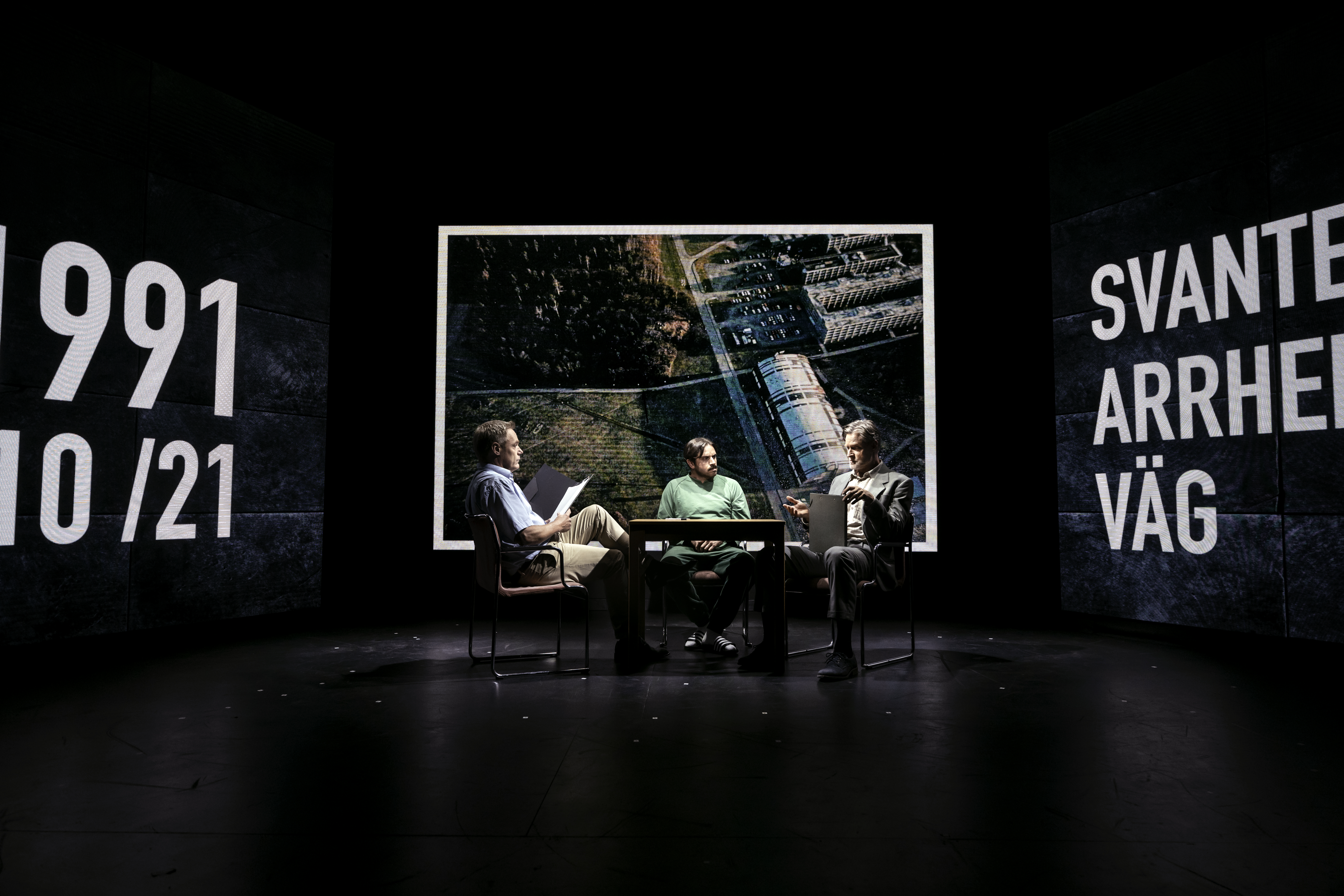 Scenografin är avskalad, tre stolar och ett bord som flyttas runt för att ändra stämningen och byta perspektiv i rummet. En gråaktig projicering av rummets väggar ger en avskalad, steril och kall miljö till förhörsrummet.